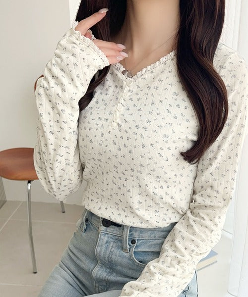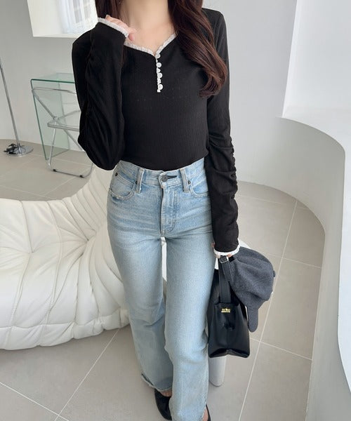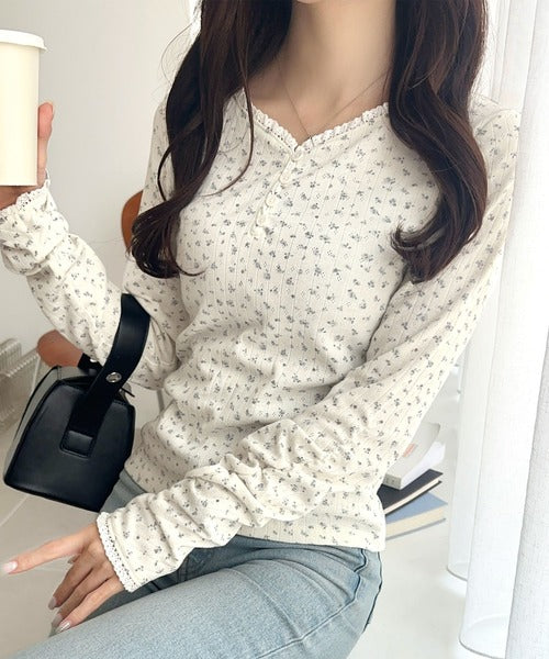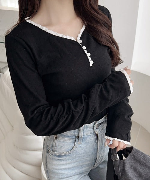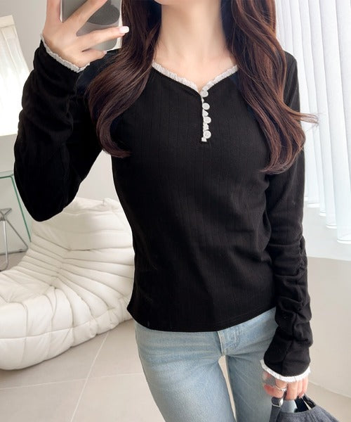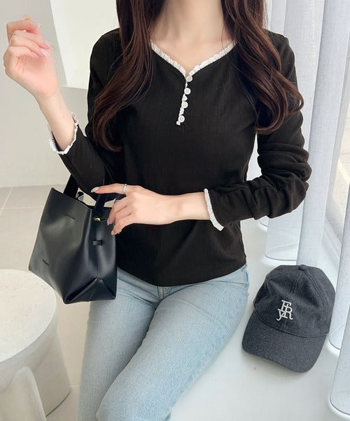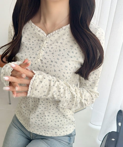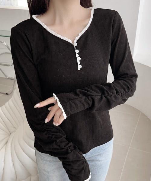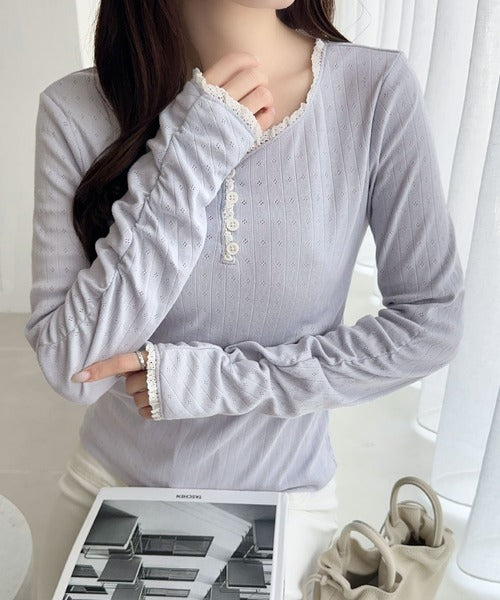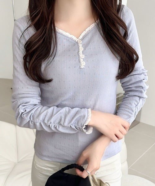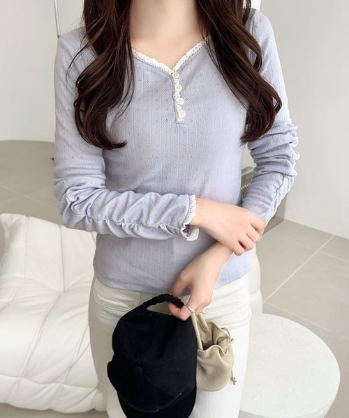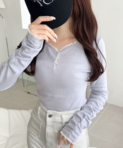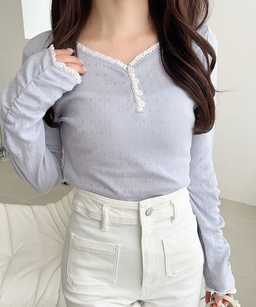 針抜き柄のリブにレース使いが施されたオシャレな長袖トップス♪