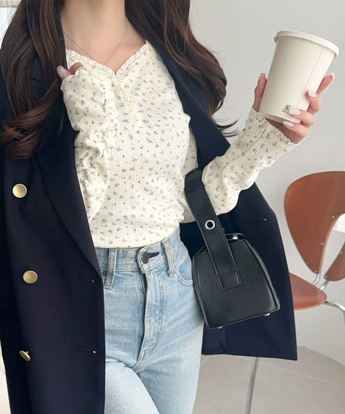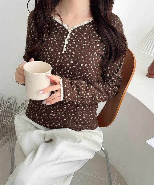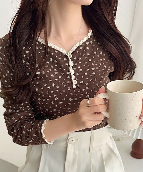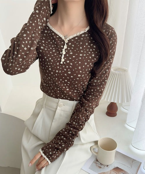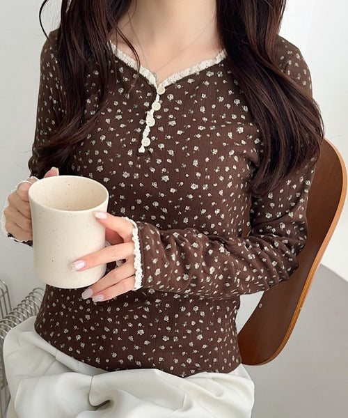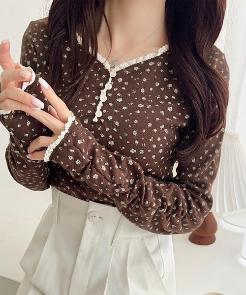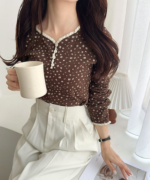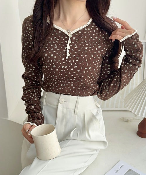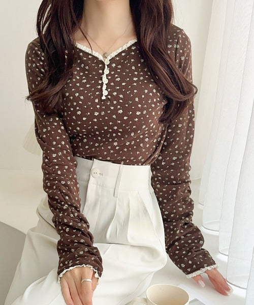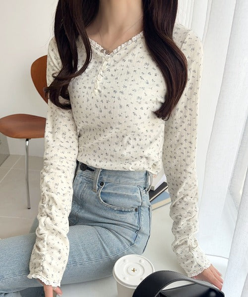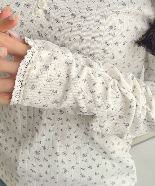 【mily bilet】華やかさと可愛さを1枚で。花柄レース使い袖ギャザーヘンリーカットソー mi1019106