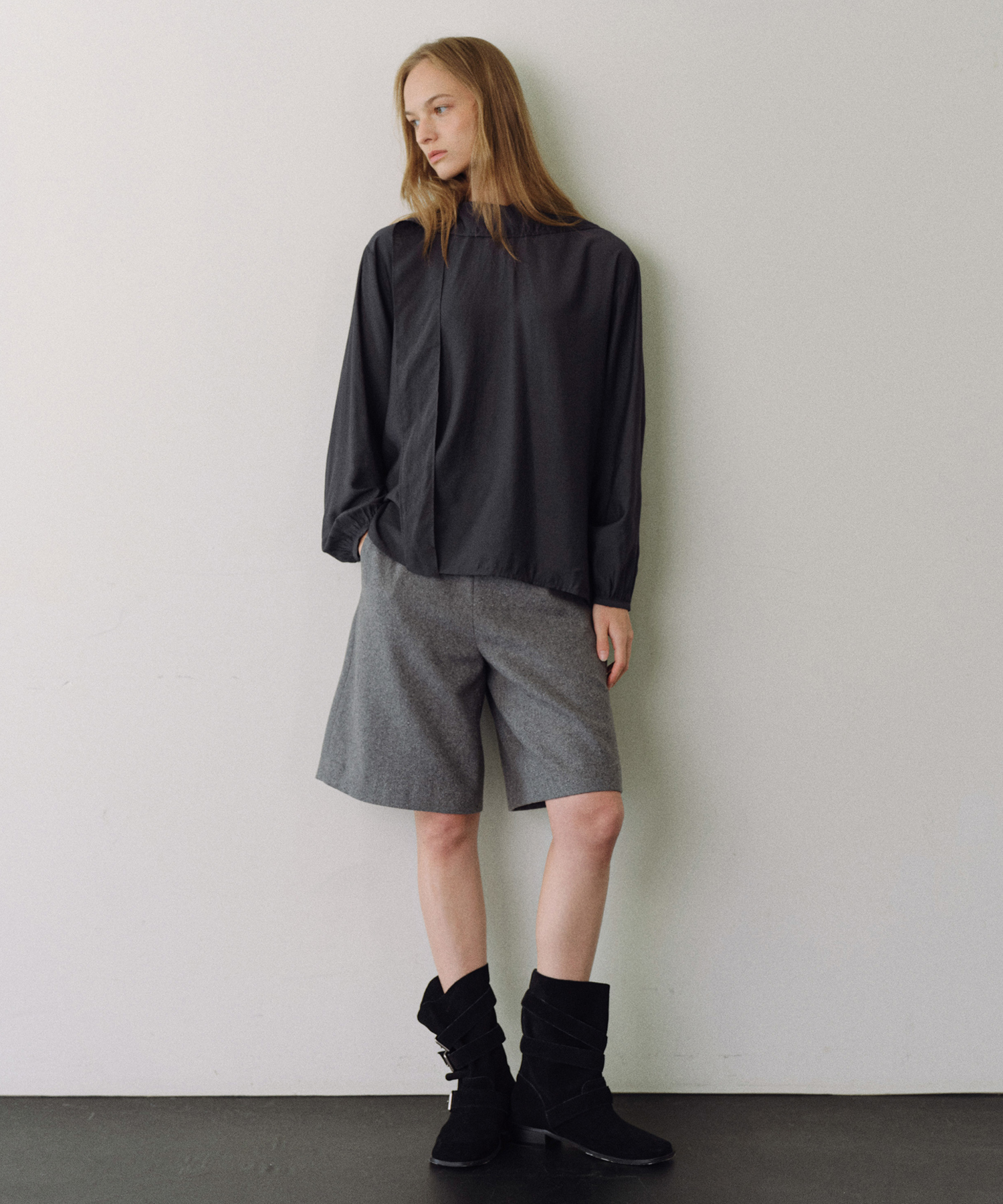 - 膝上で落ちるハーフ丈はブーツとも自然にマッチし、無駄のないミニマルなシルエットがモダンな印象を演出します。