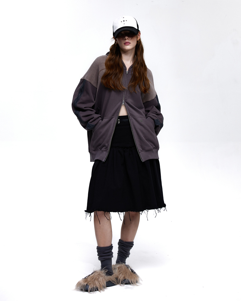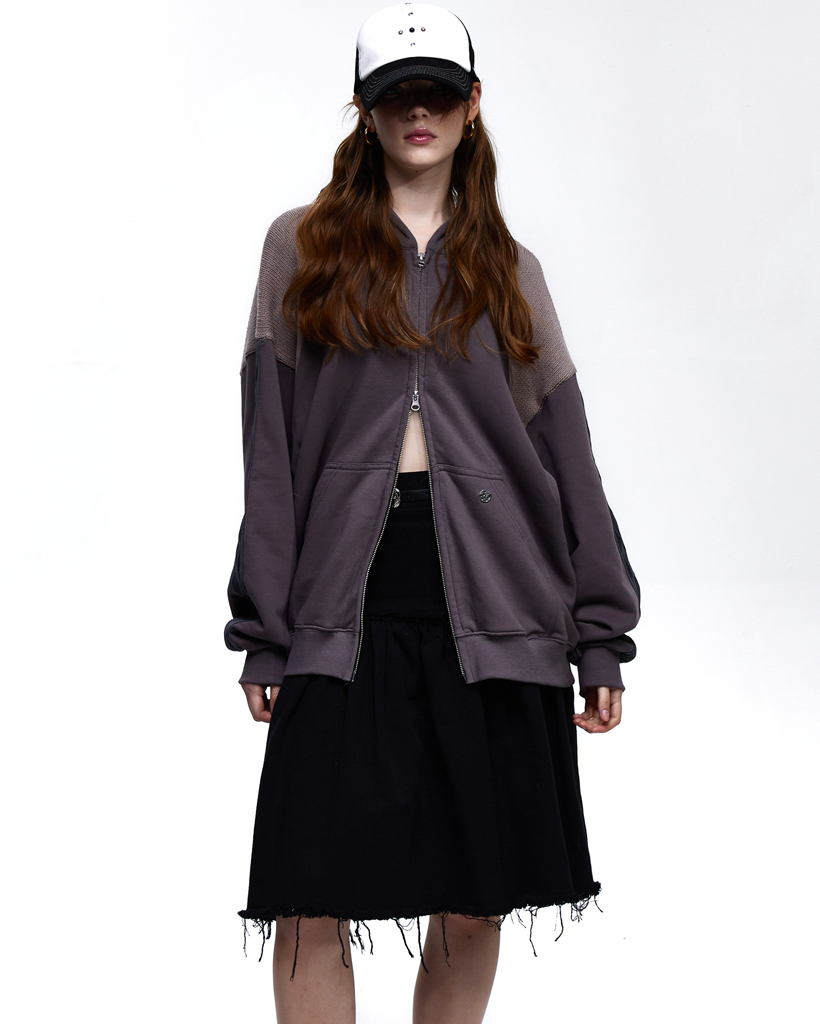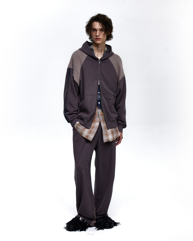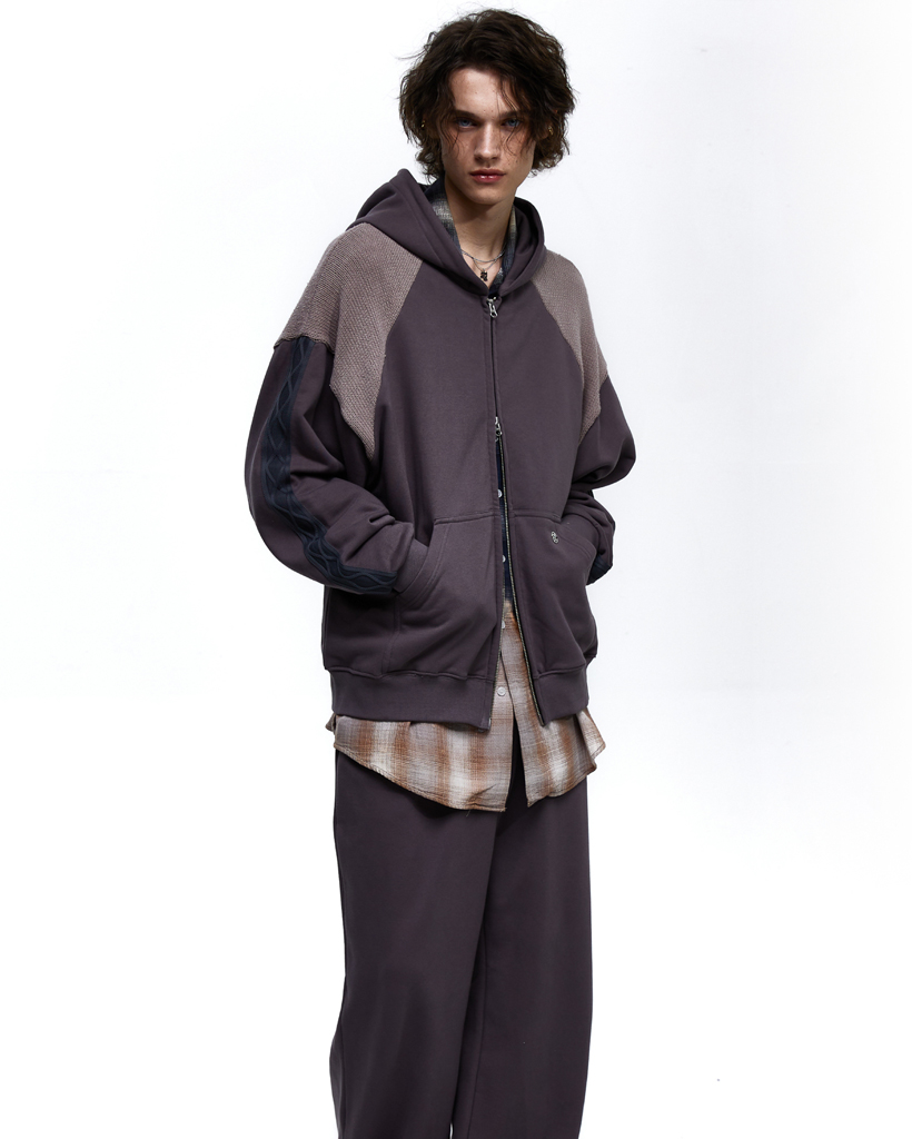 KNIT MIXED HOOD ZIPUP - CHARCOAL