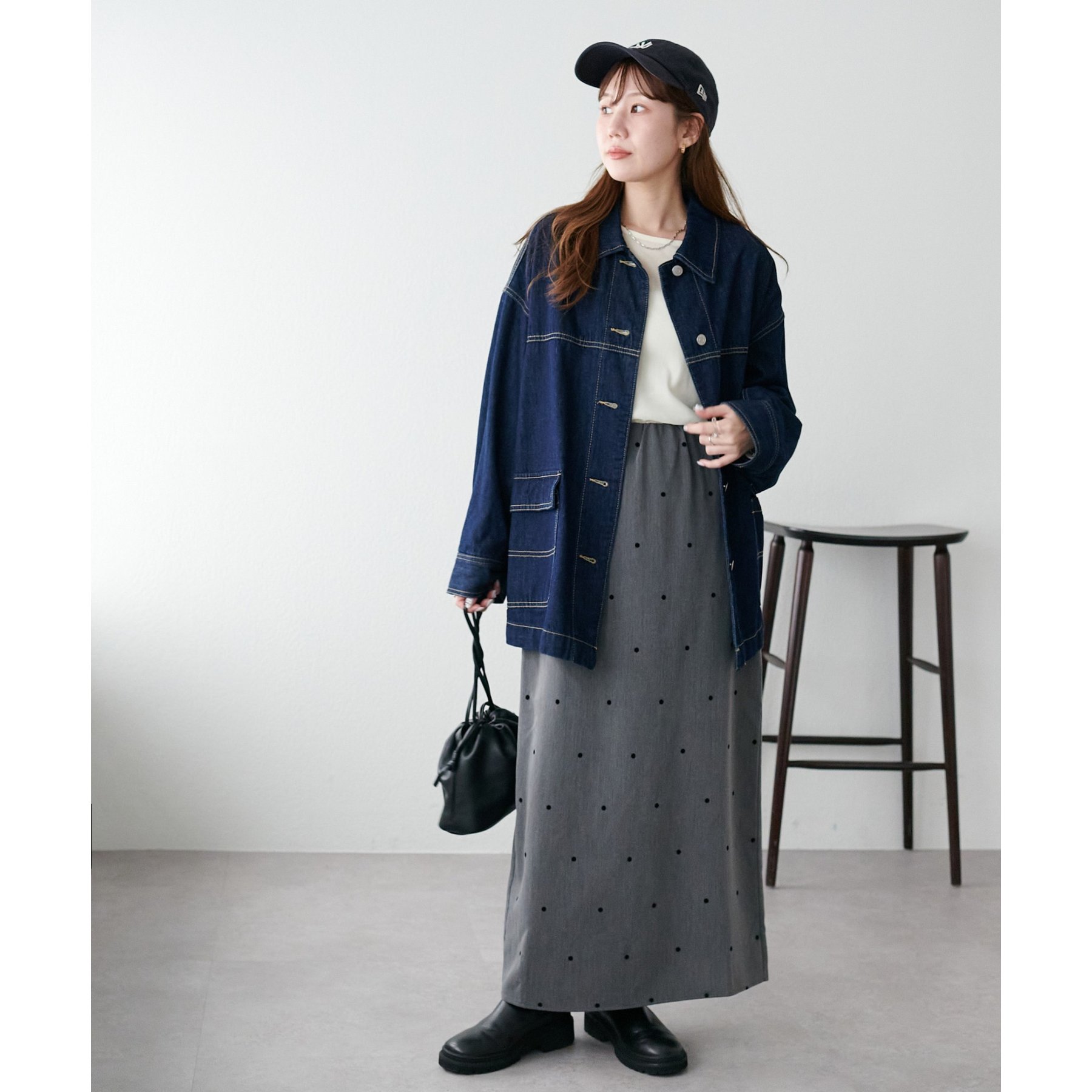 ナロースカートなので、ウエストを見せたコーデはもちろんですがウエストラインを隠したコーデもスッキリと見えます。