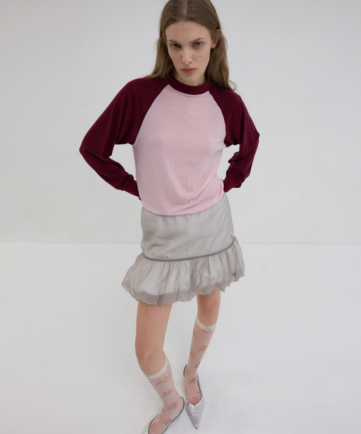 -シルバーグレーのナイロンオーガンジーとオーガニックコットン裏地を組み合わせ、異なる素材を二重にレイヤリングしたミックスマッチデザインです。