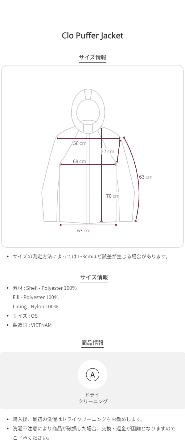 シングルブレスト、フード、ジッパー開閉仕様のパファーフードジャケットタイプです。