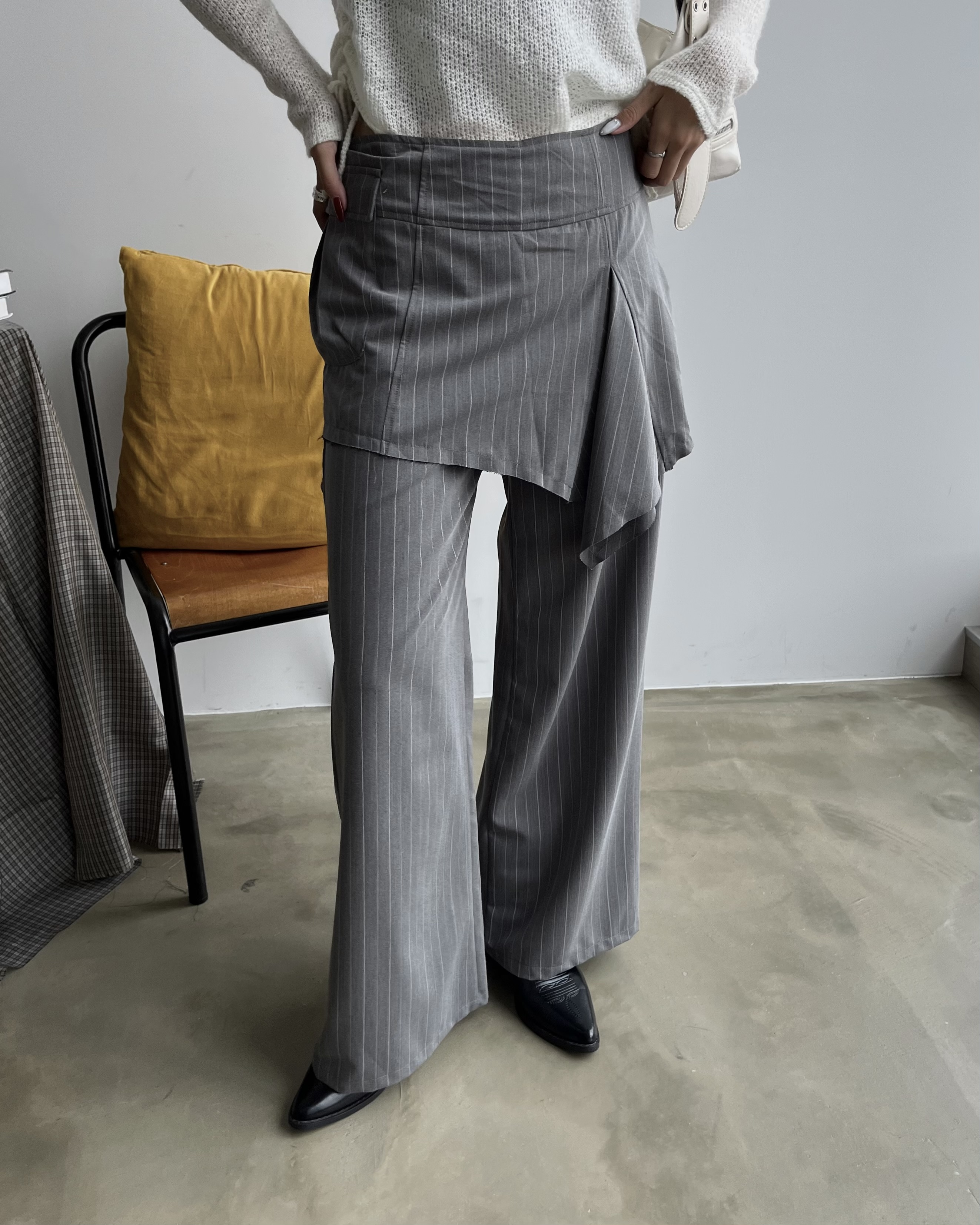 トレンド感溢れるスカート付きピンストライプスラックス◎