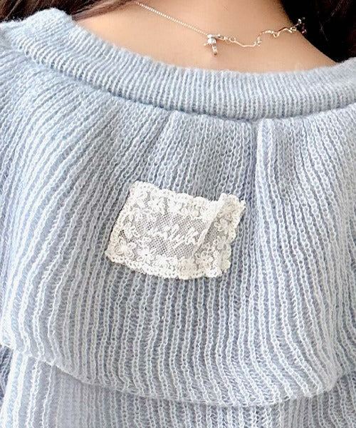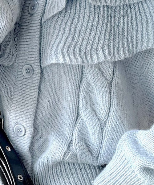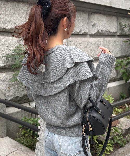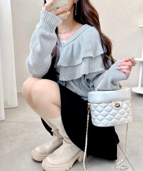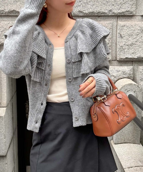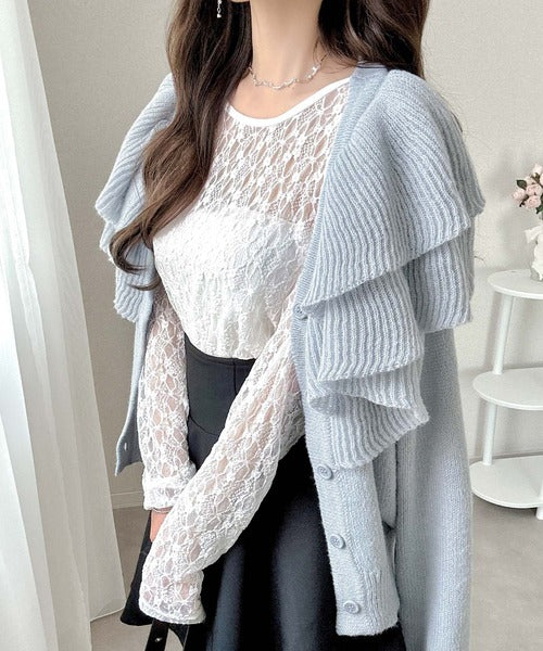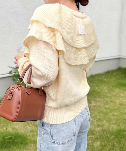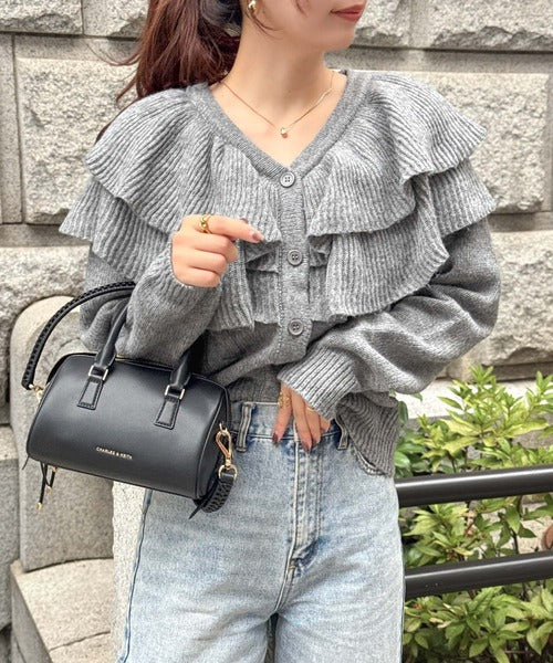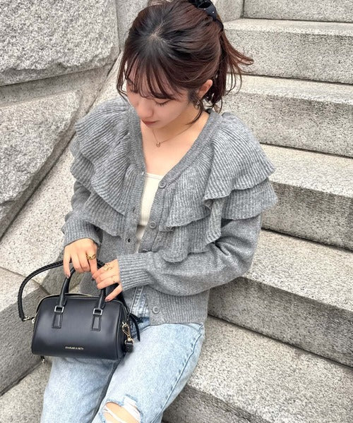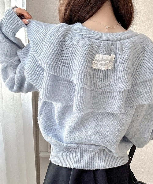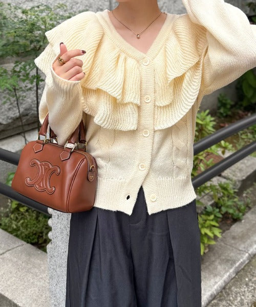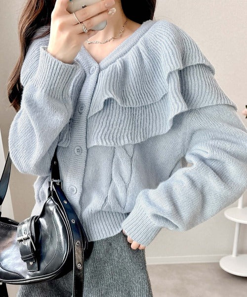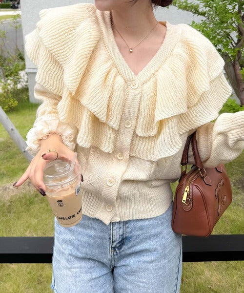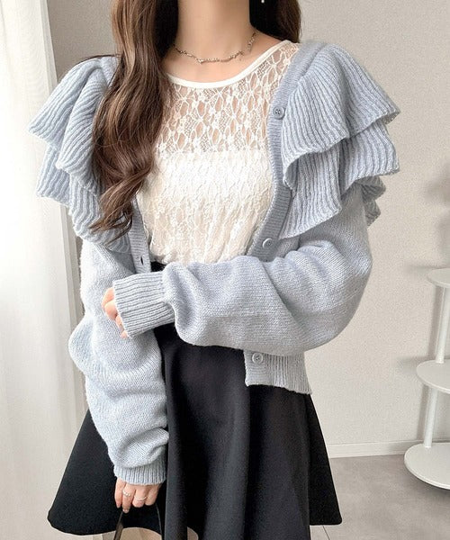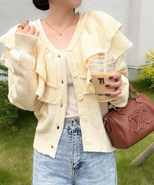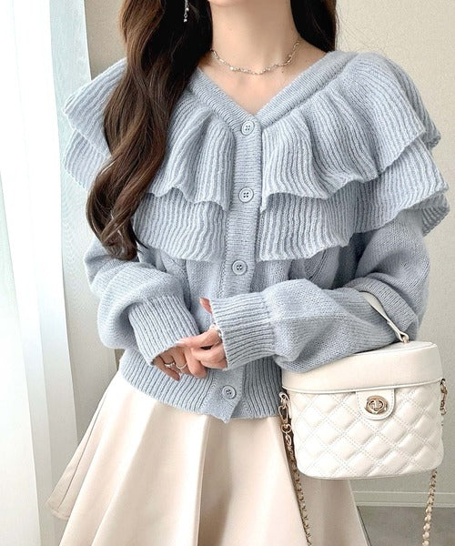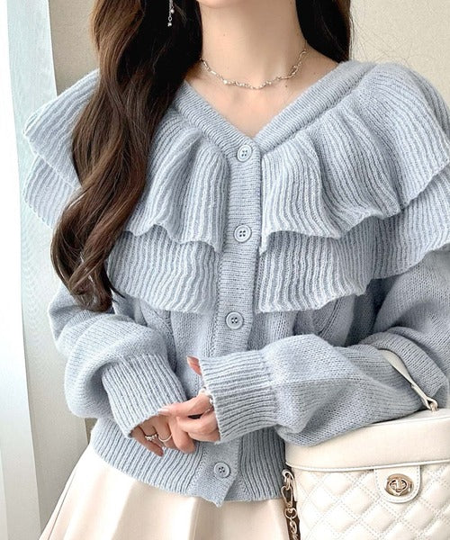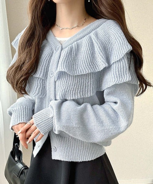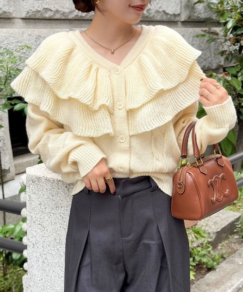 2枚重ねのビッグフリルが特徴のニットカーディガン。