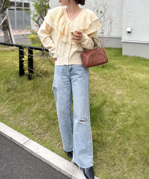 ビッグフリルが目を引くニットカーディガン。