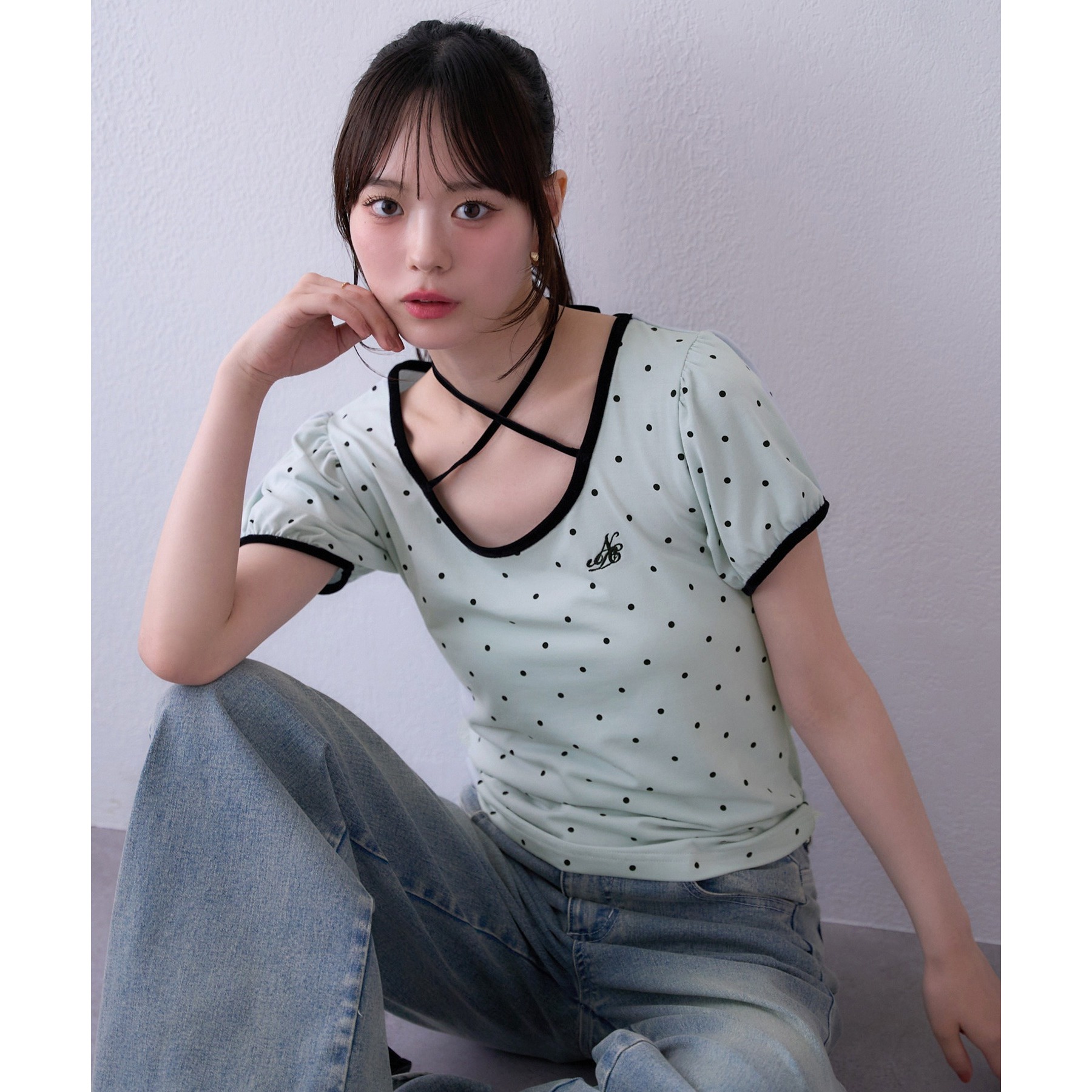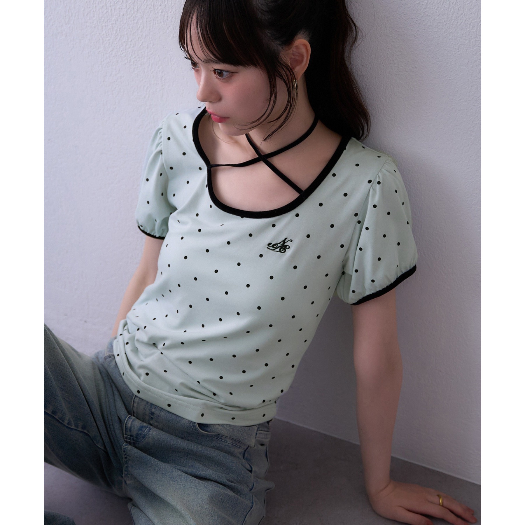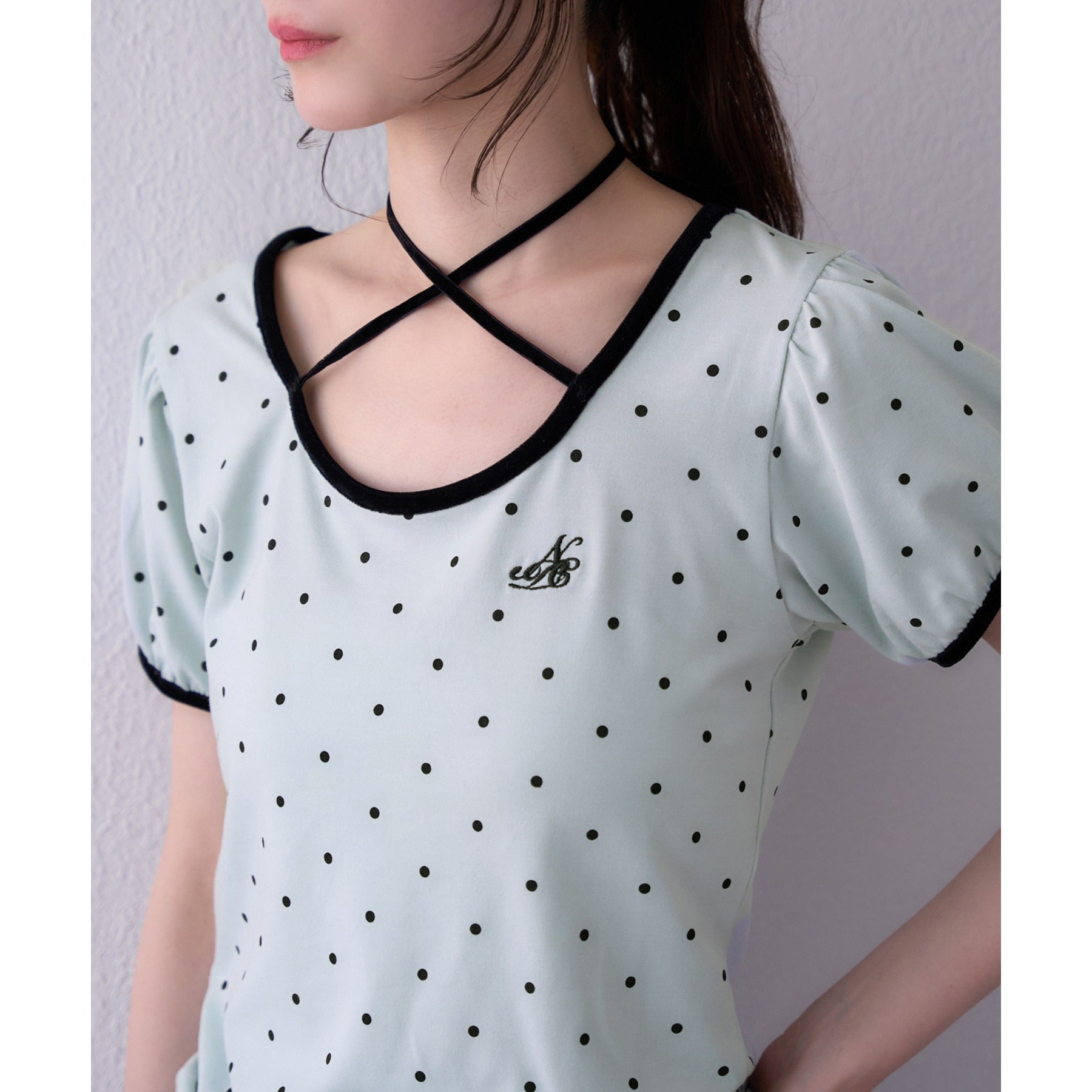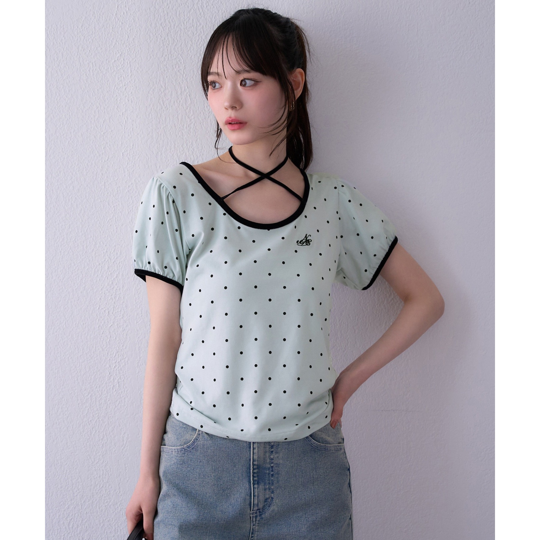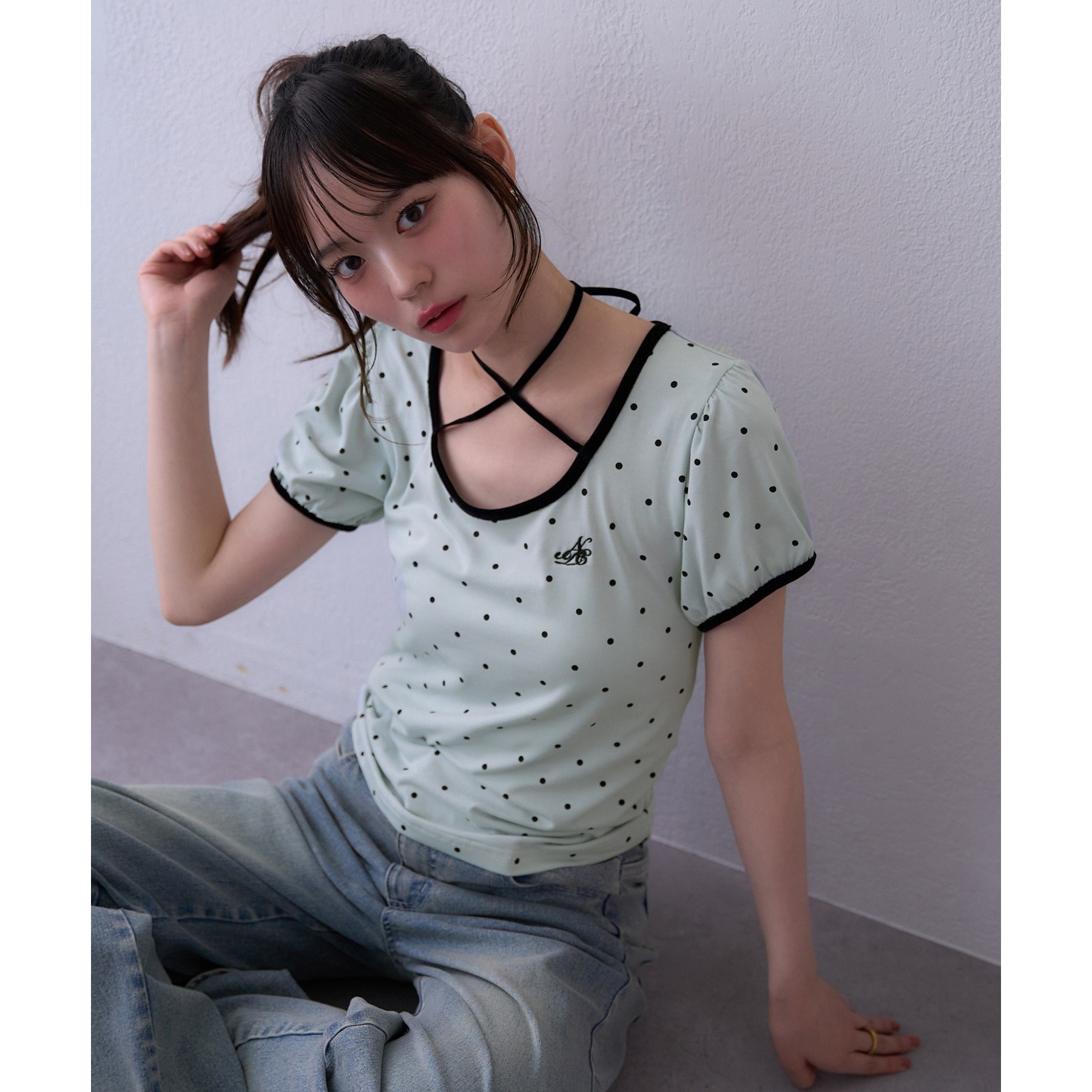 配色のホルターネックが目を惹く、ドット柄のTシャツ。