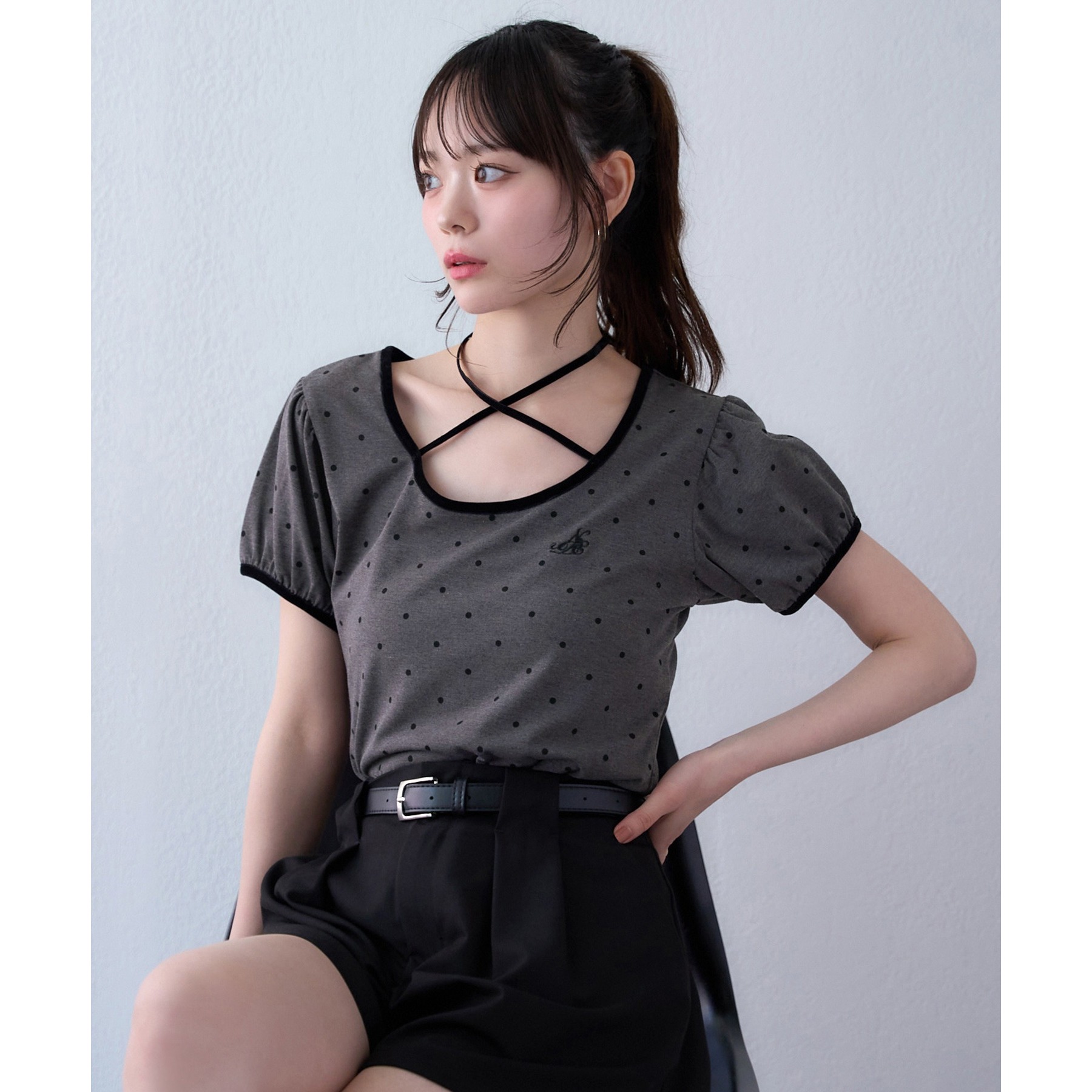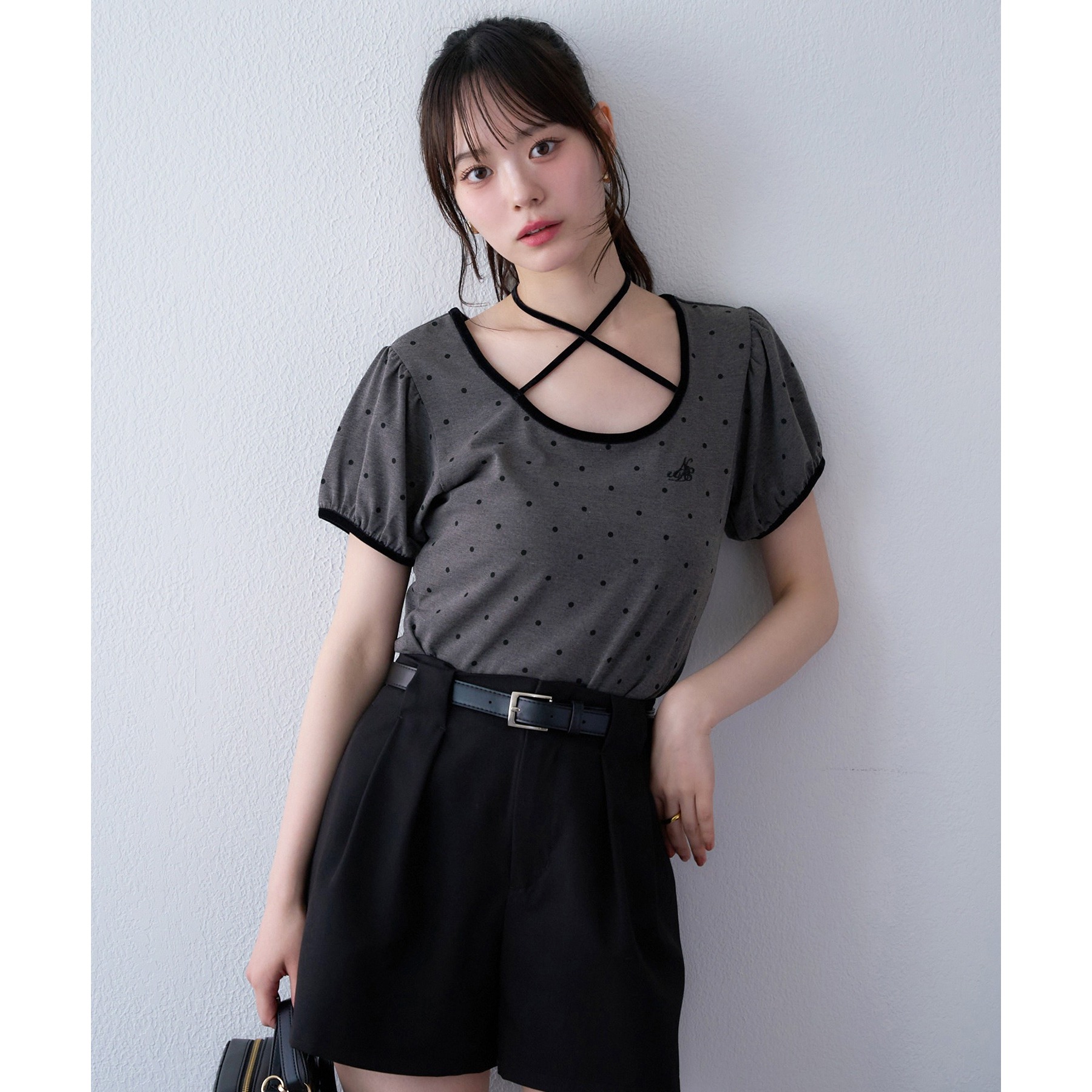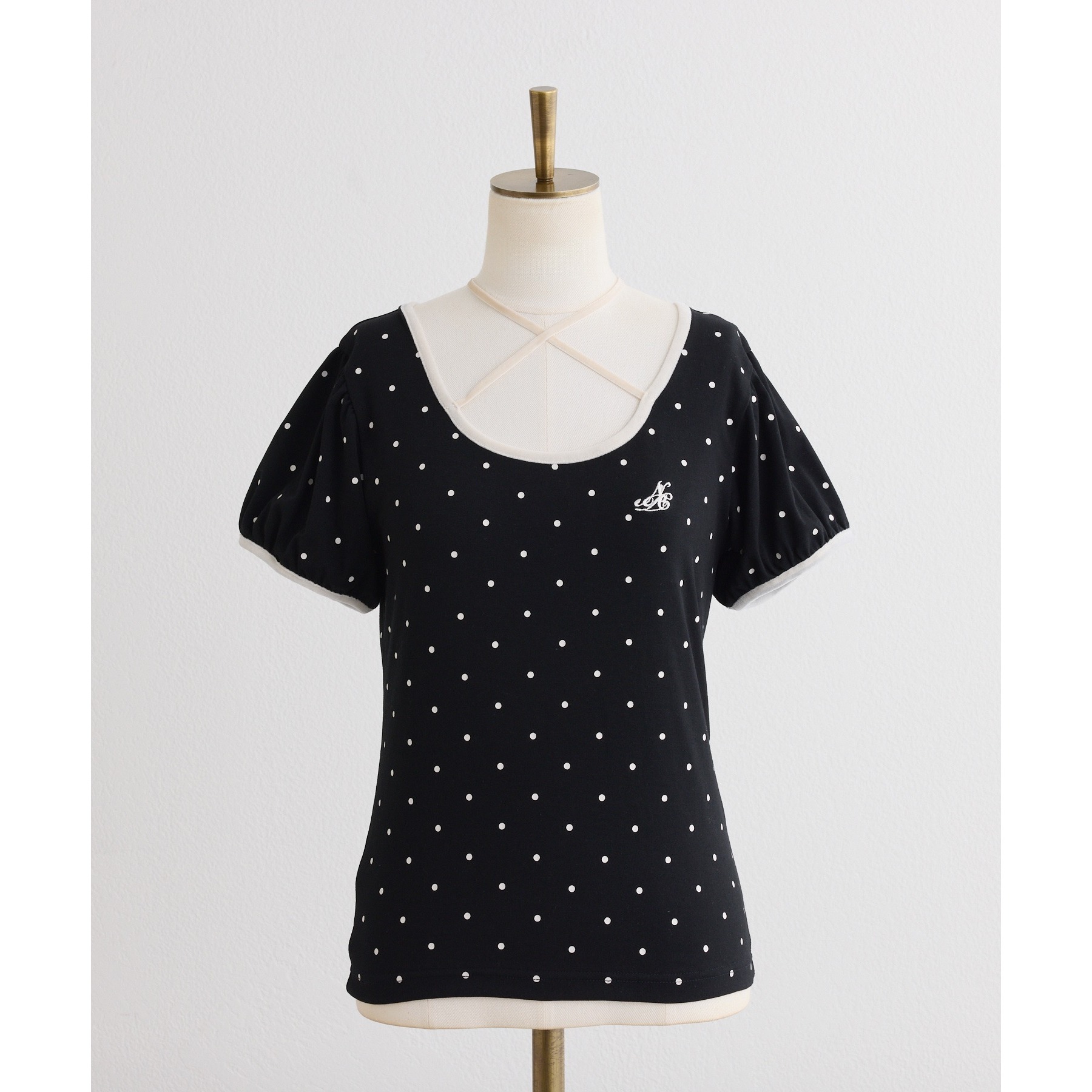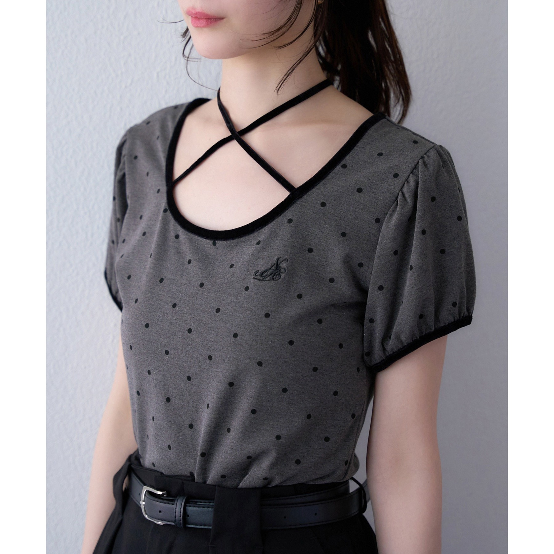 配色のホルターネックが目を惹く、ドット柄のTシャツ。