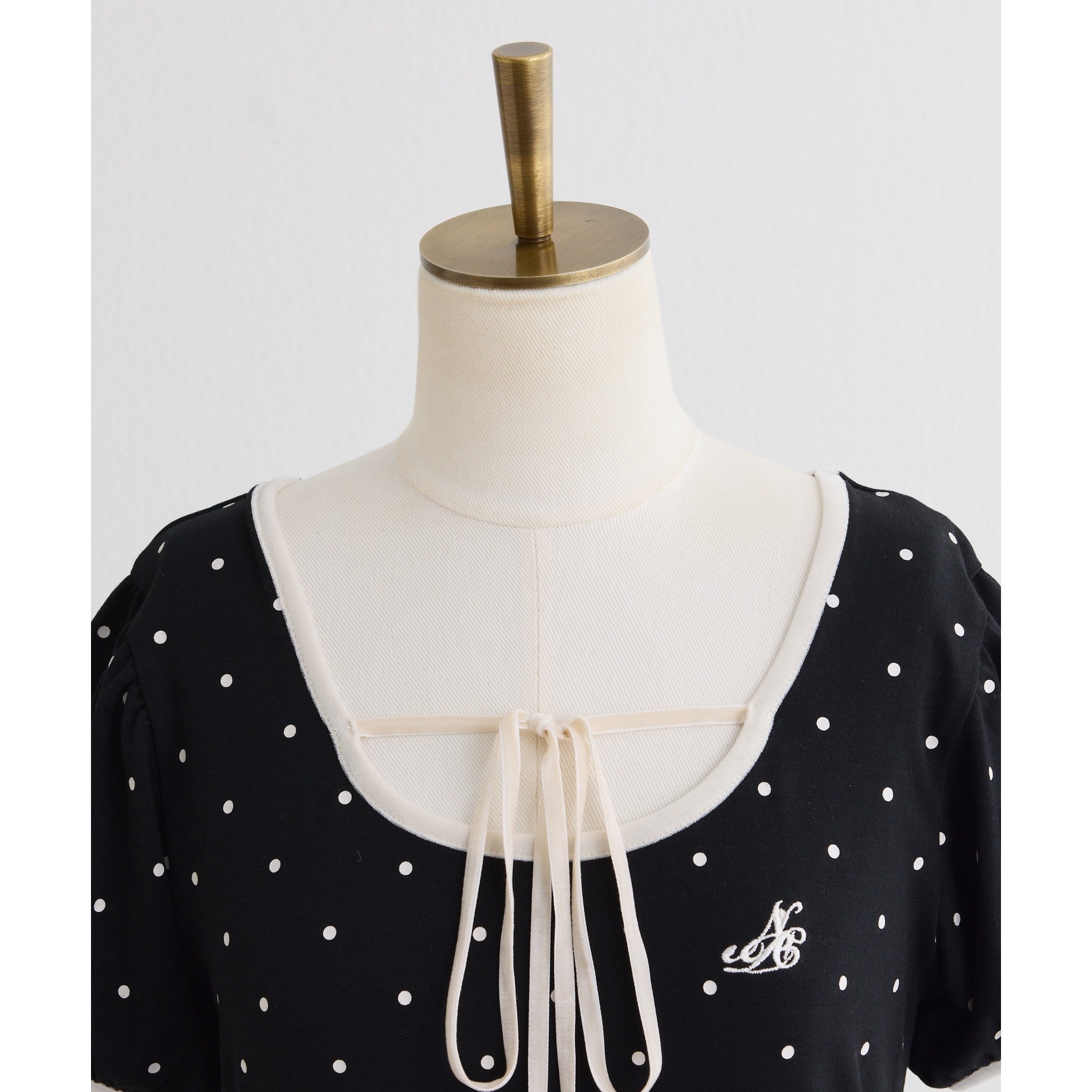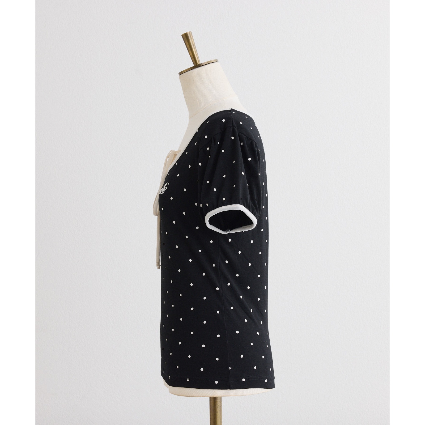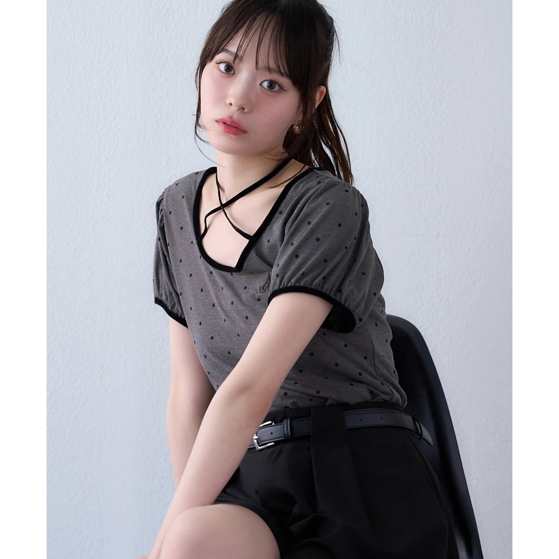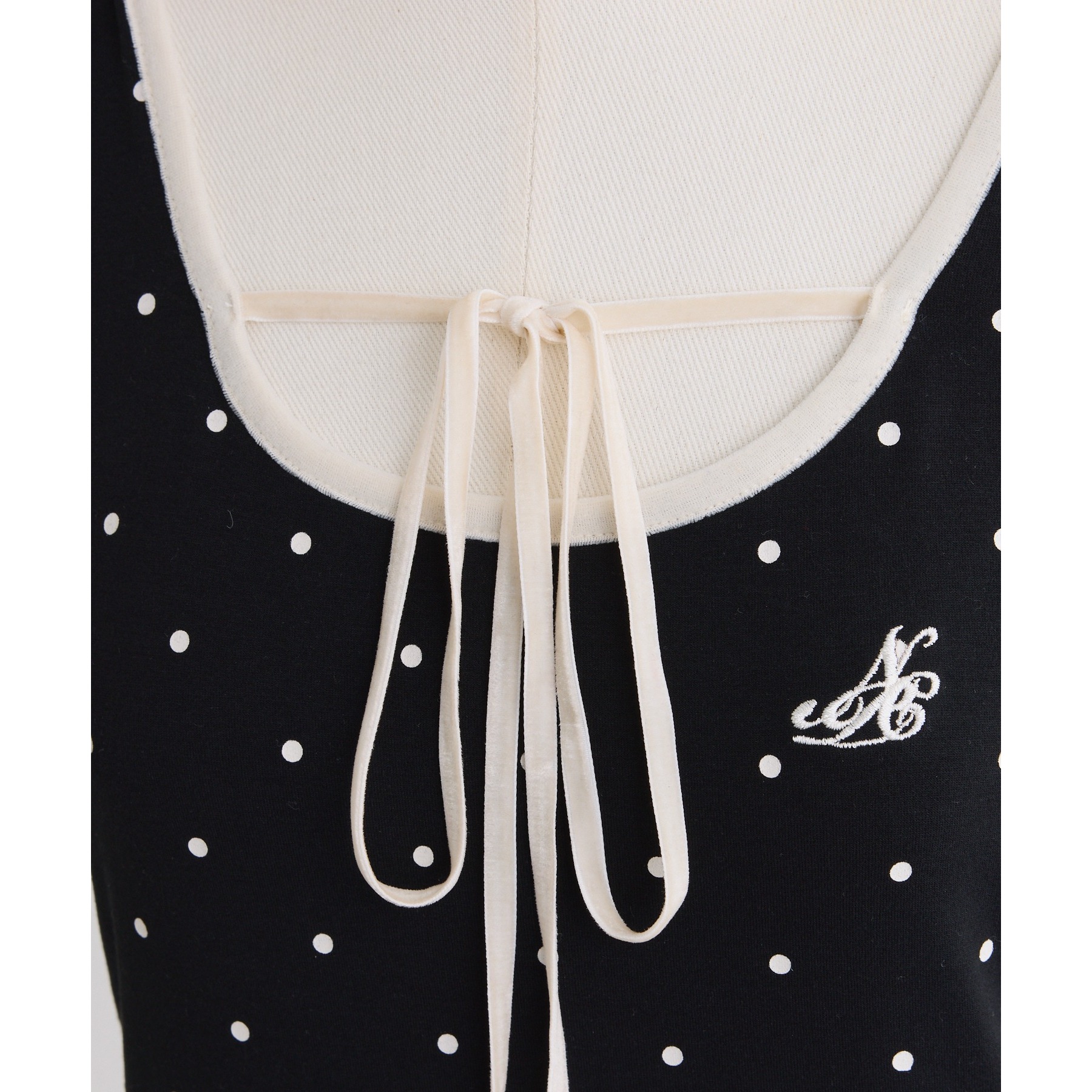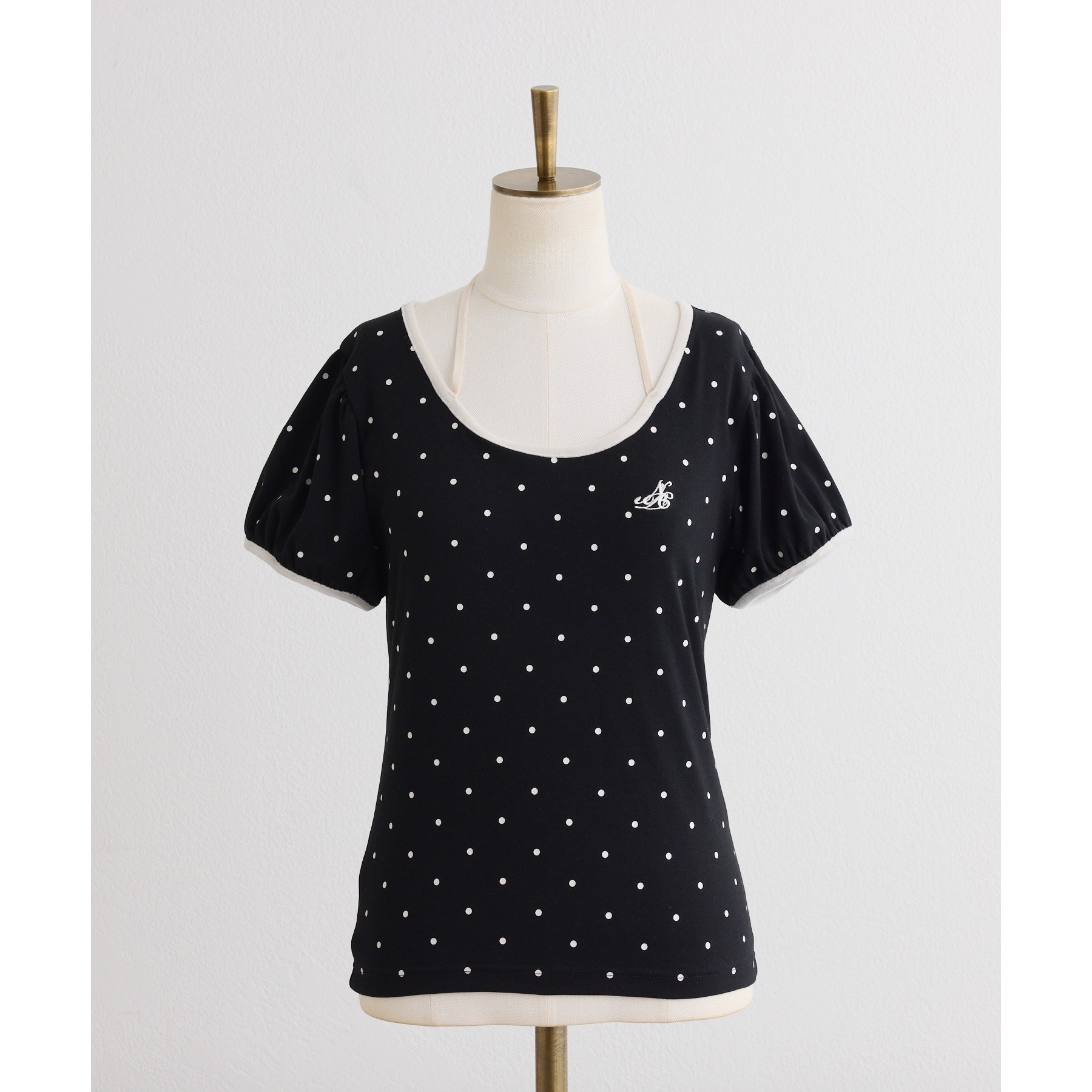 配色のホルターネックが目を惹く、ドット柄のTシャツ。