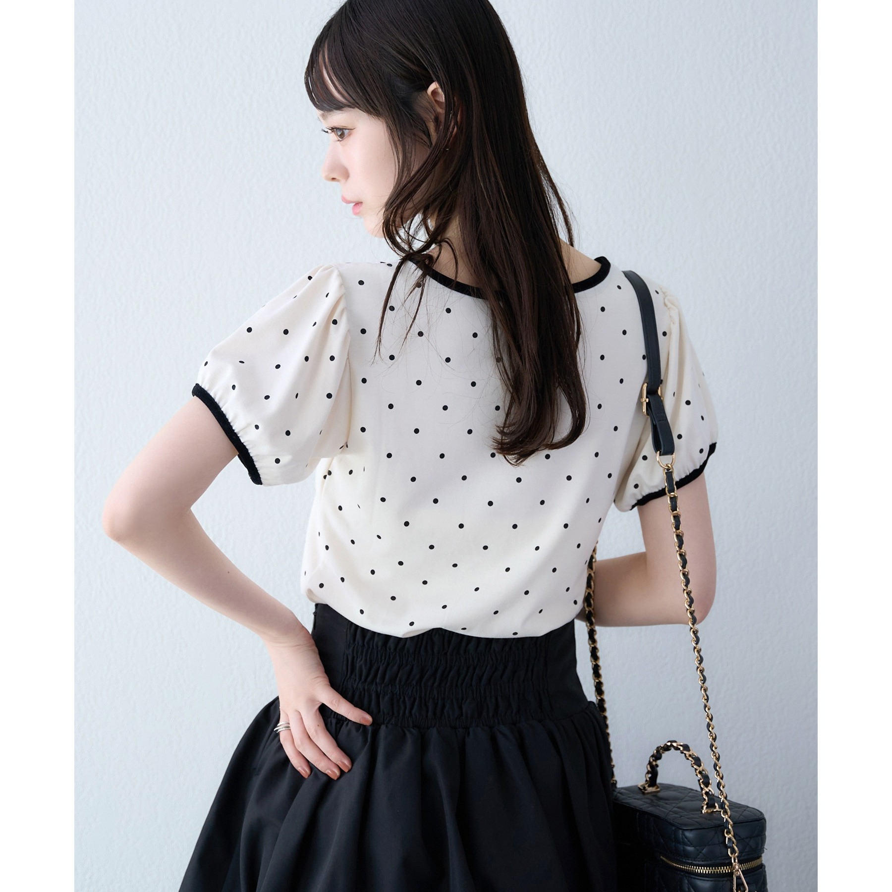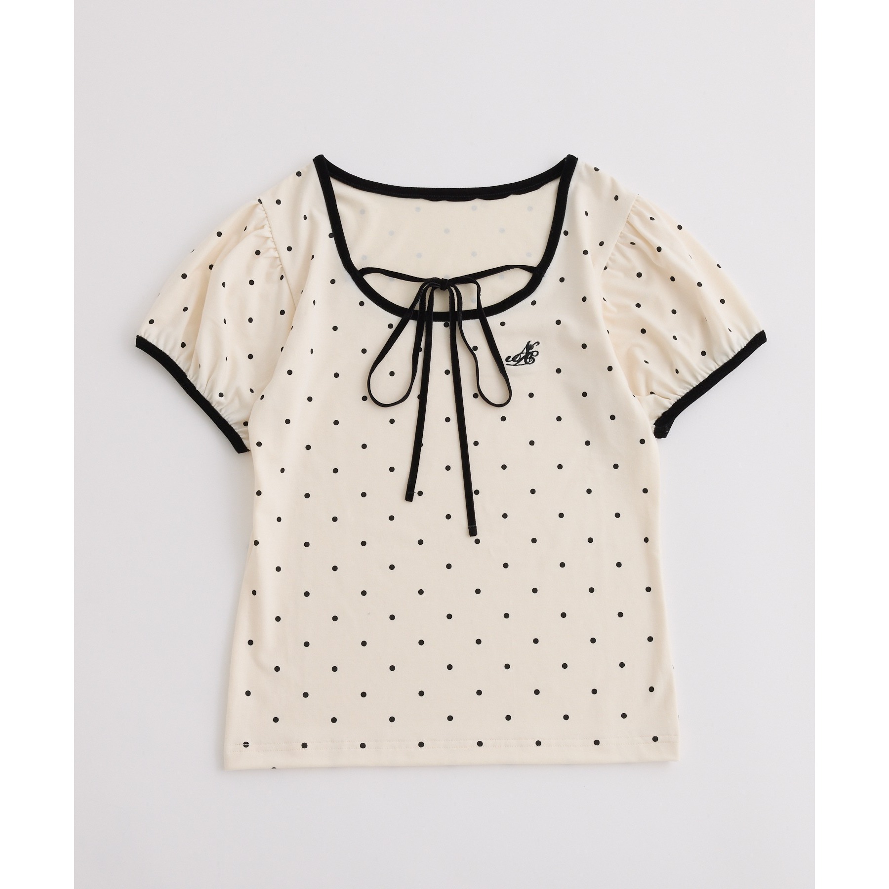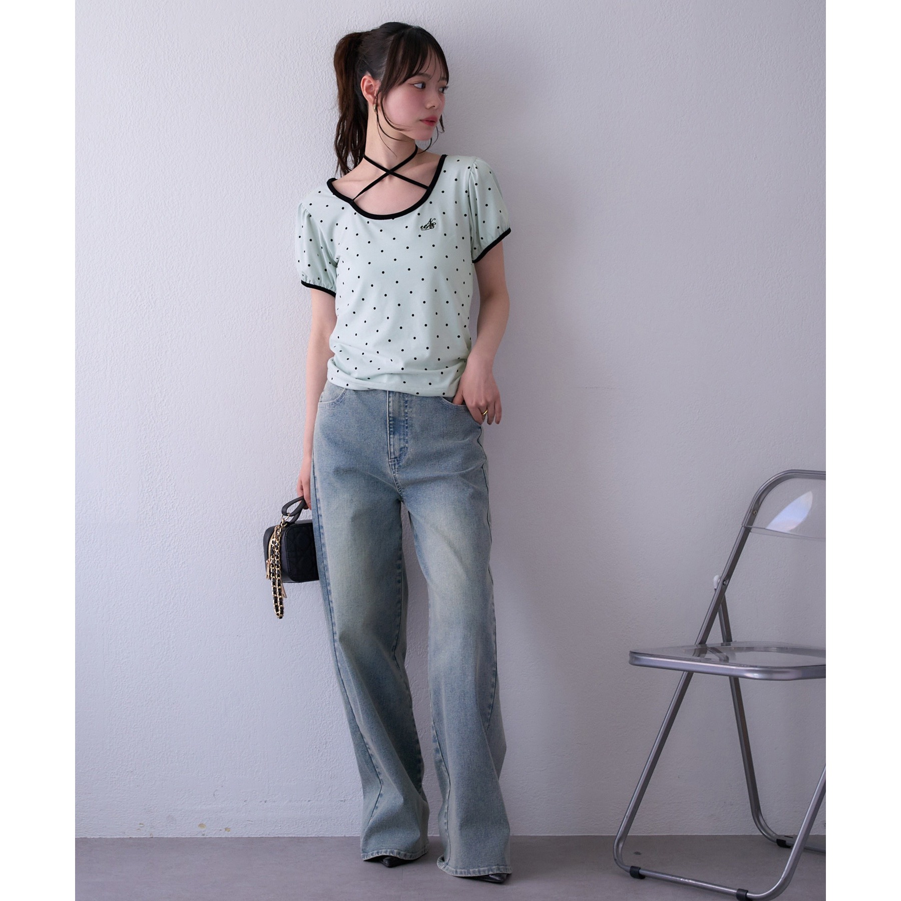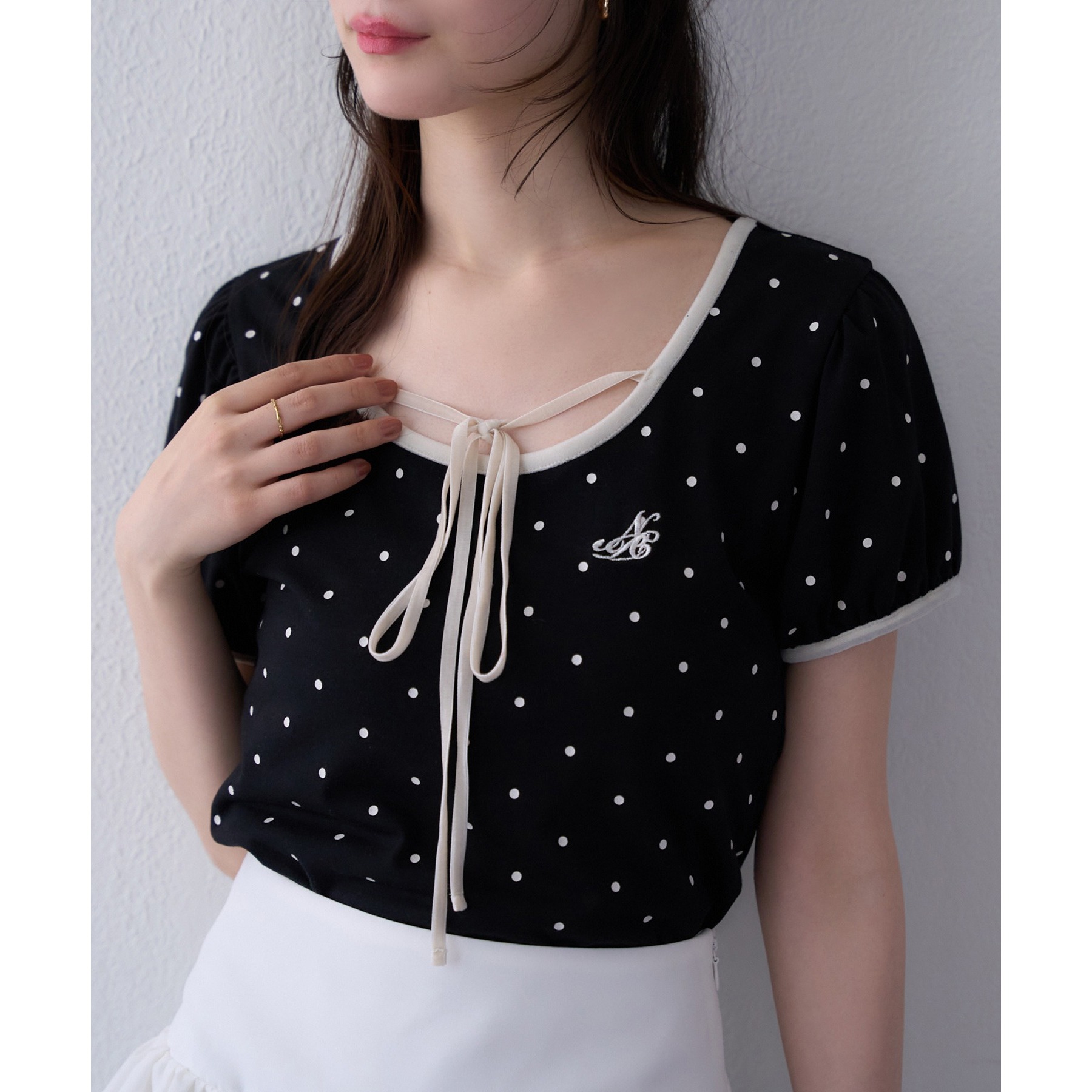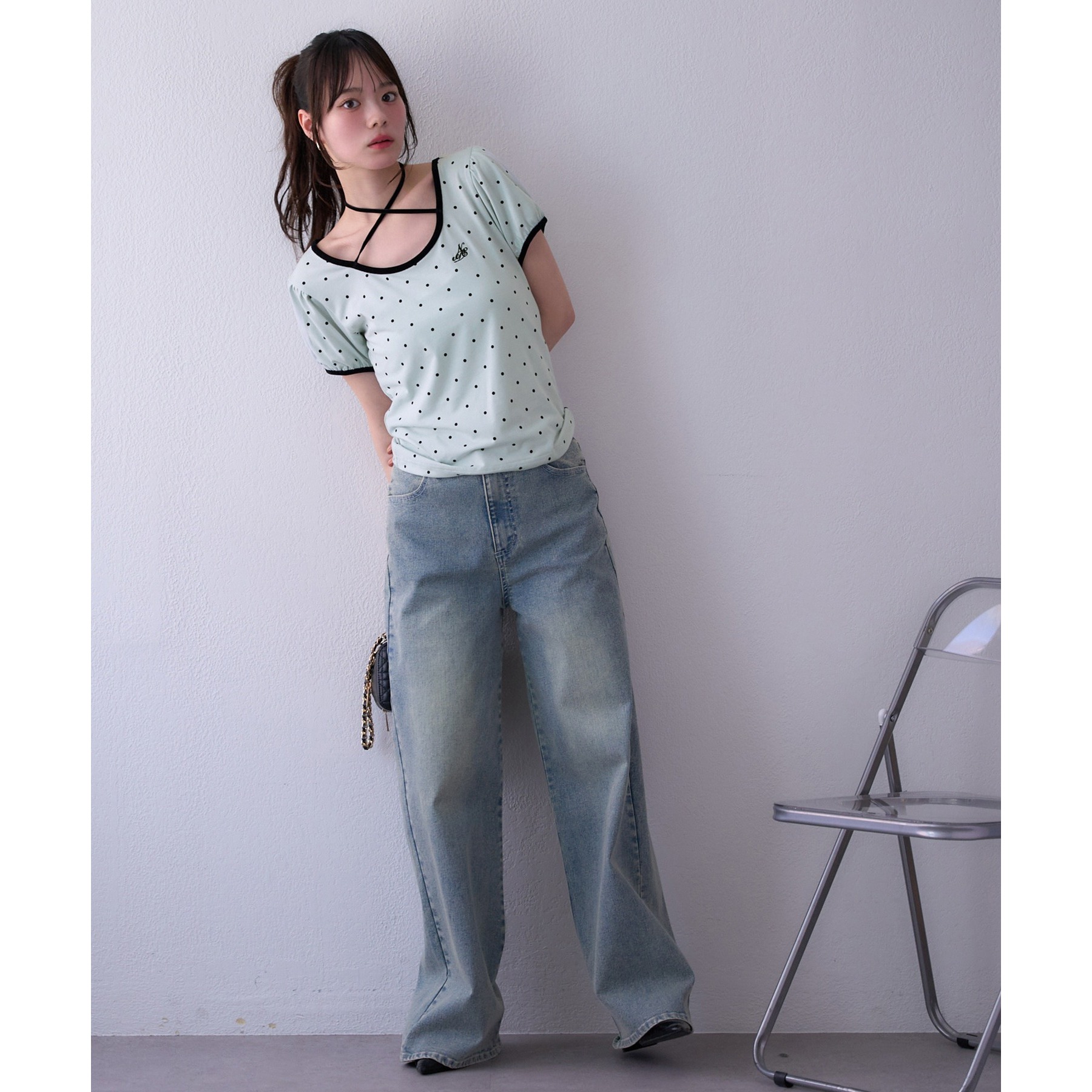 配色のホルターネックが目を惹く、ドット柄のTシャツ。