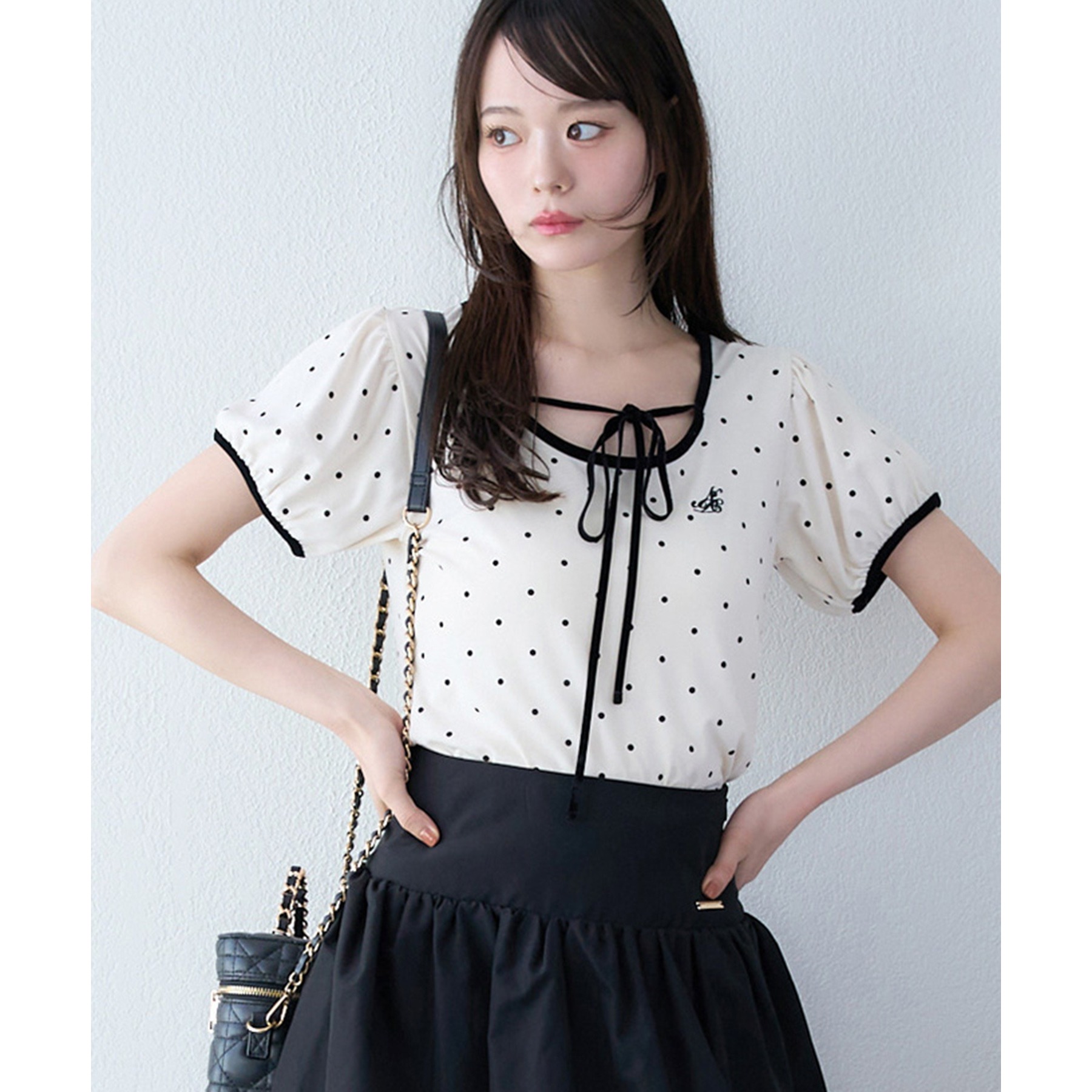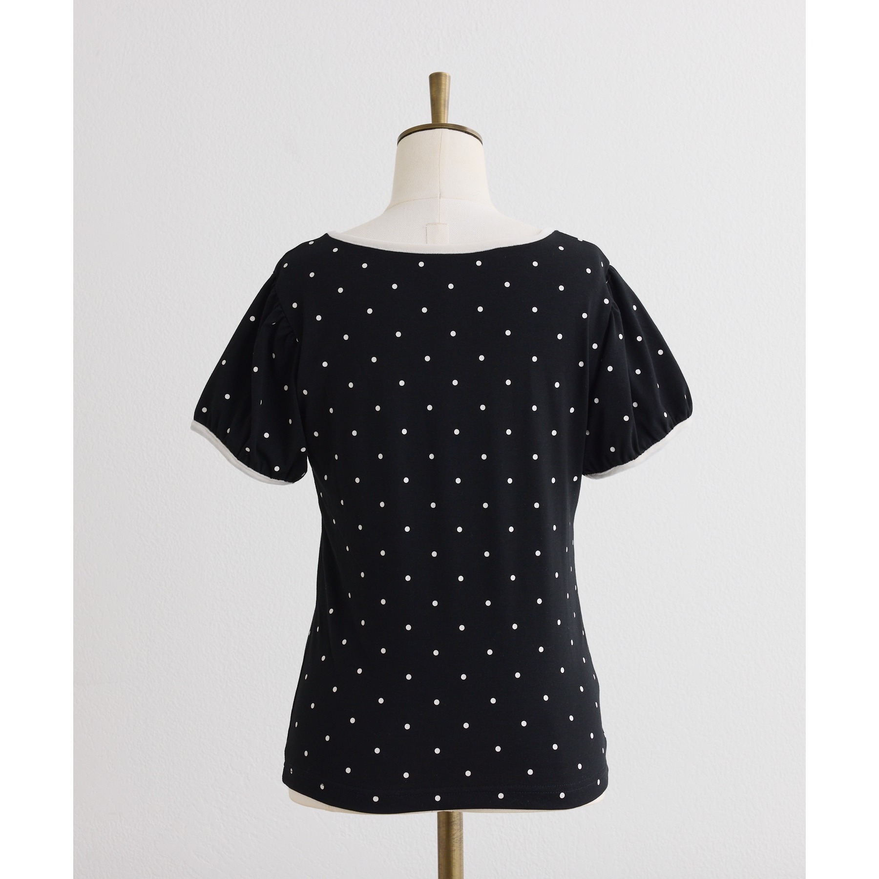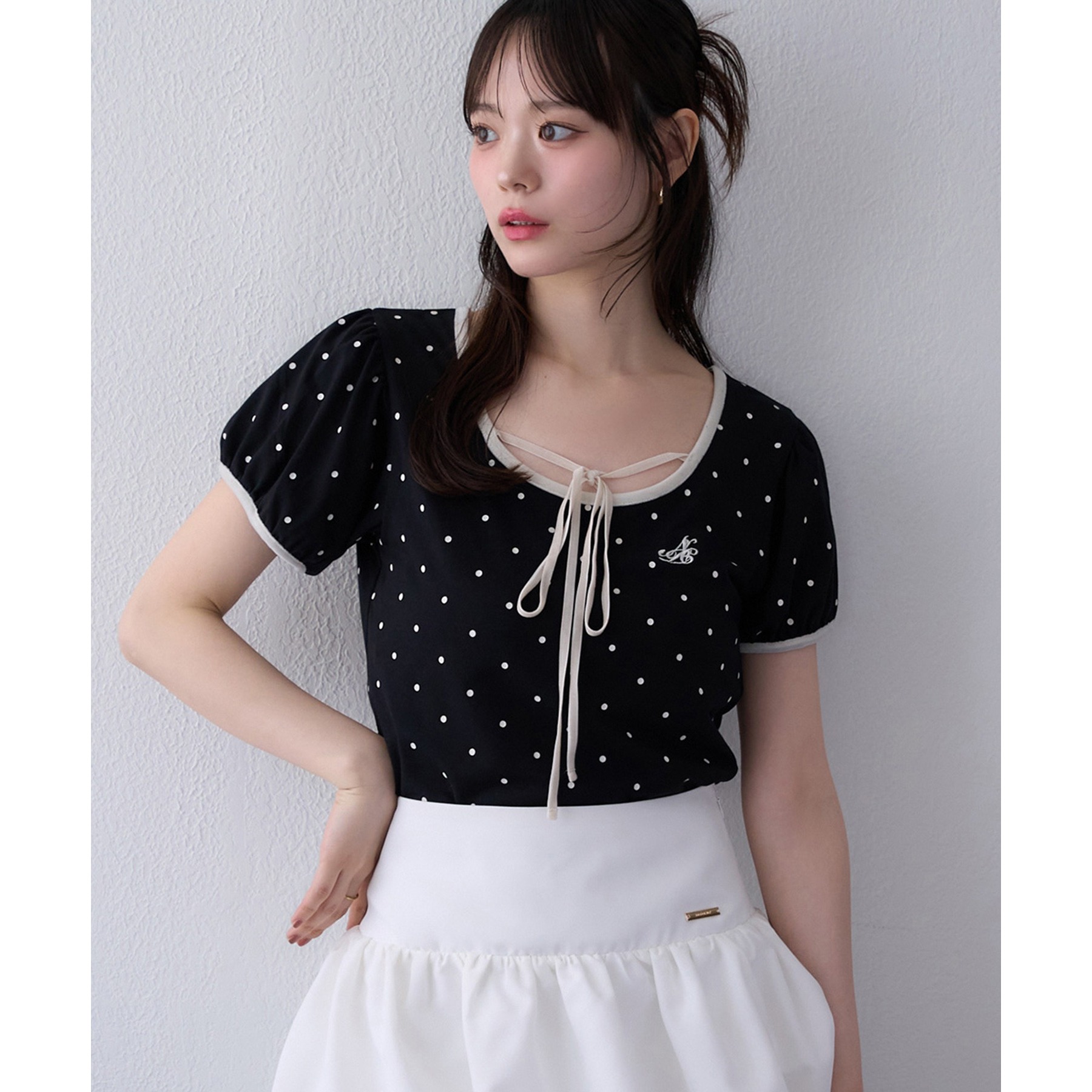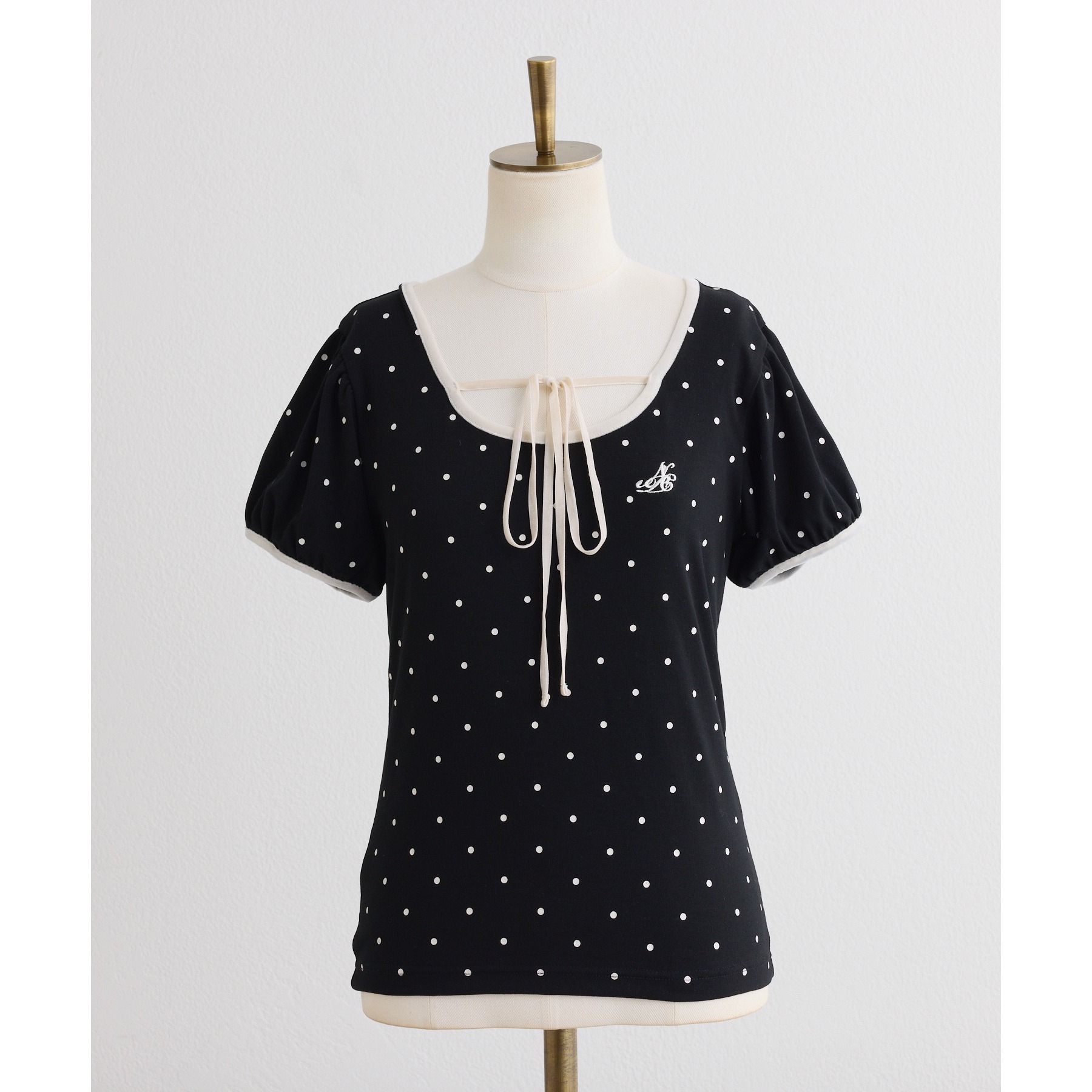 配色のホルターネックが目を惹く、ドット柄のTシャツ。