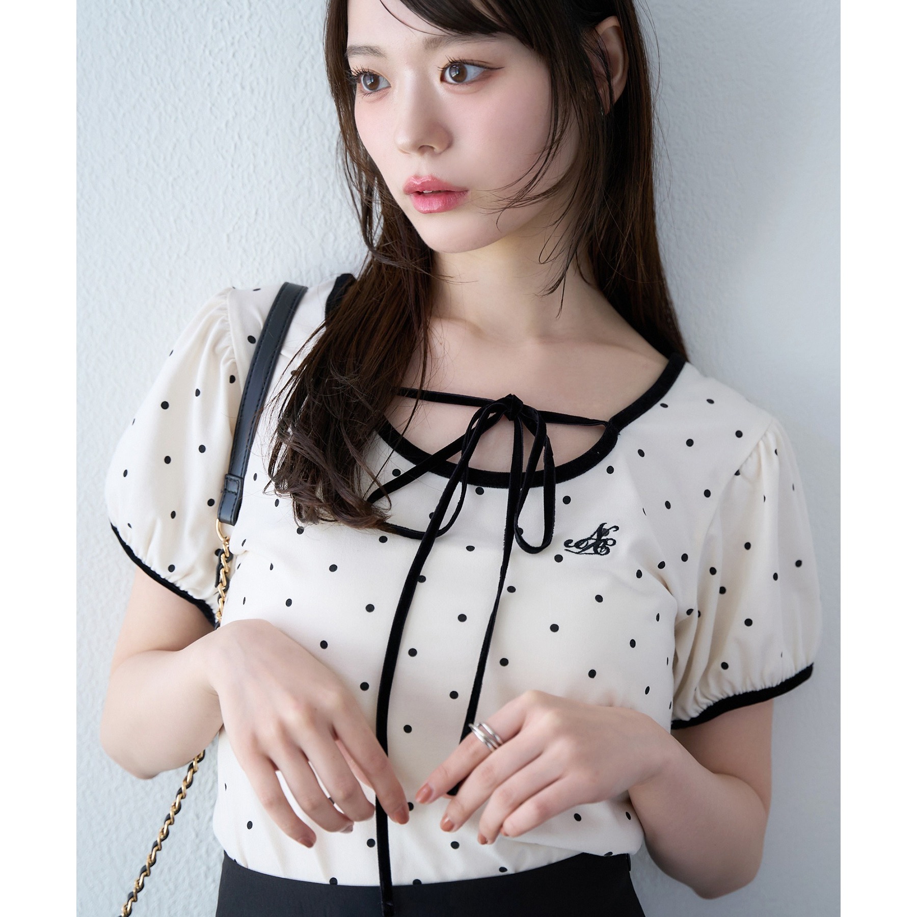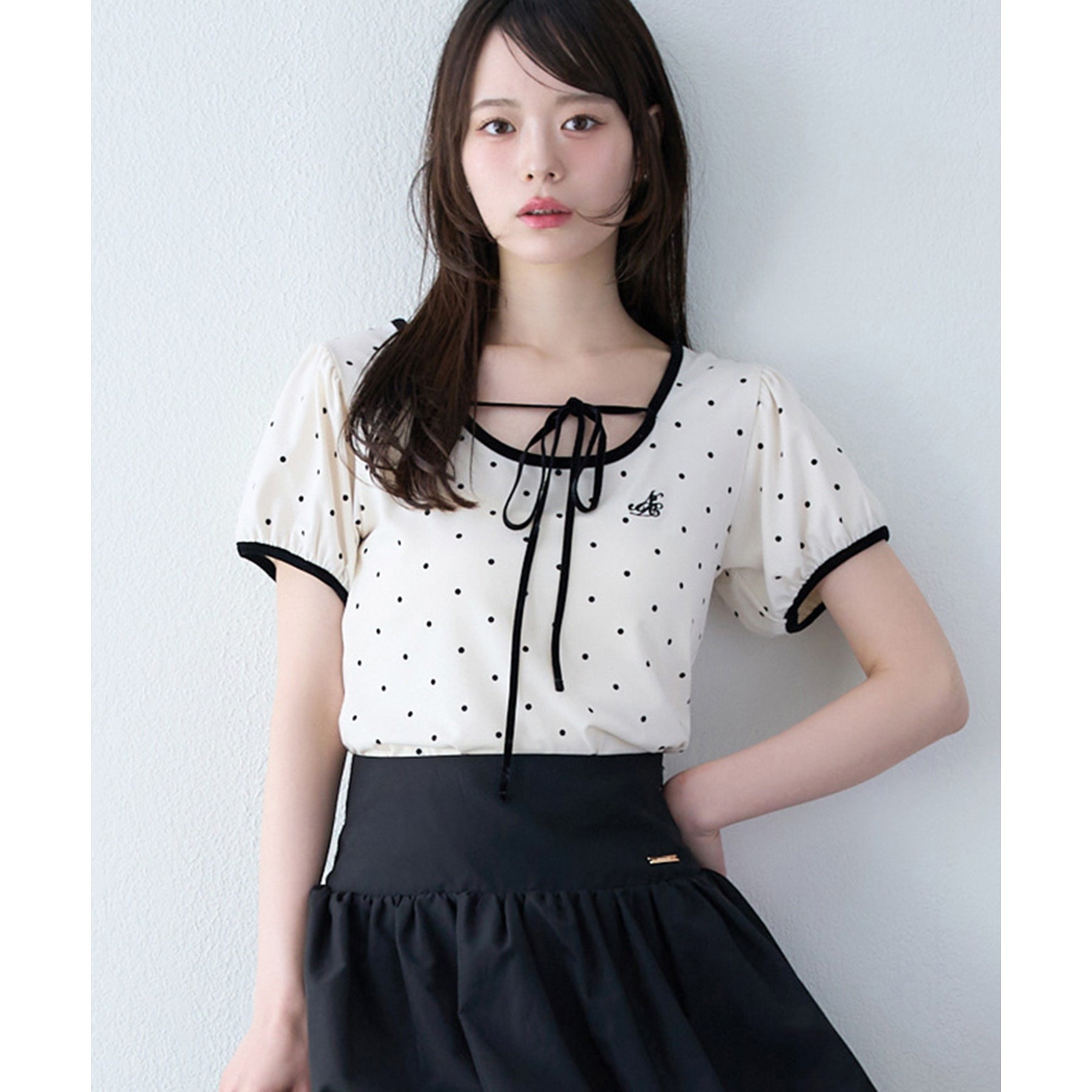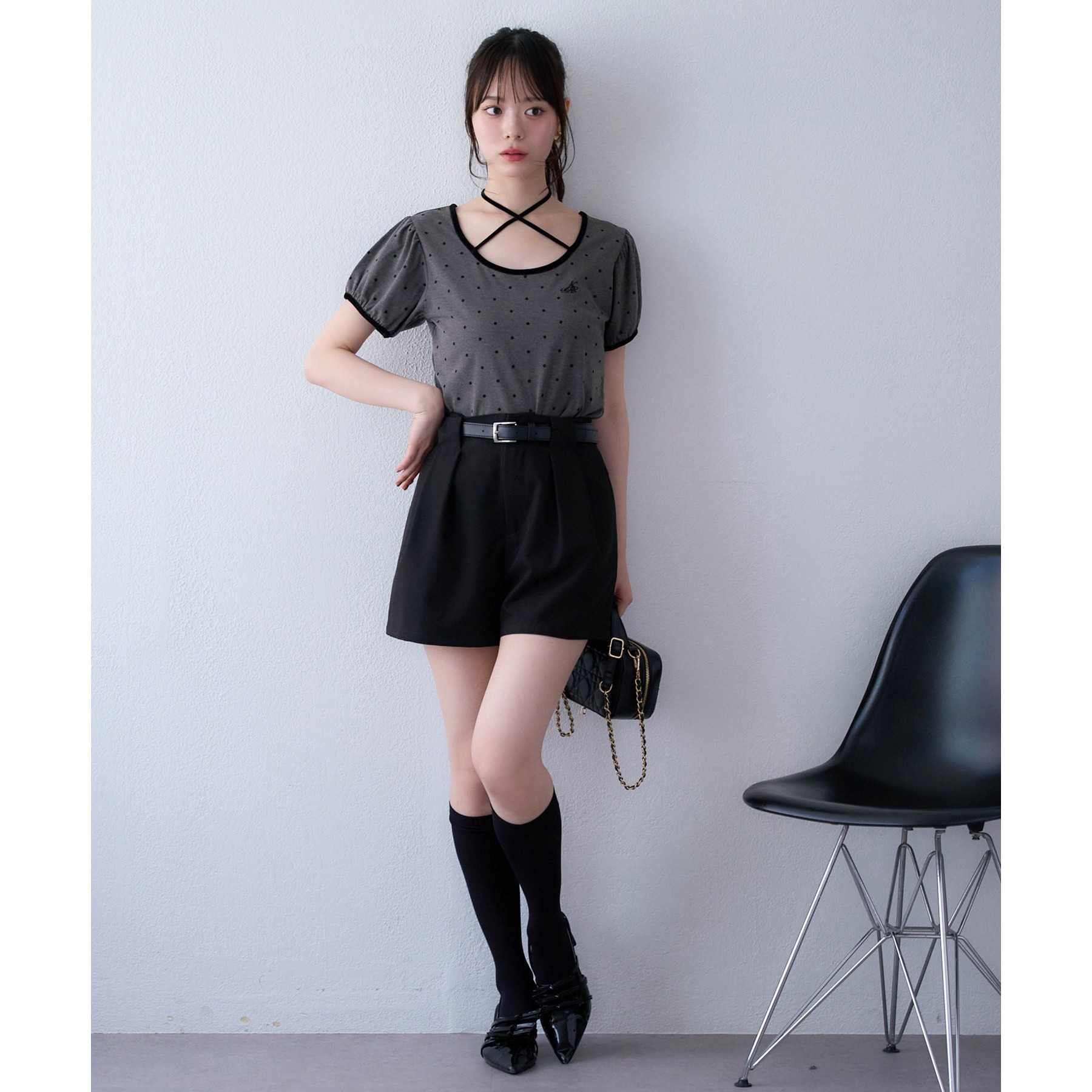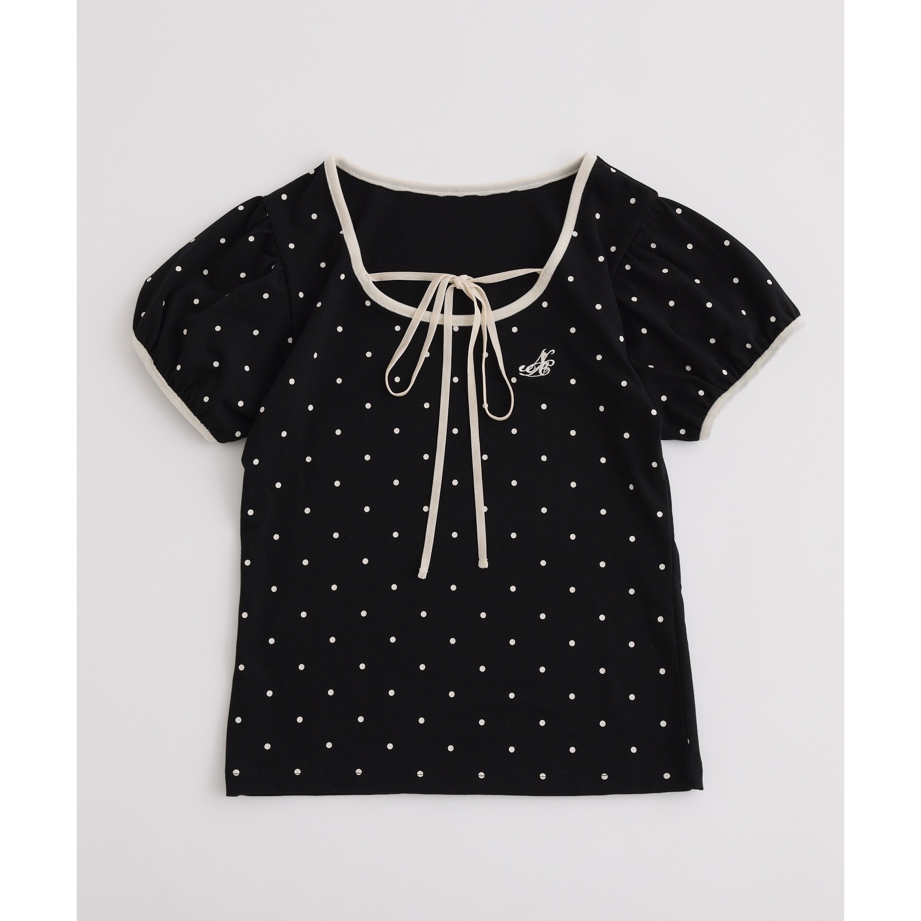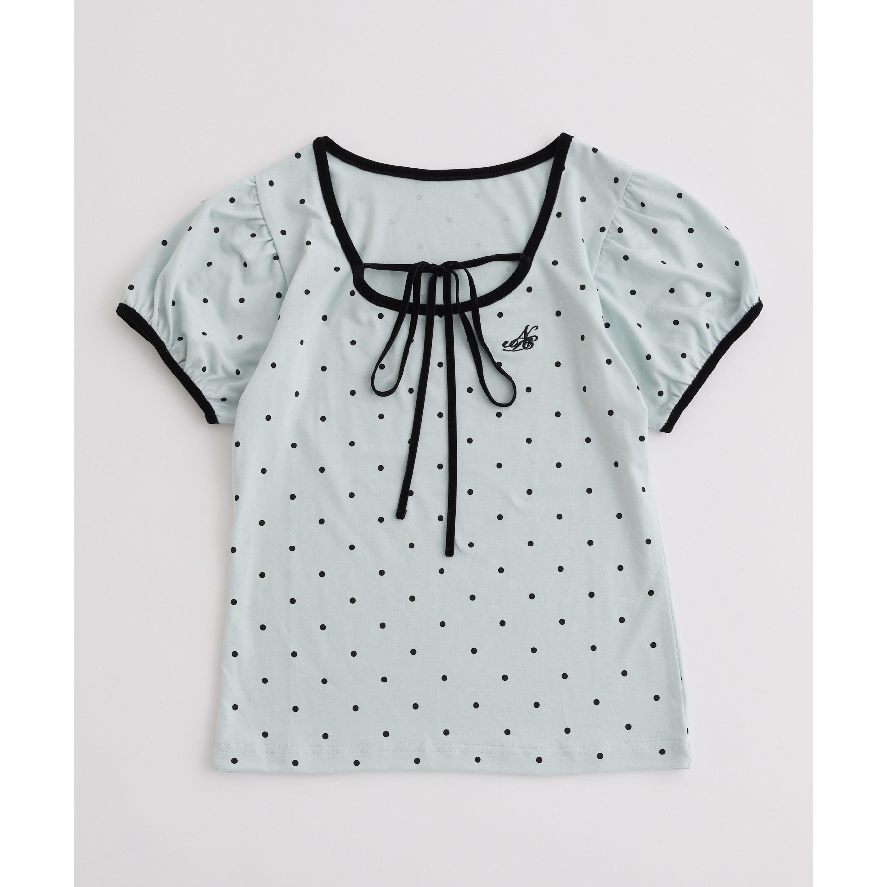配色のホルターネックが目を惹く、ドット柄のTシャツ。