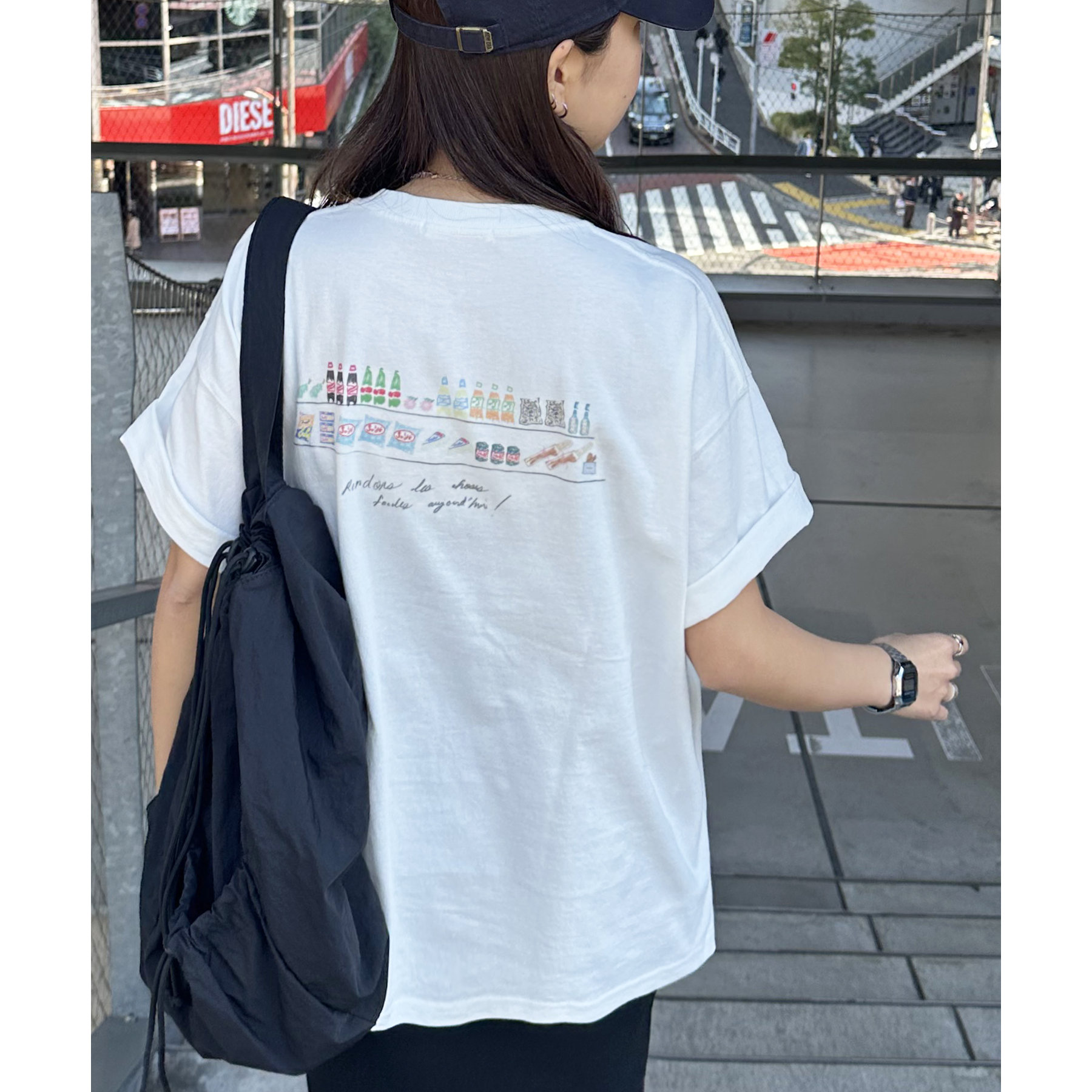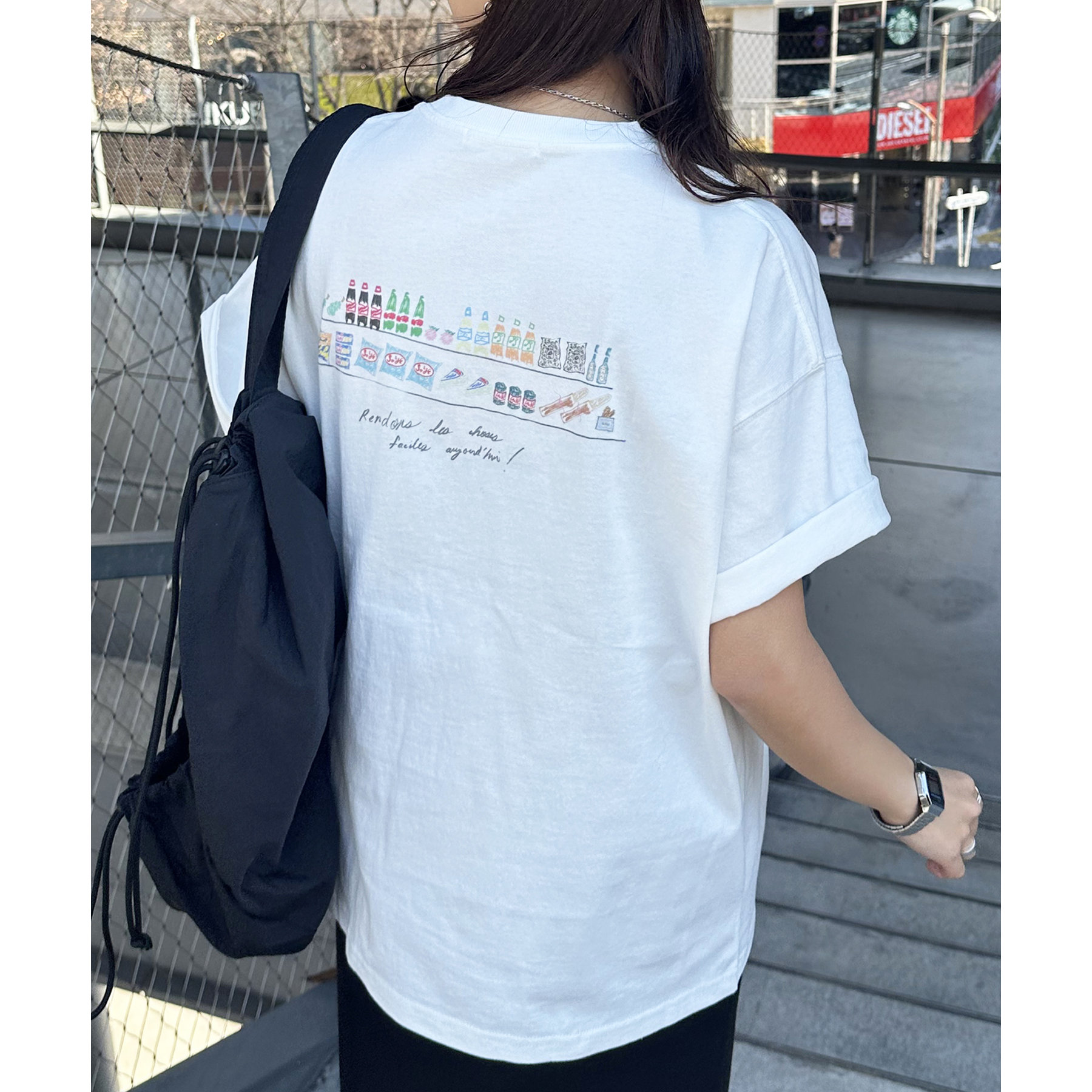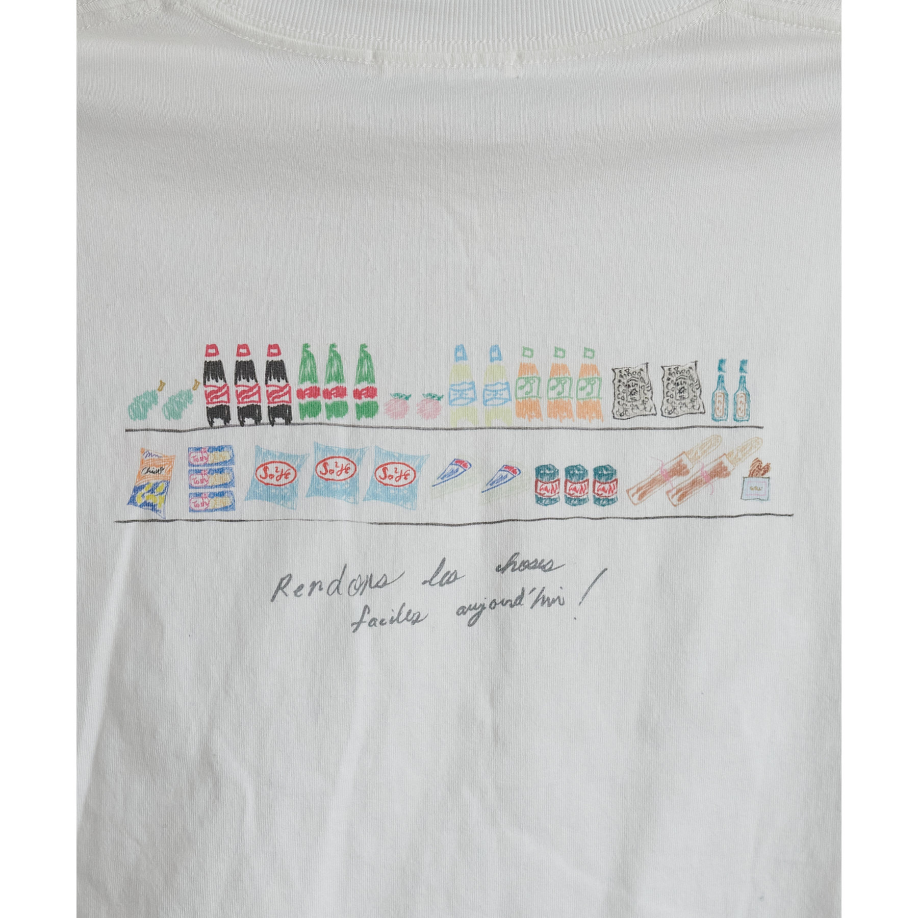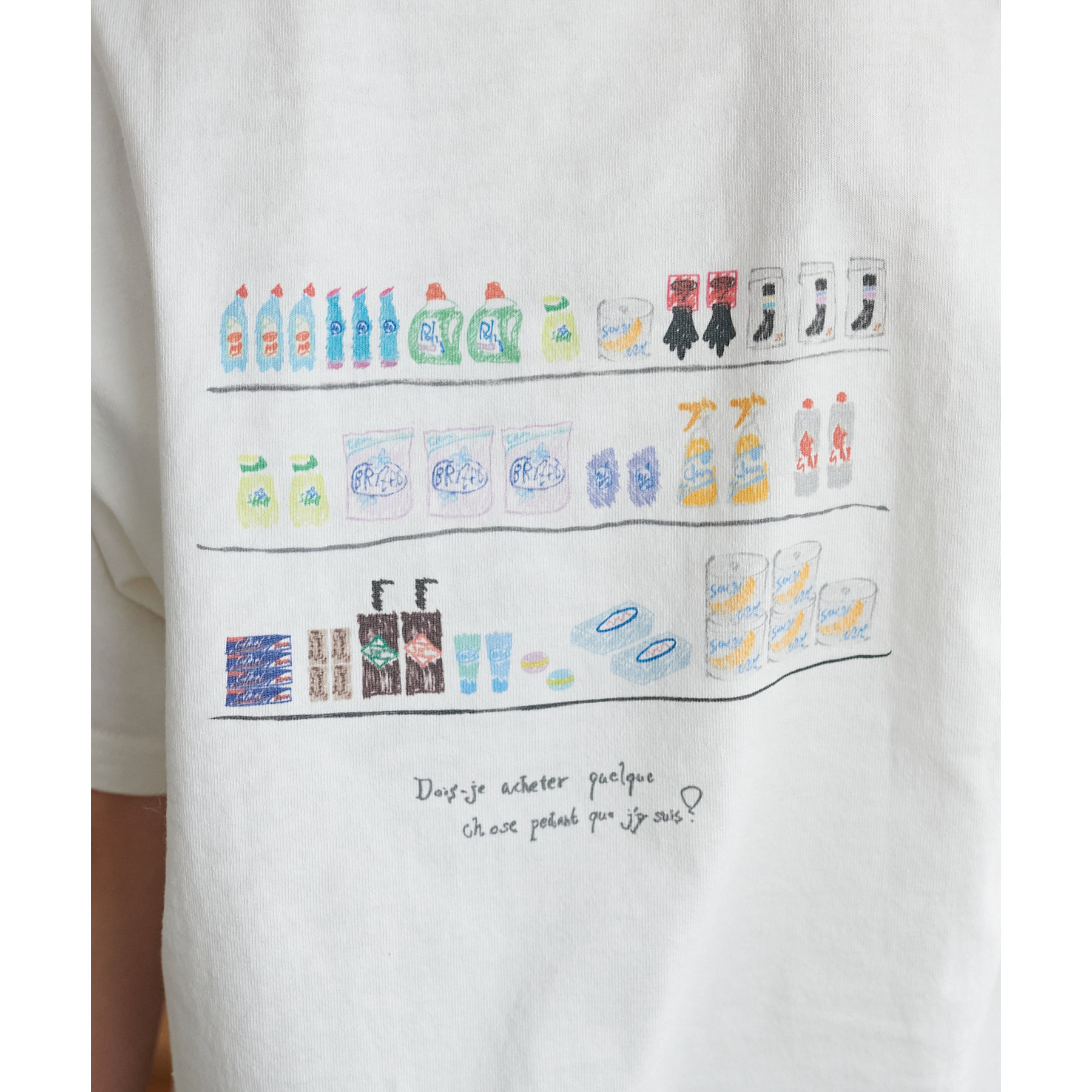 スーパーマーケットの棚に並んだ、飲み物やお菓子、スナックが、まるで手書きスケッチのように描かれたバックプリントTシャツ。