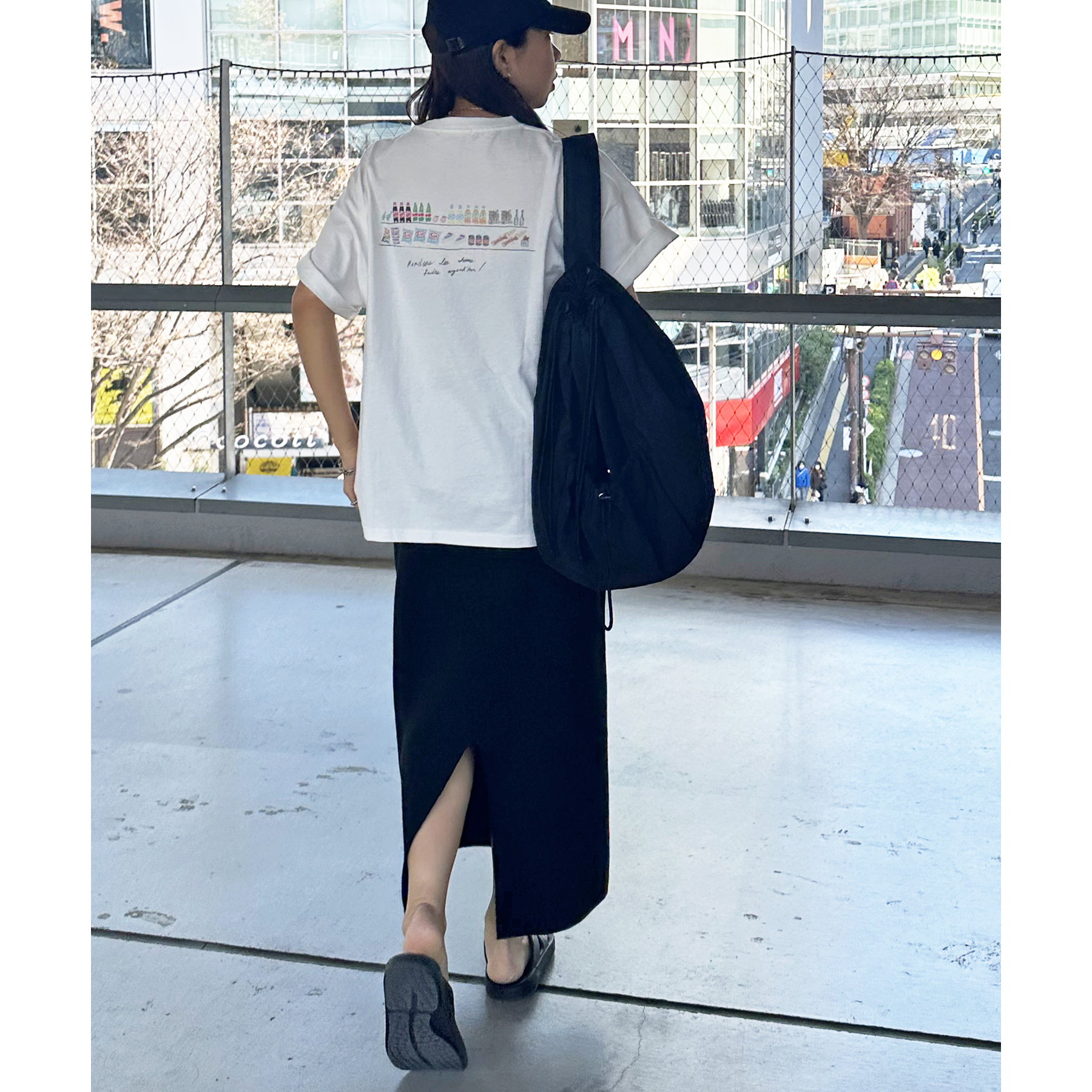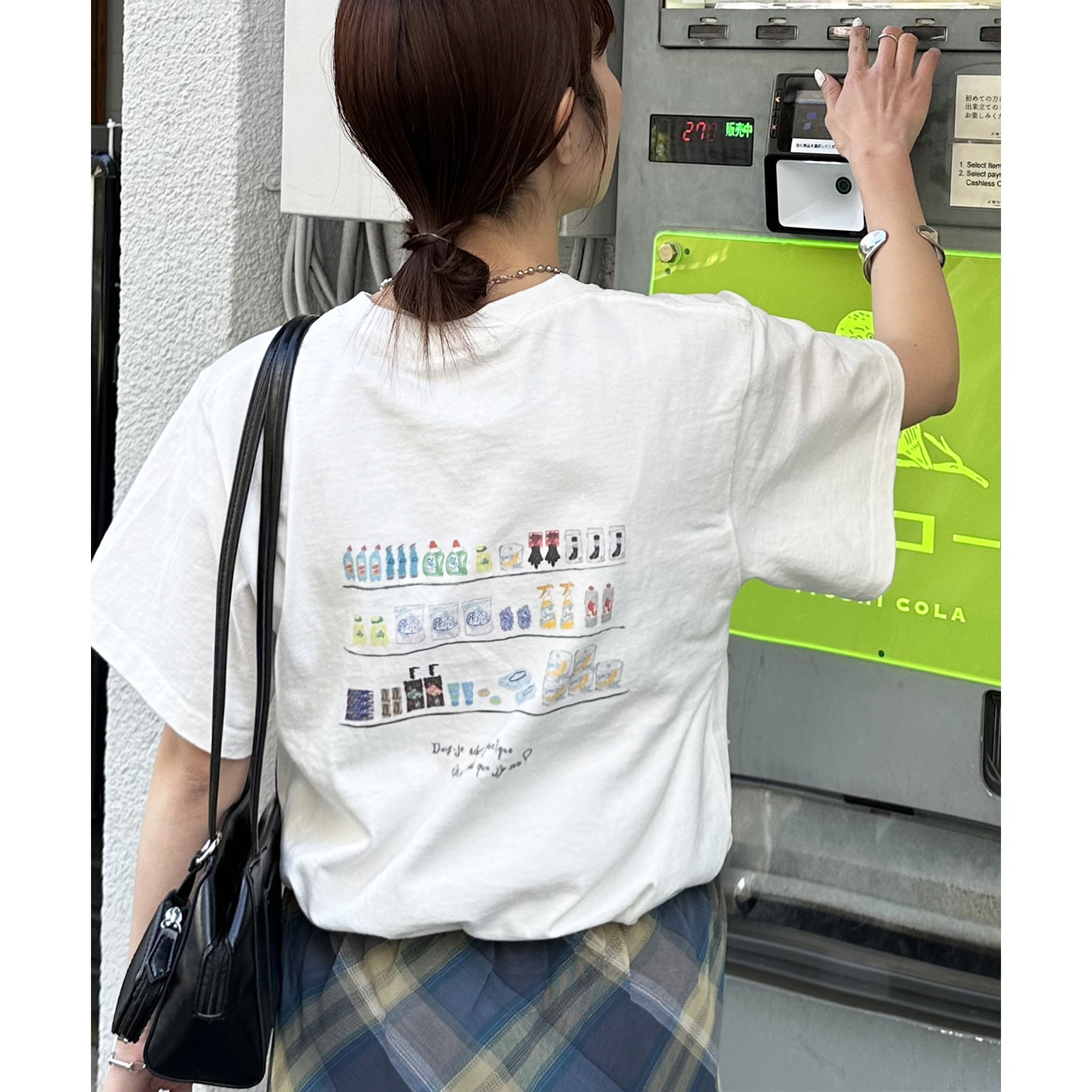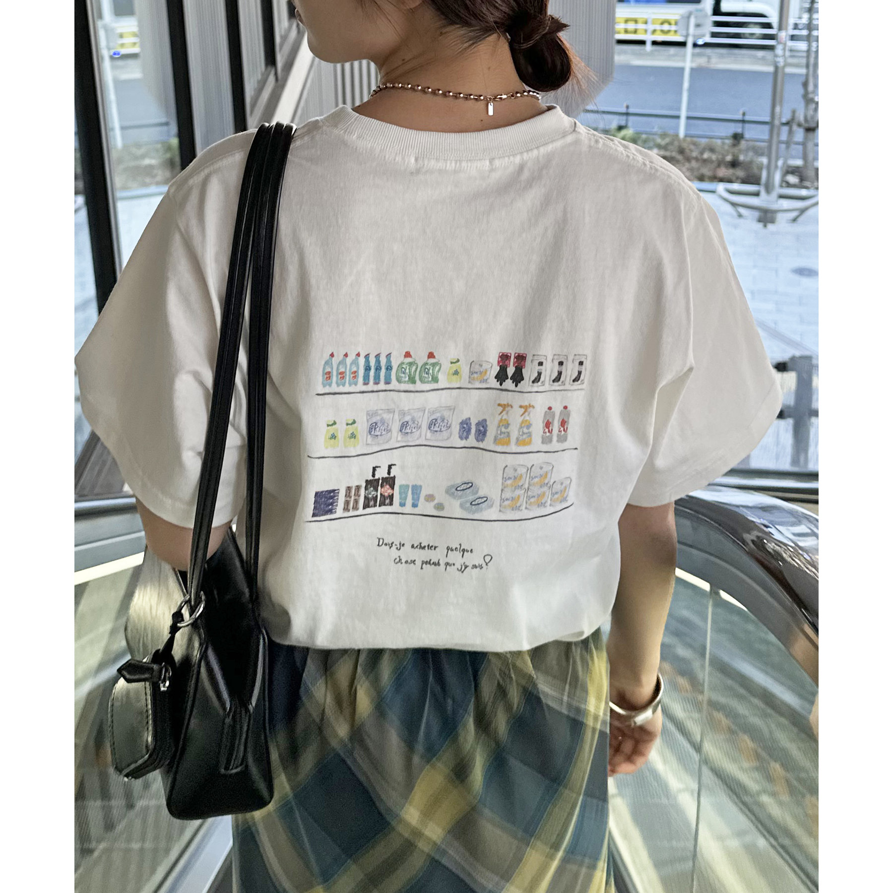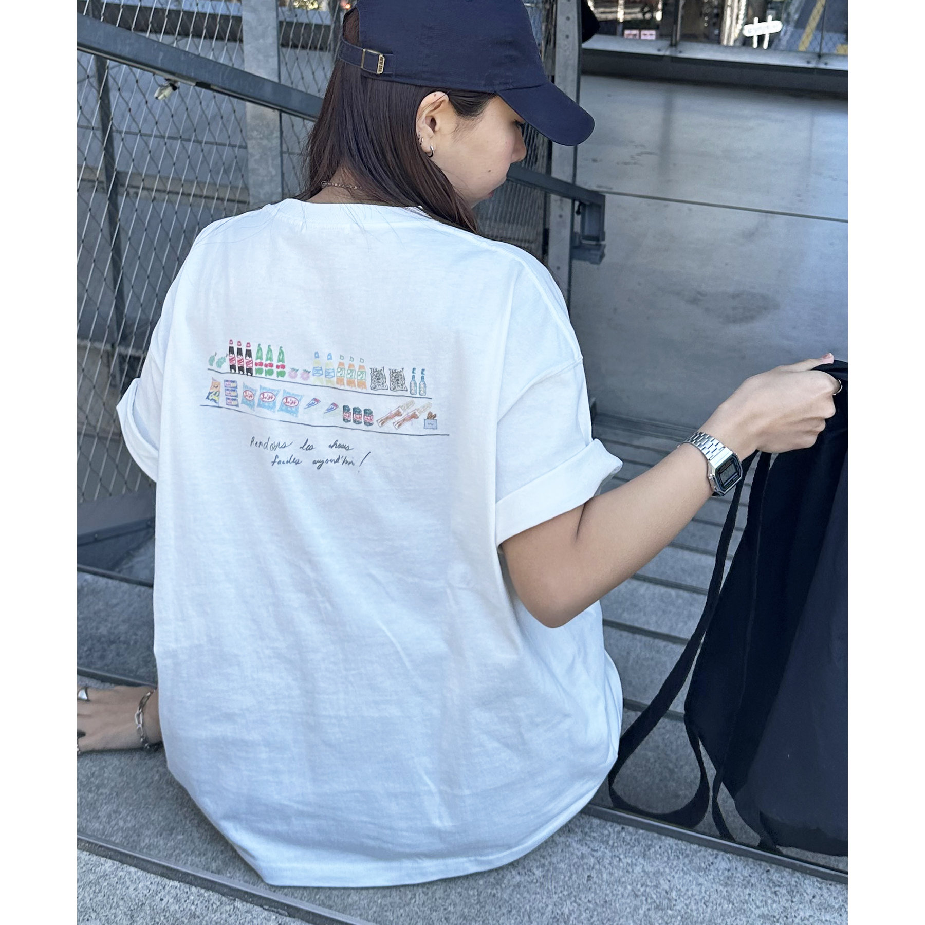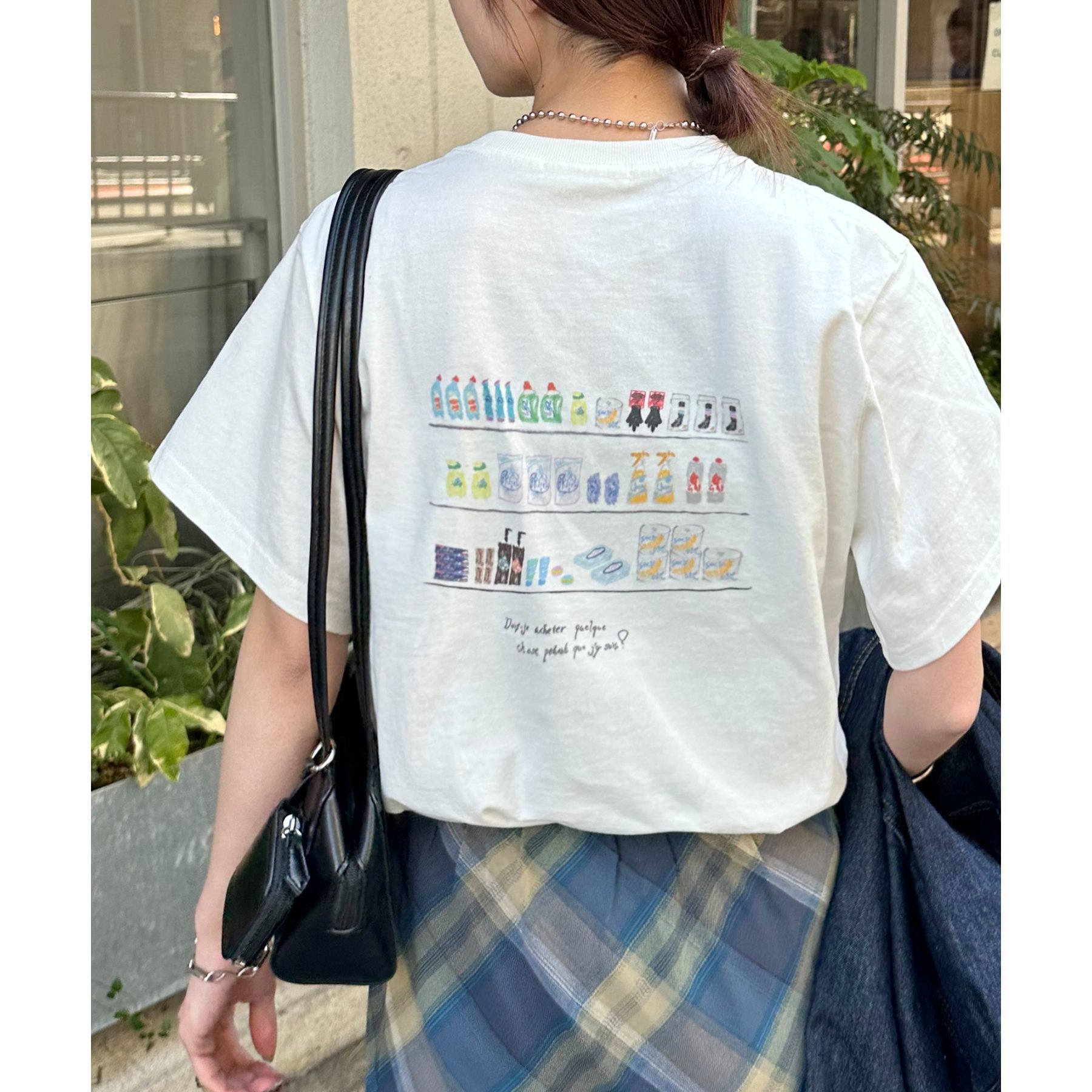 スーパーマーケットの棚に並んだ、飲み物やお菓子、スナックが、まるで手書きスケッチのように描かれたバックプリントTシャツ。