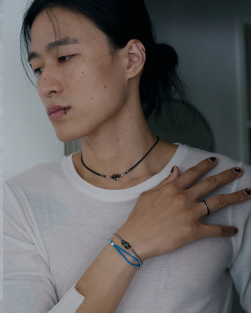 -金属ではなく、高品質のメタル糸を使用して仕立てた、クロシェのネックレス兼ボディチェーンです。