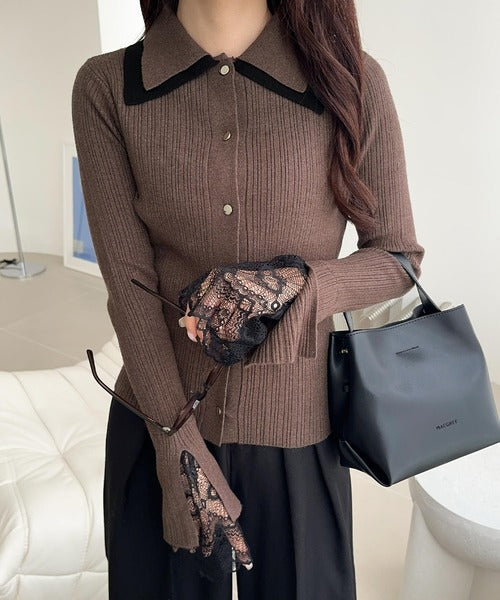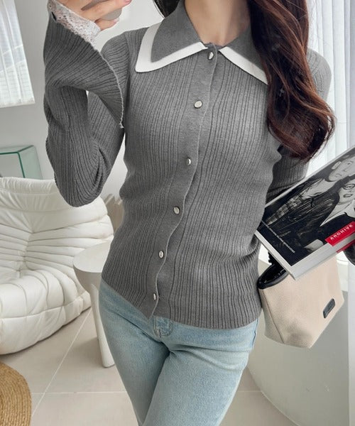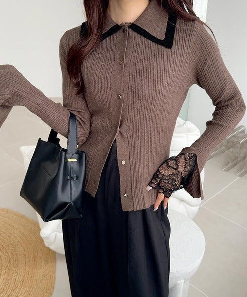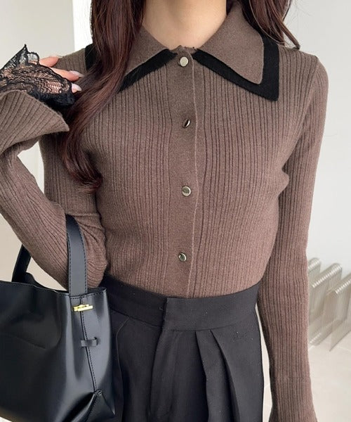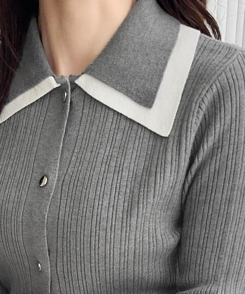 バイカラーの大きめな襟で1枚で着ても存在感のあるリブニットは