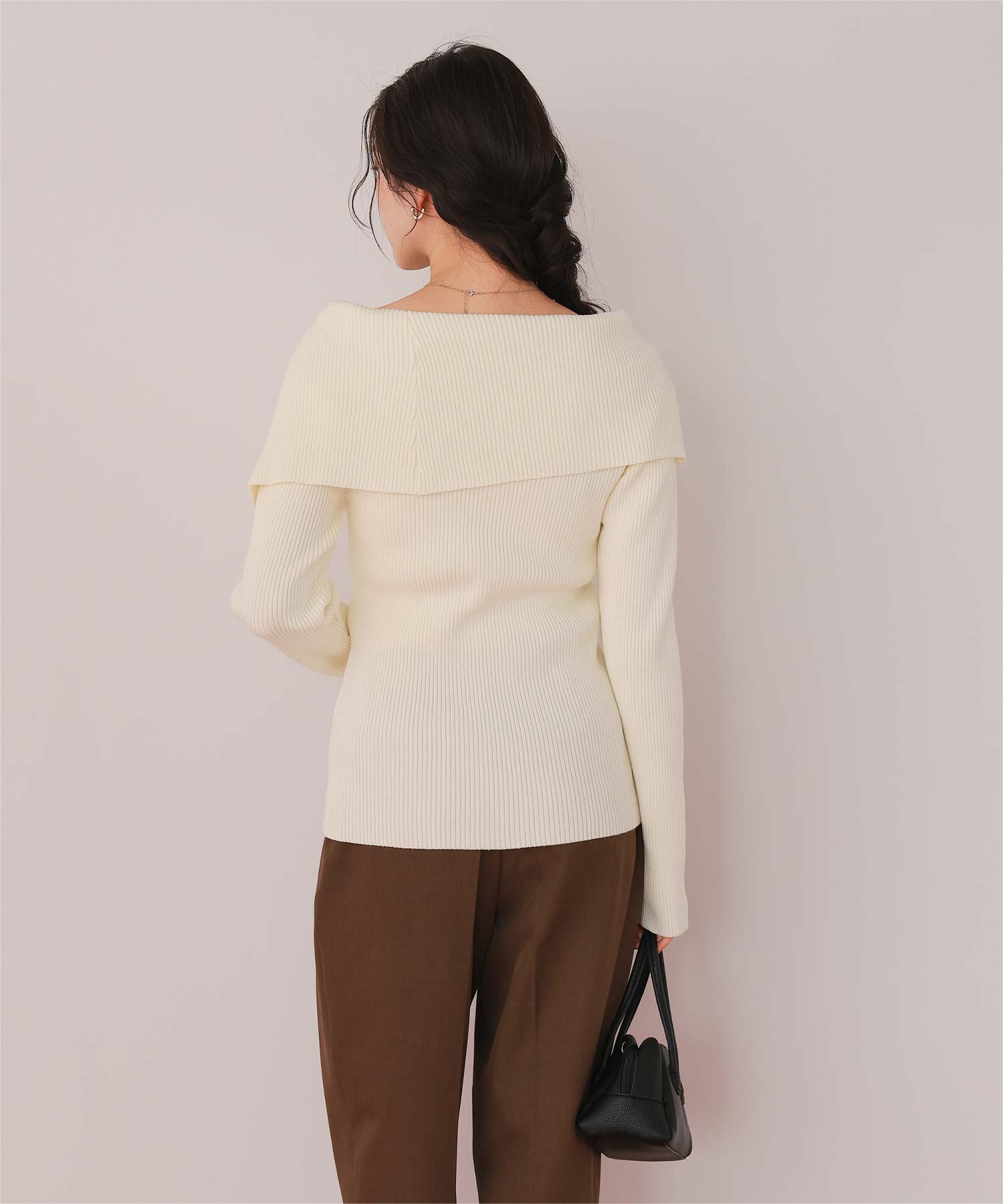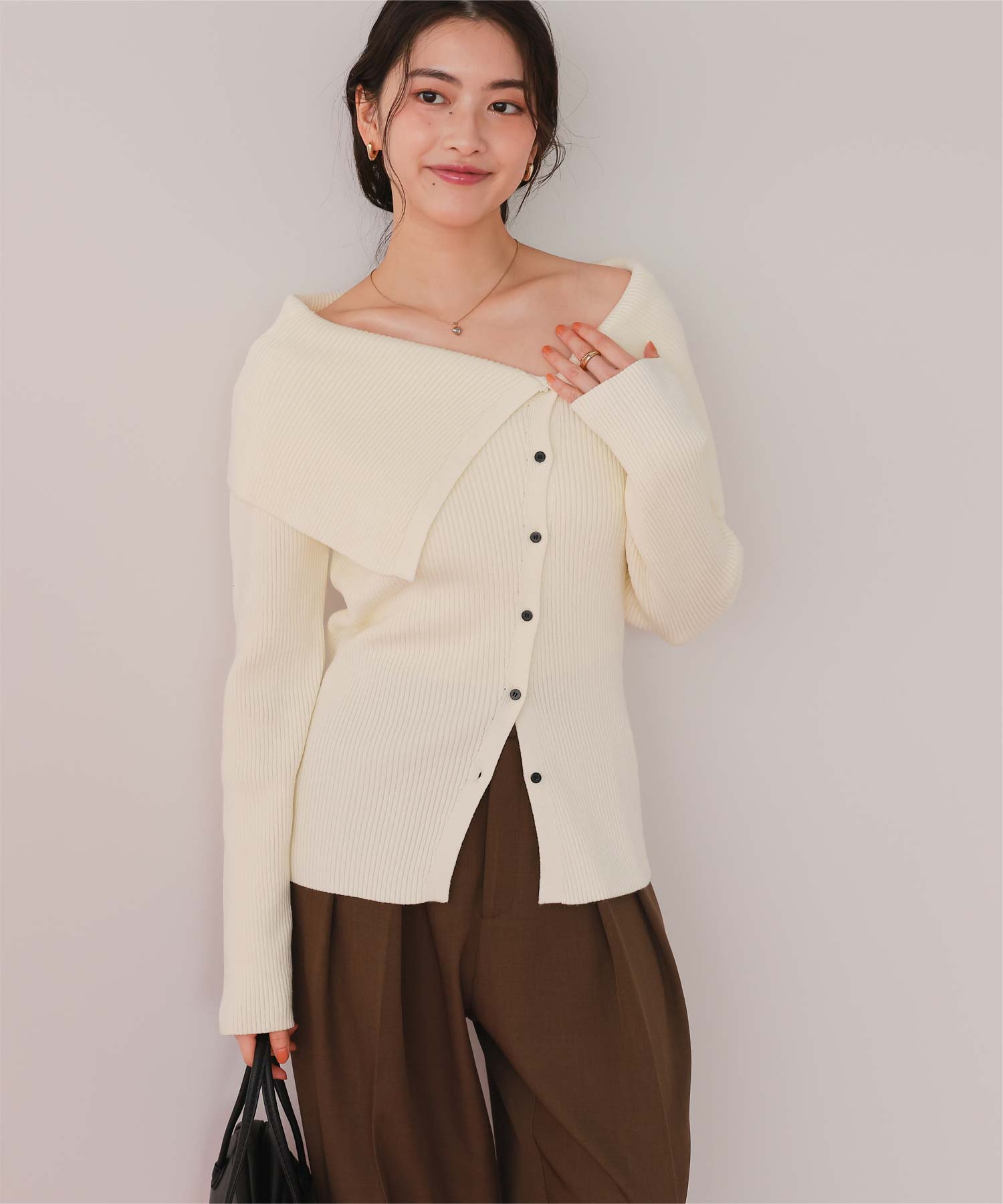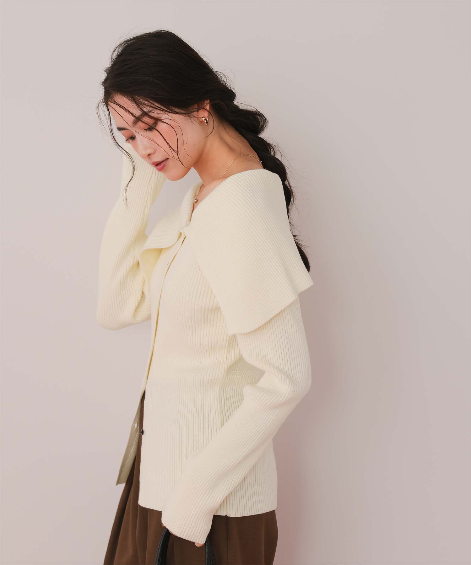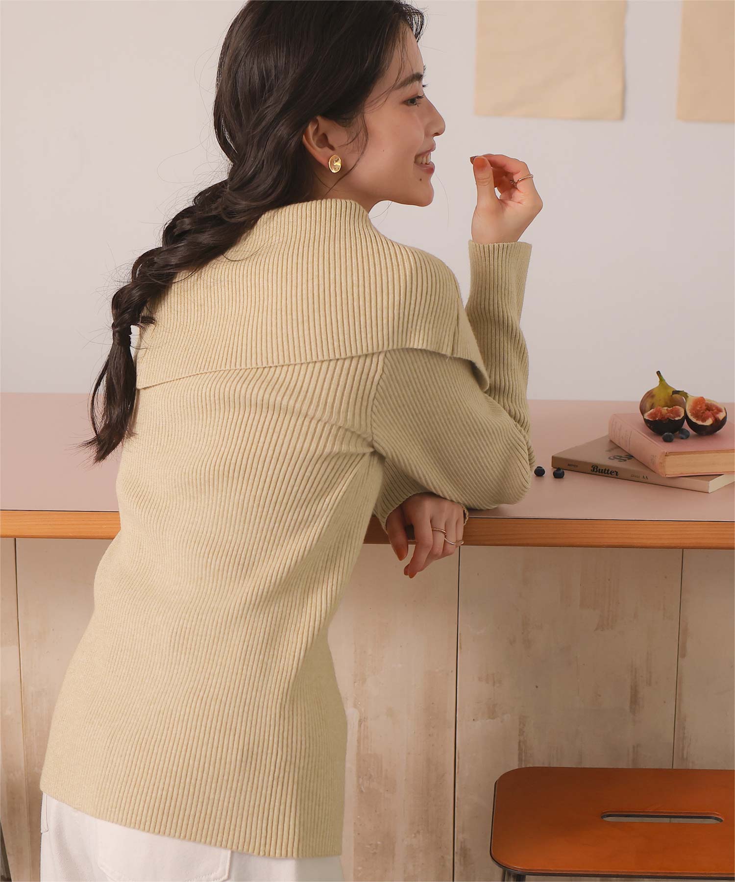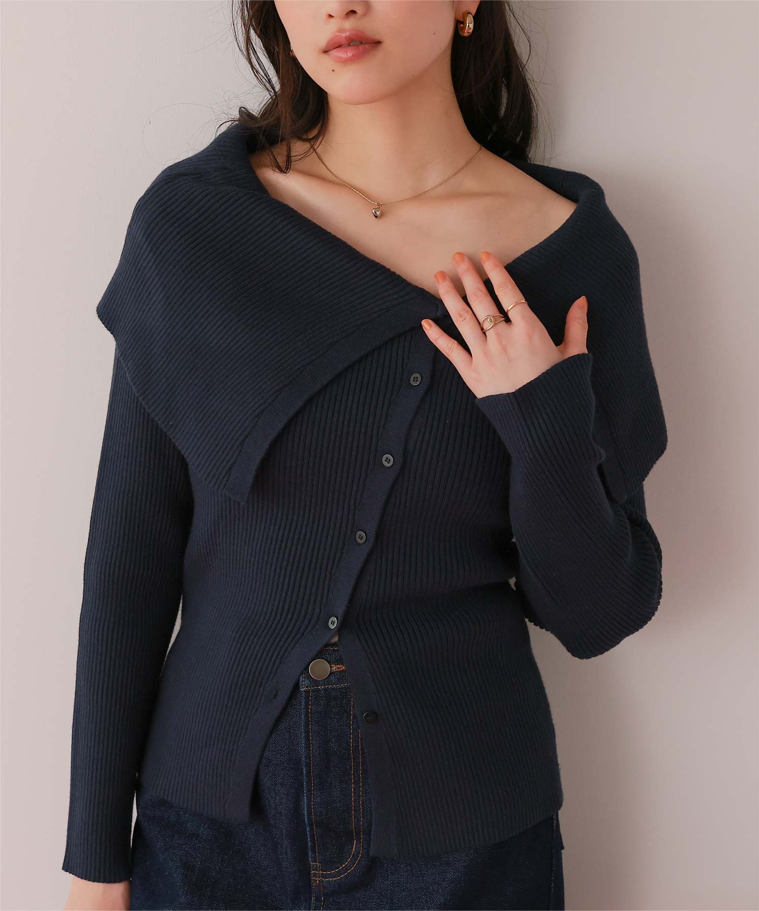 ・ショールのように肩にかかるデザインが印象的なニットトップス