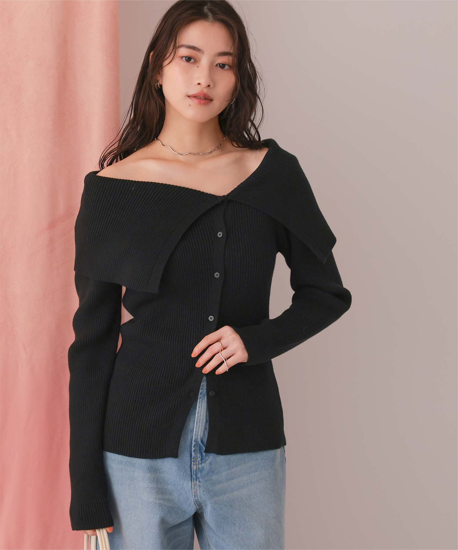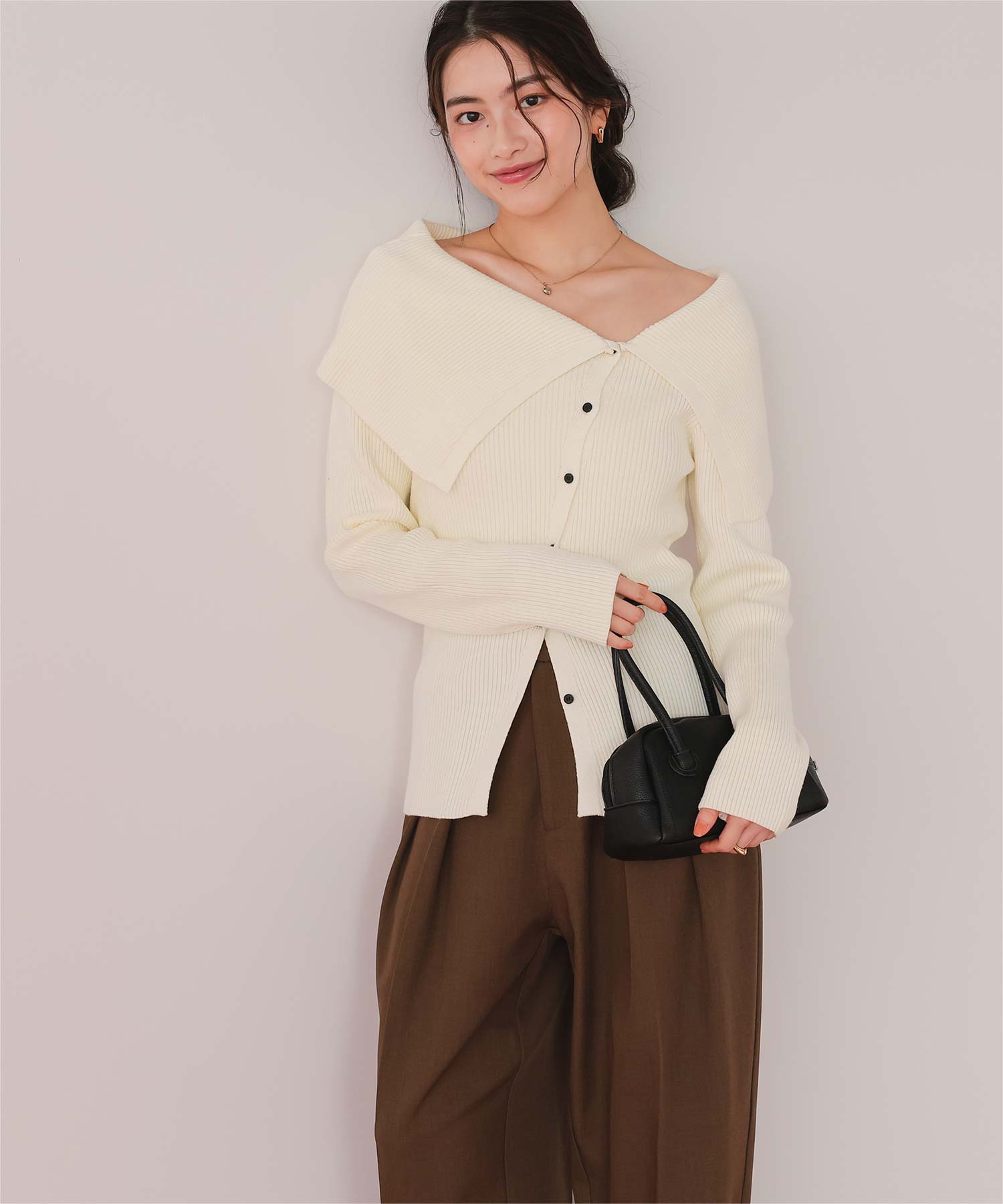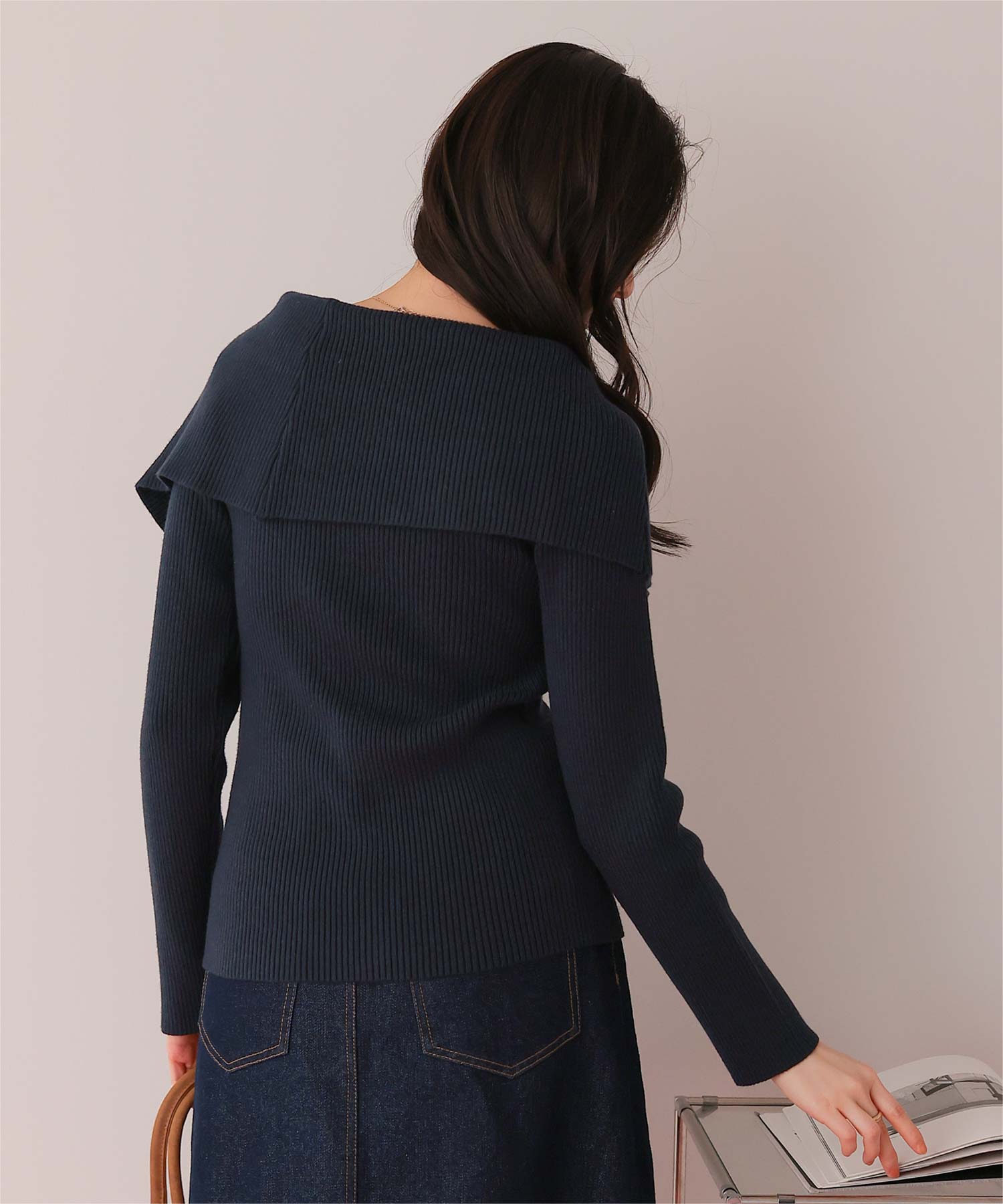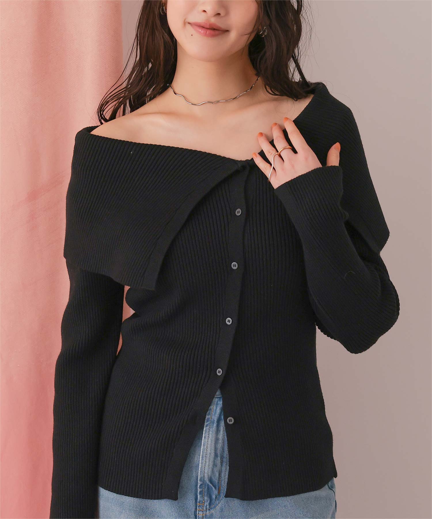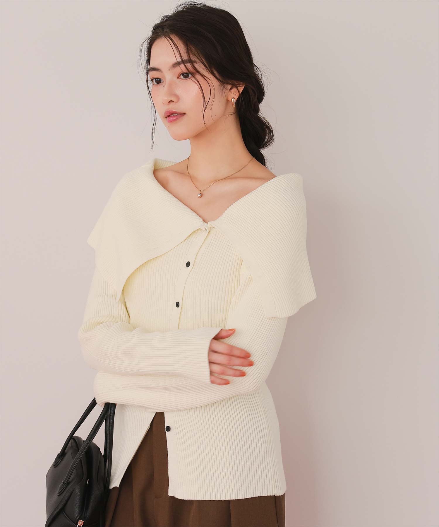 ・ショールのように肩にかかるデザインが印象的なニットトップス