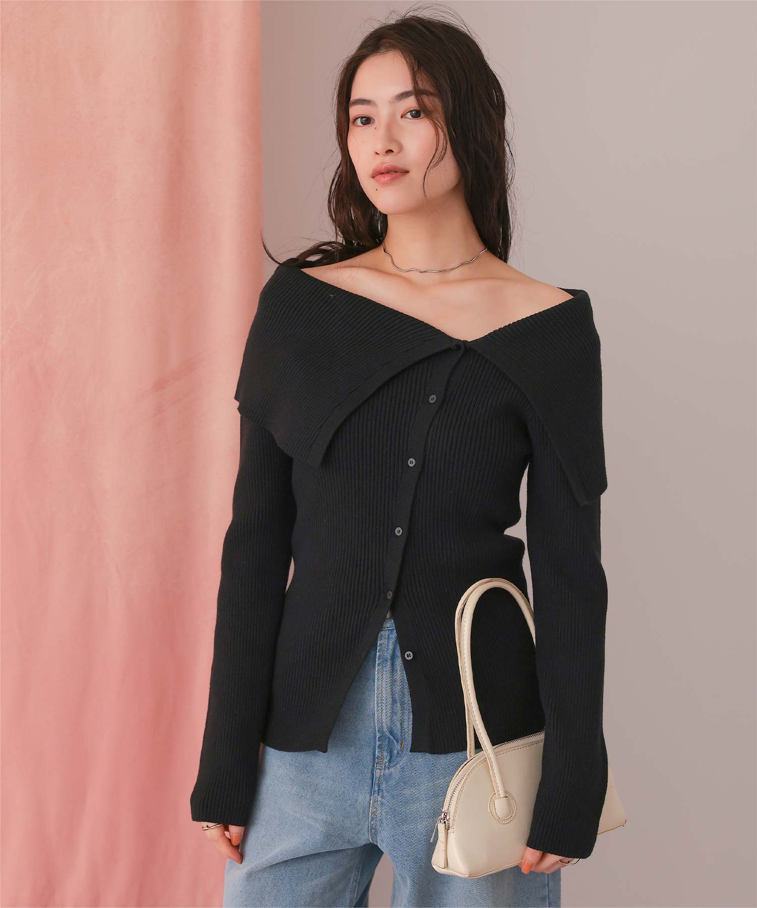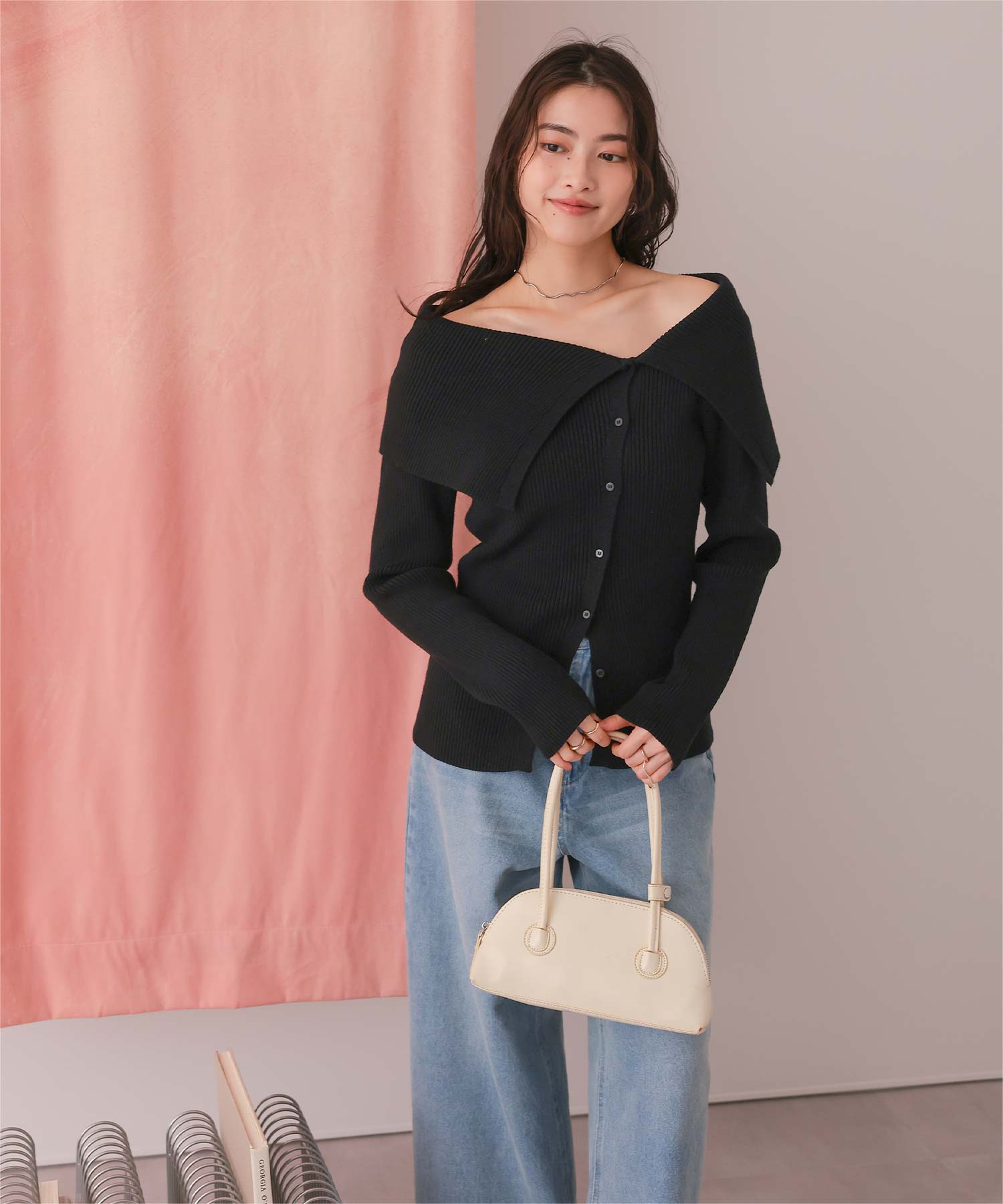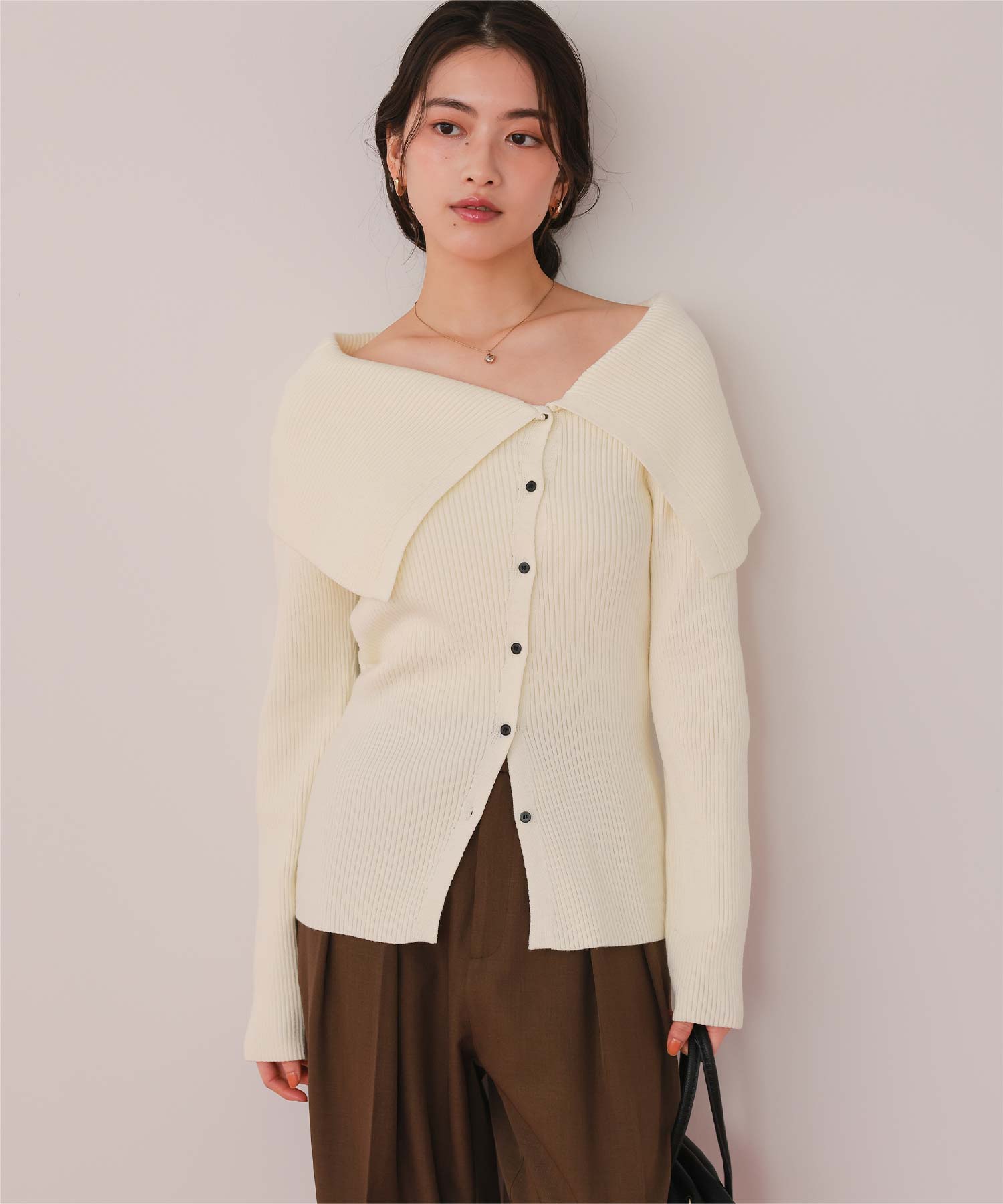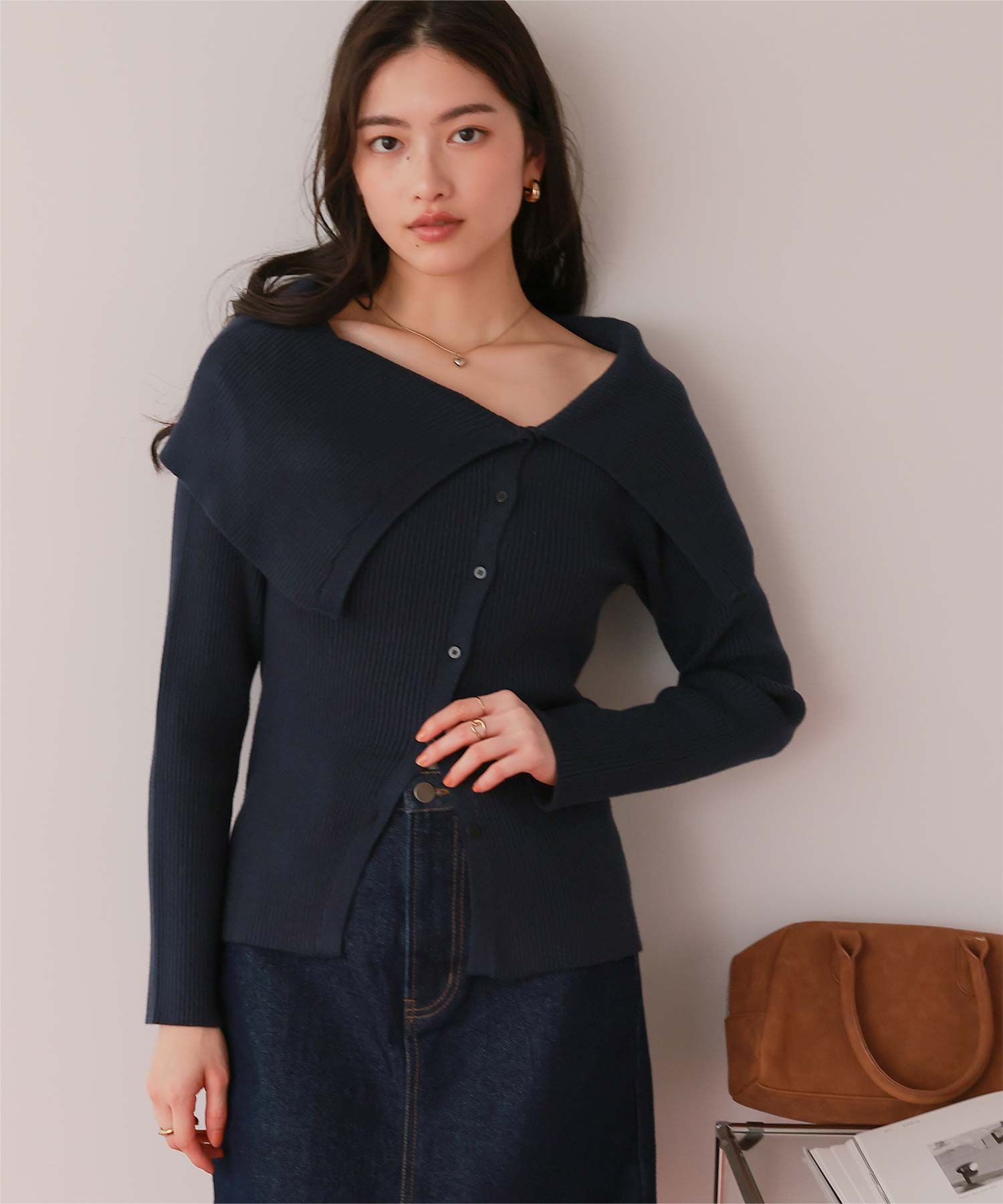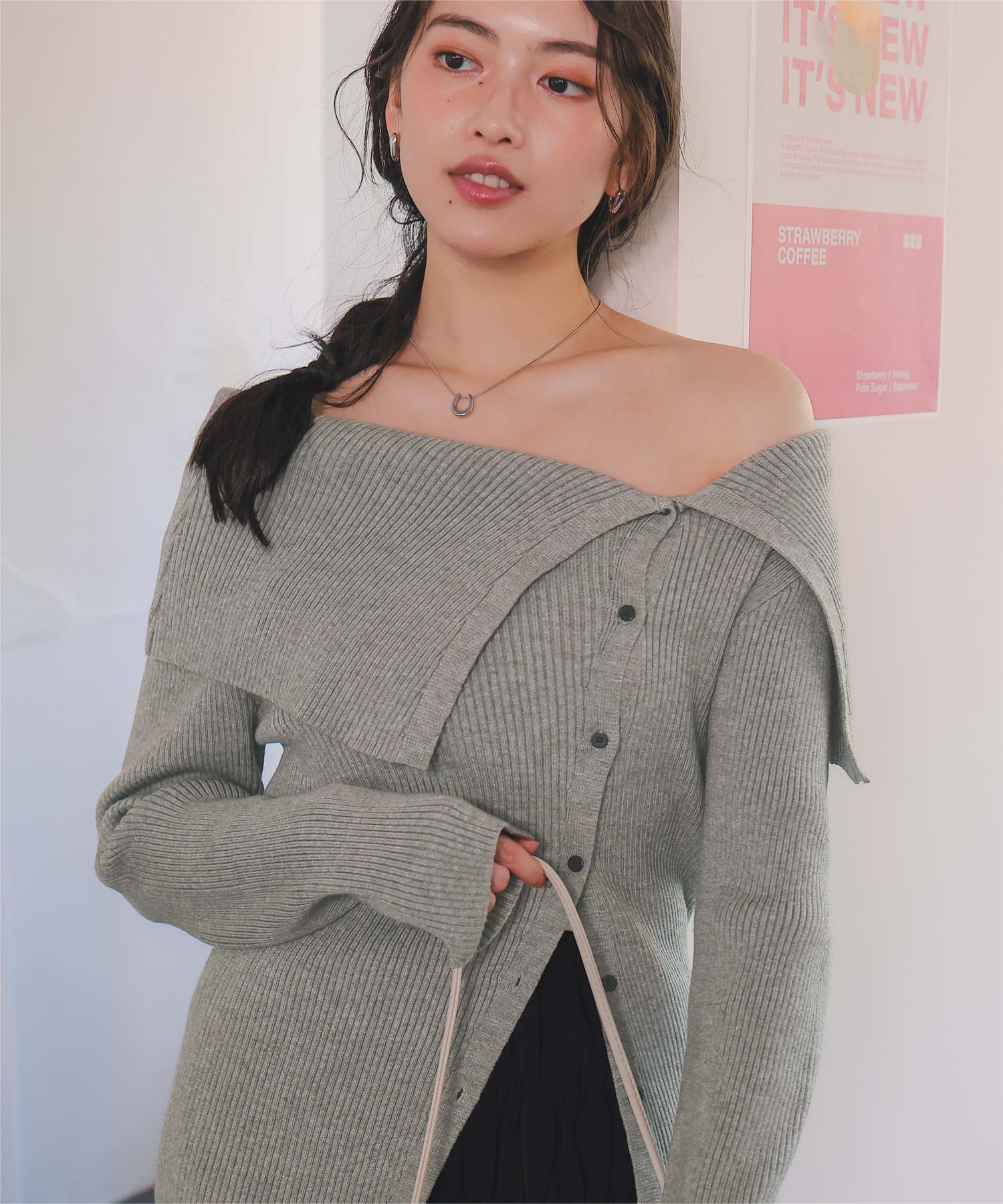 ・ショールのように肩にかかるデザインが印象的なニットトップス