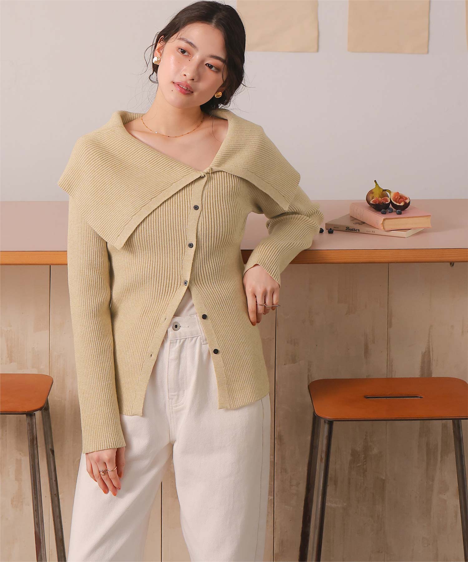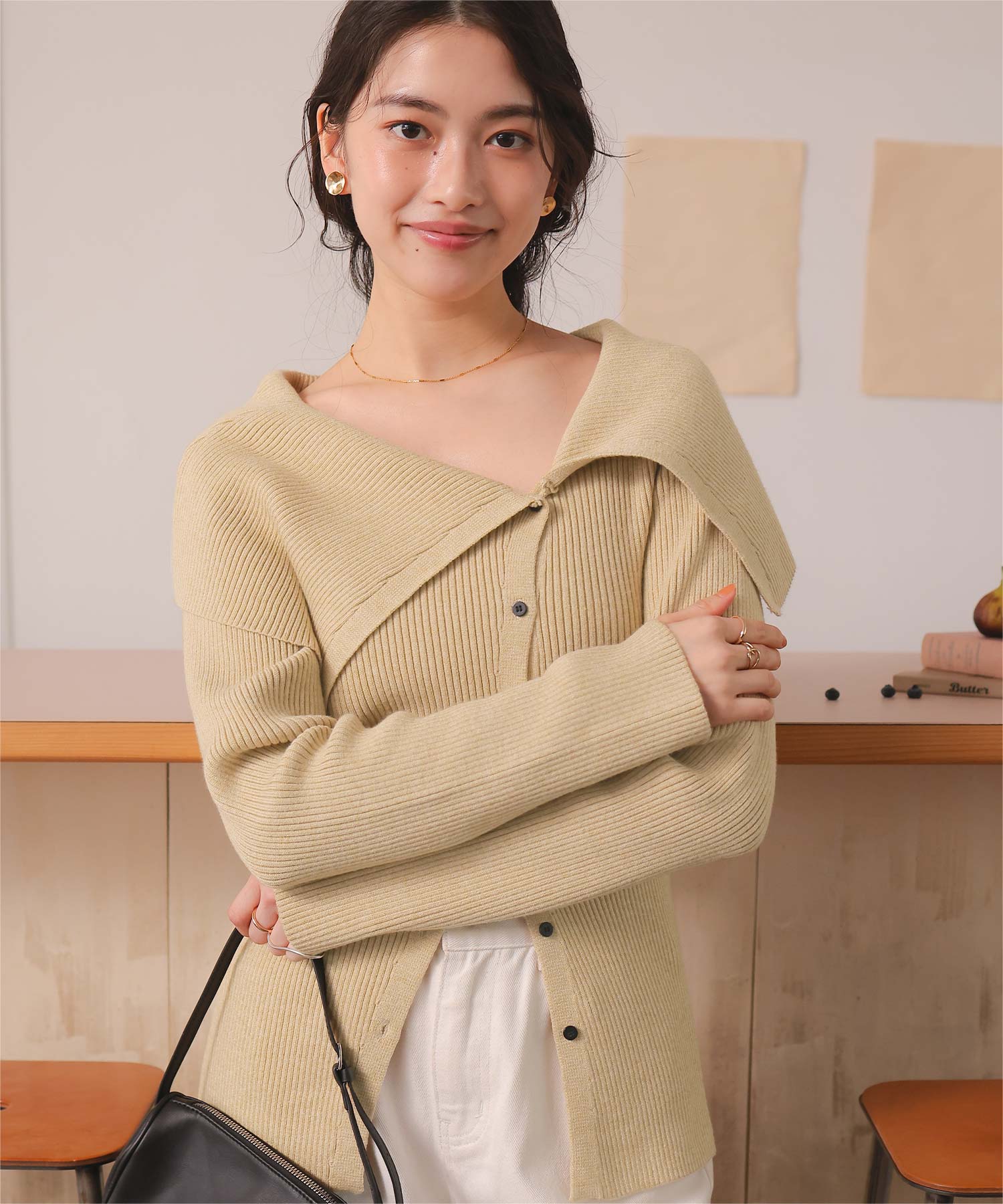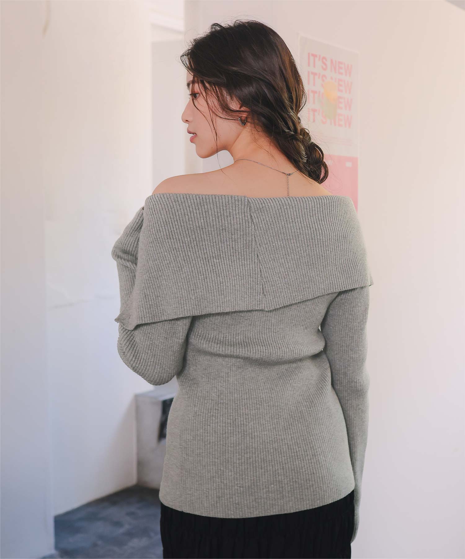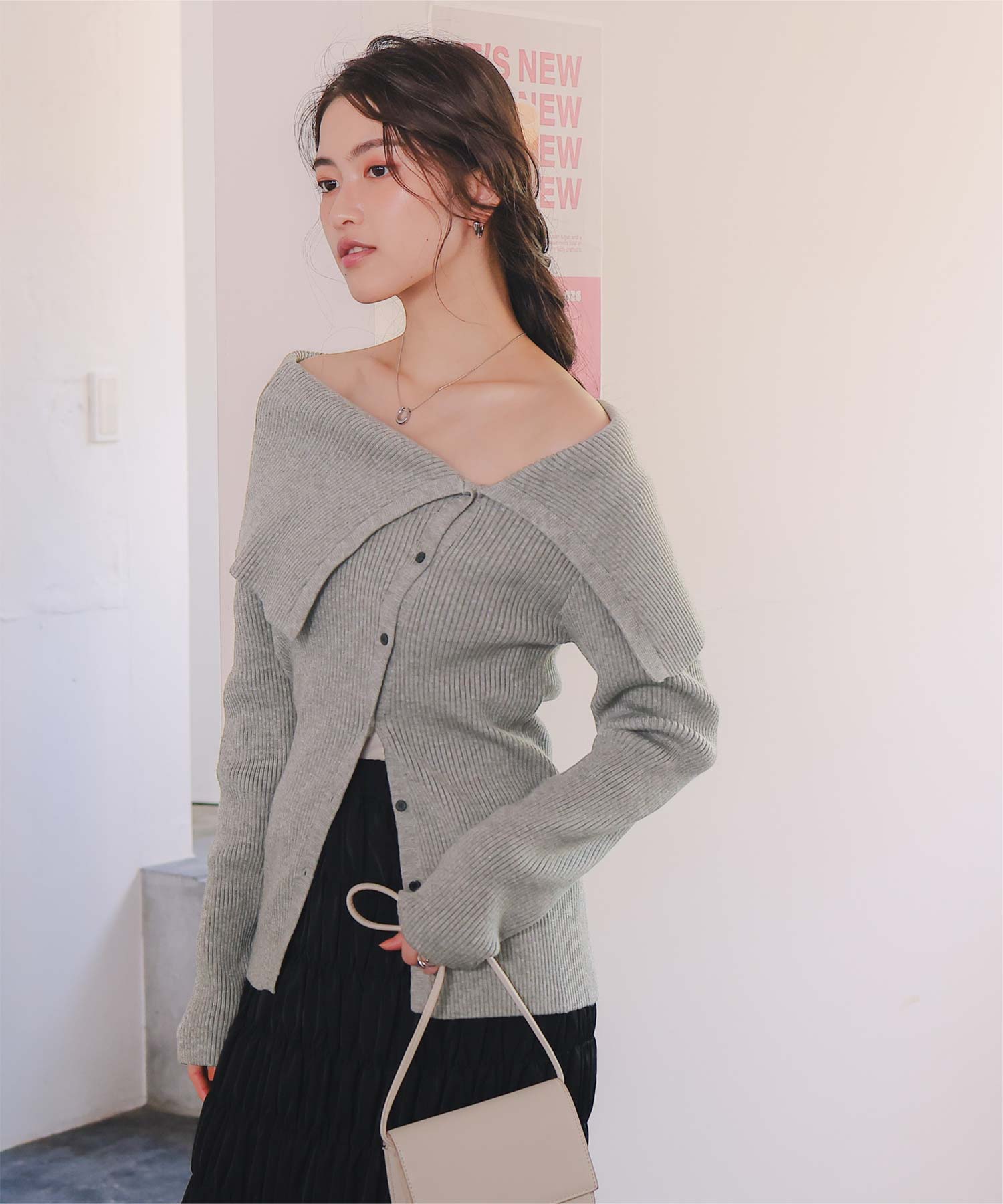 ・ショールのように肩にかかるデザインが印象的なニットトップス