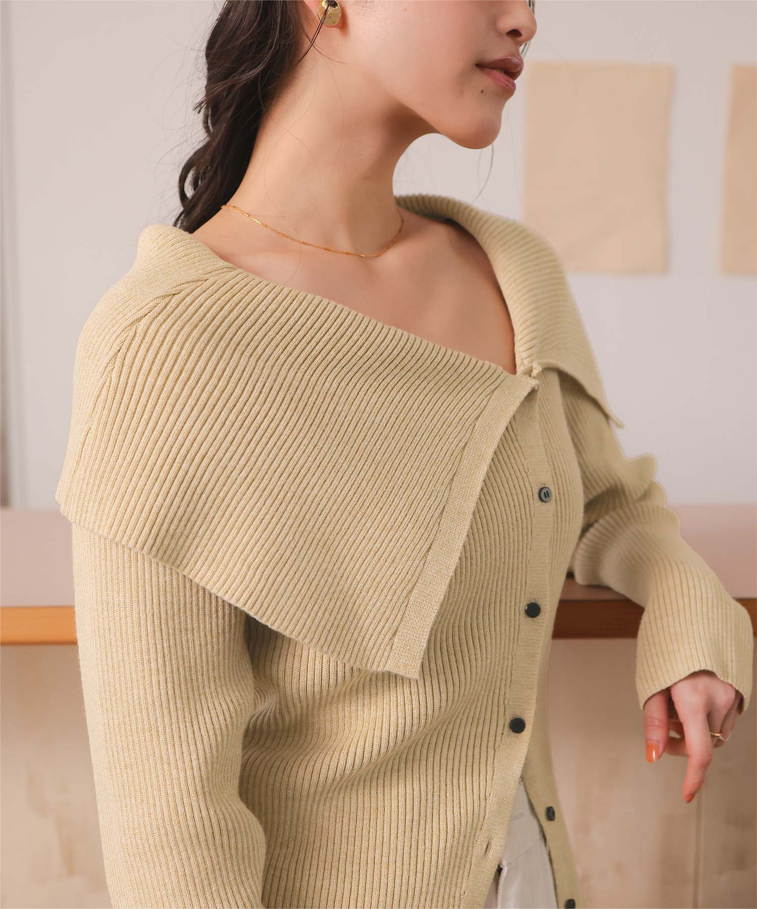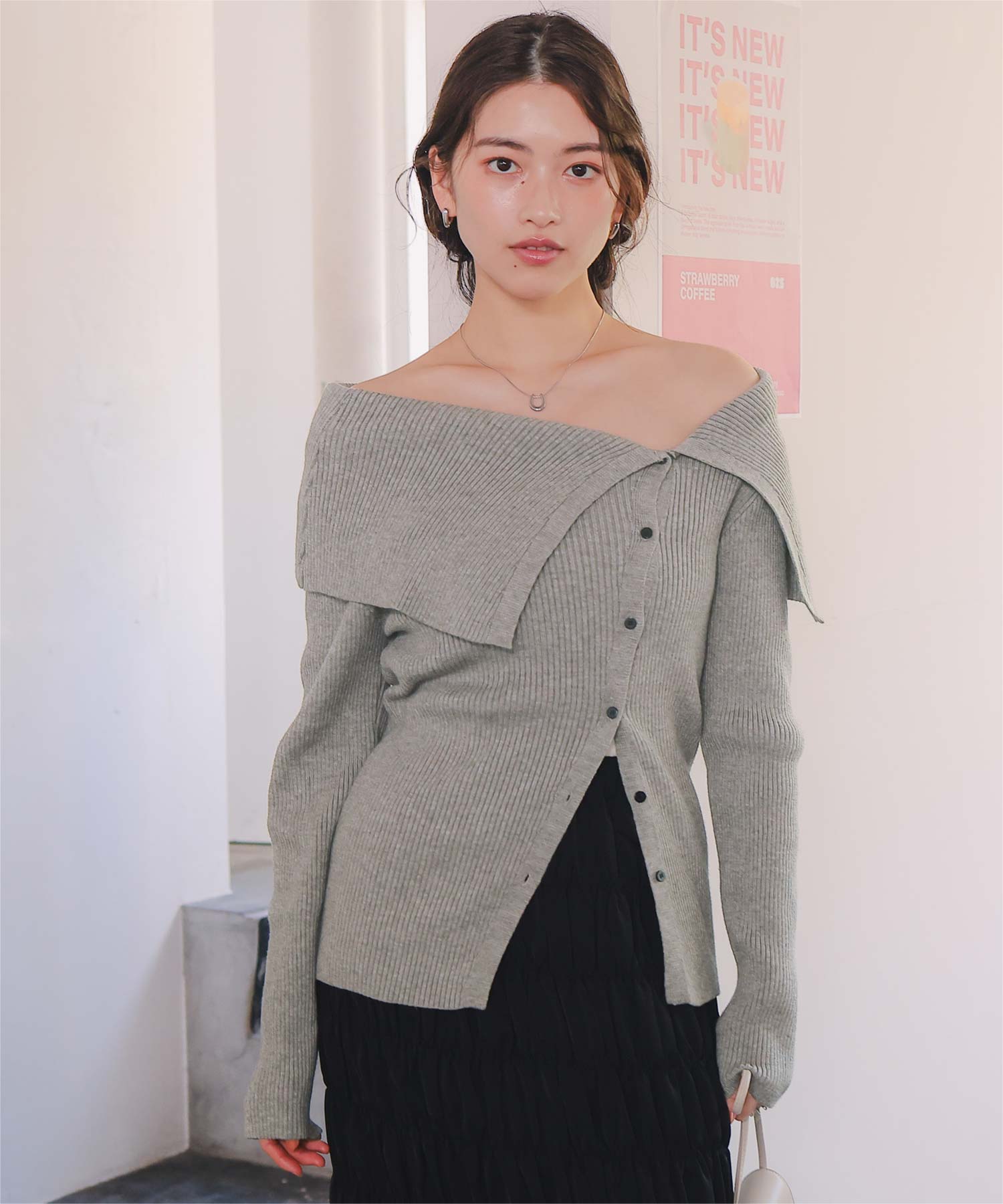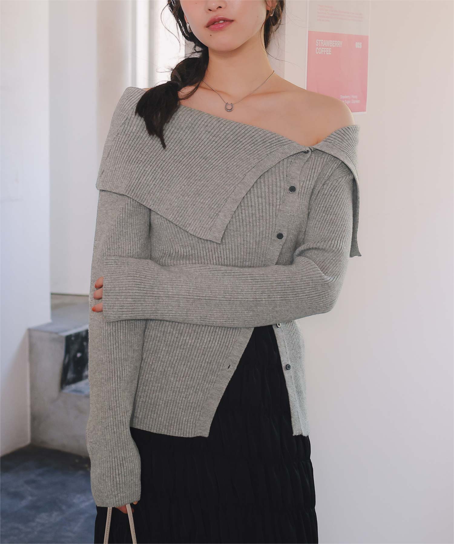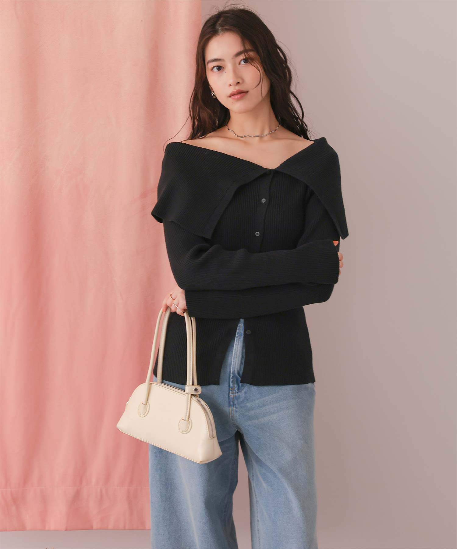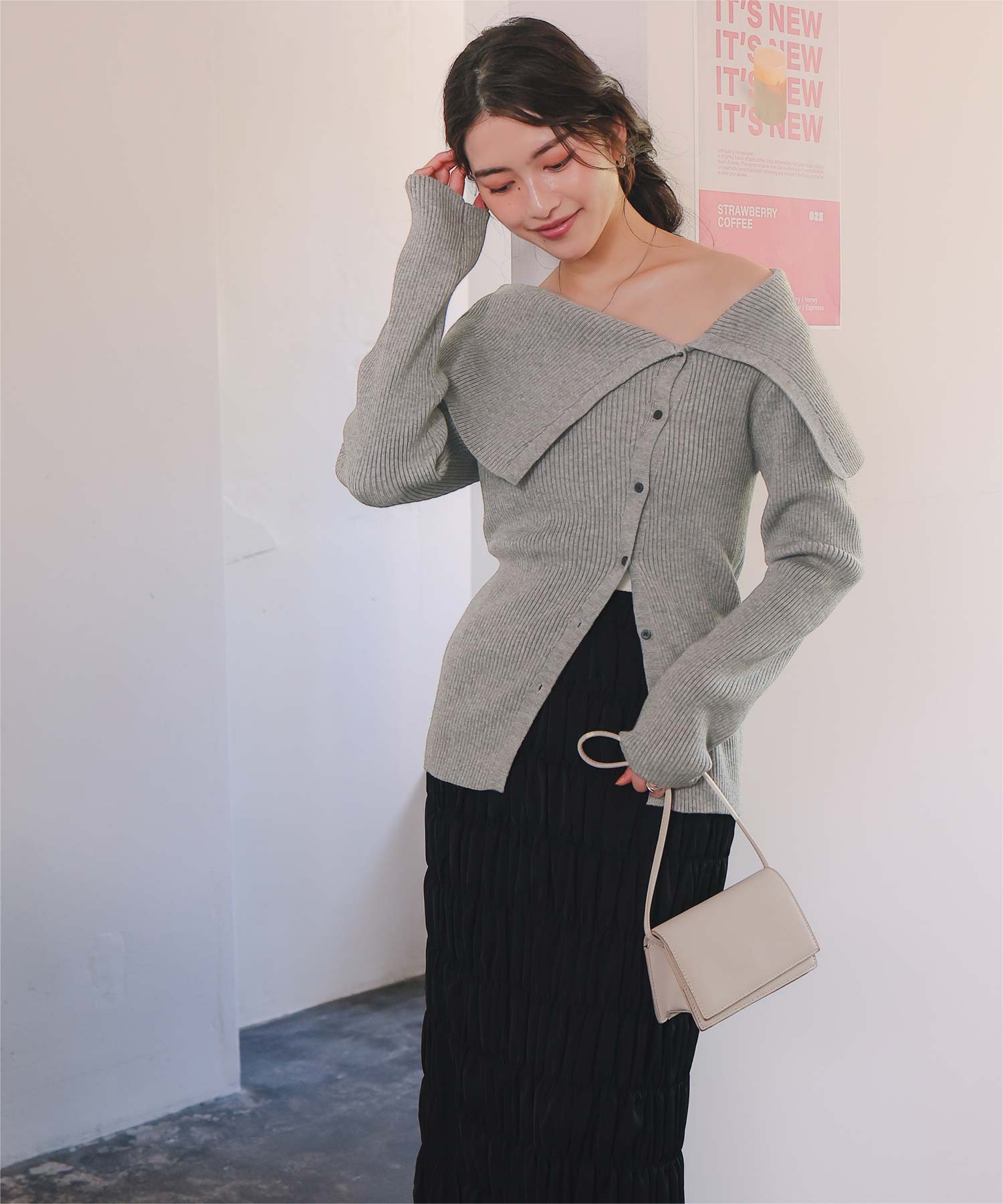 ・ショールのように肩にかかるデザインが印象的なニットトップス