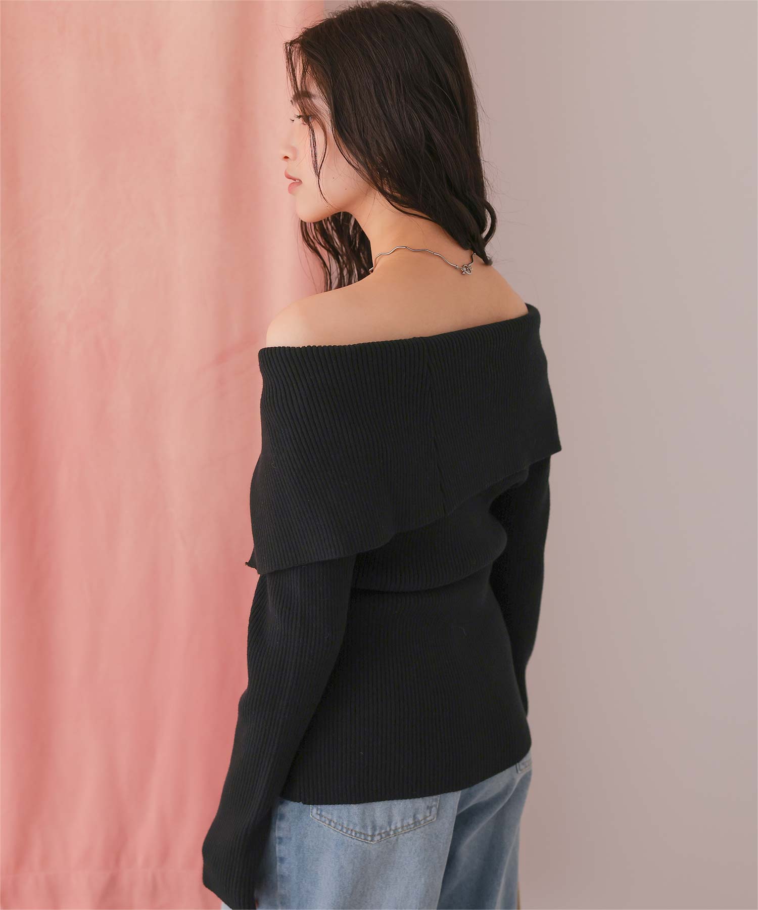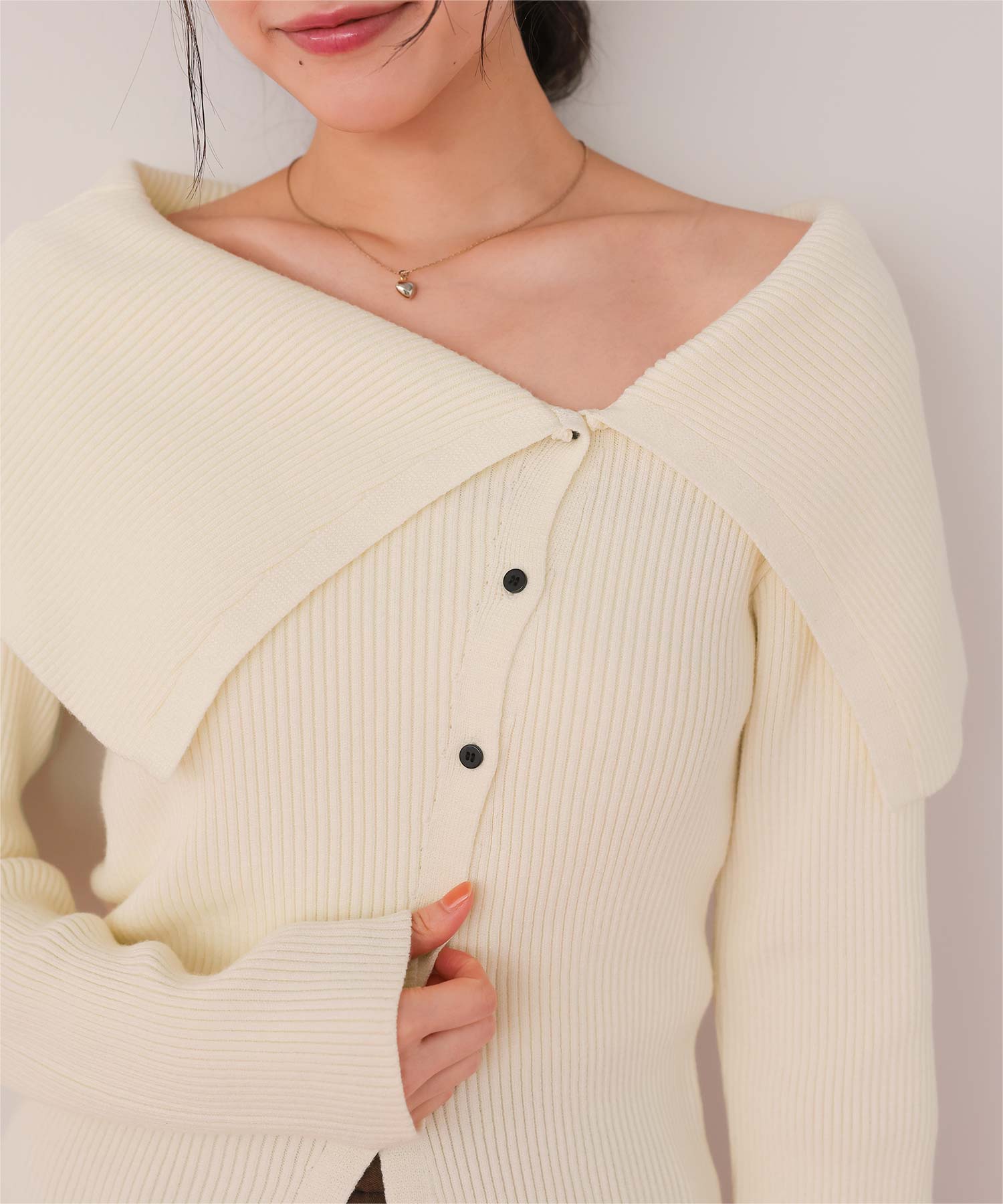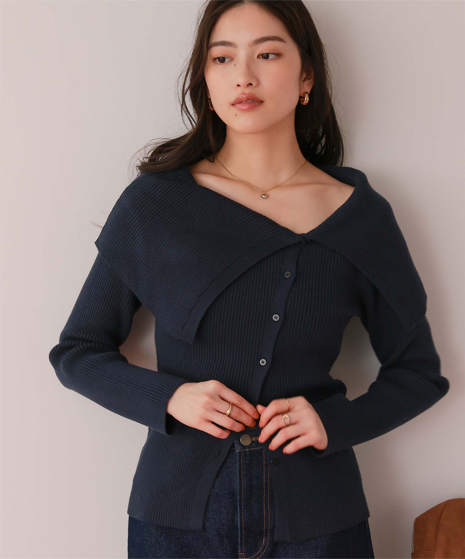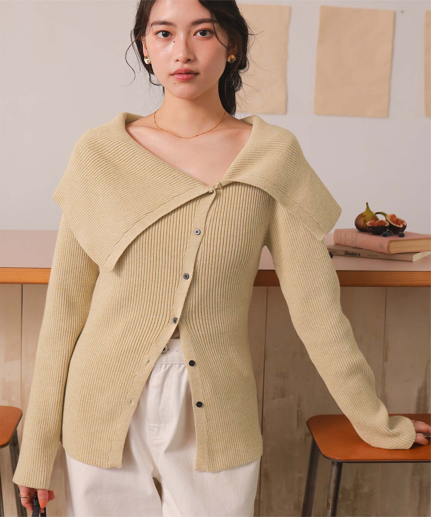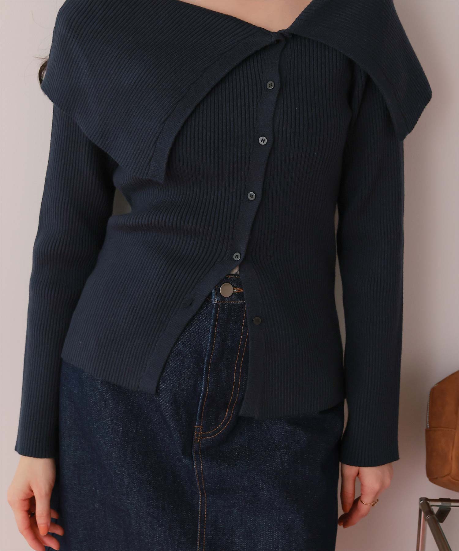・ショールのように肩にかかるデザインが印象的なニットトップス