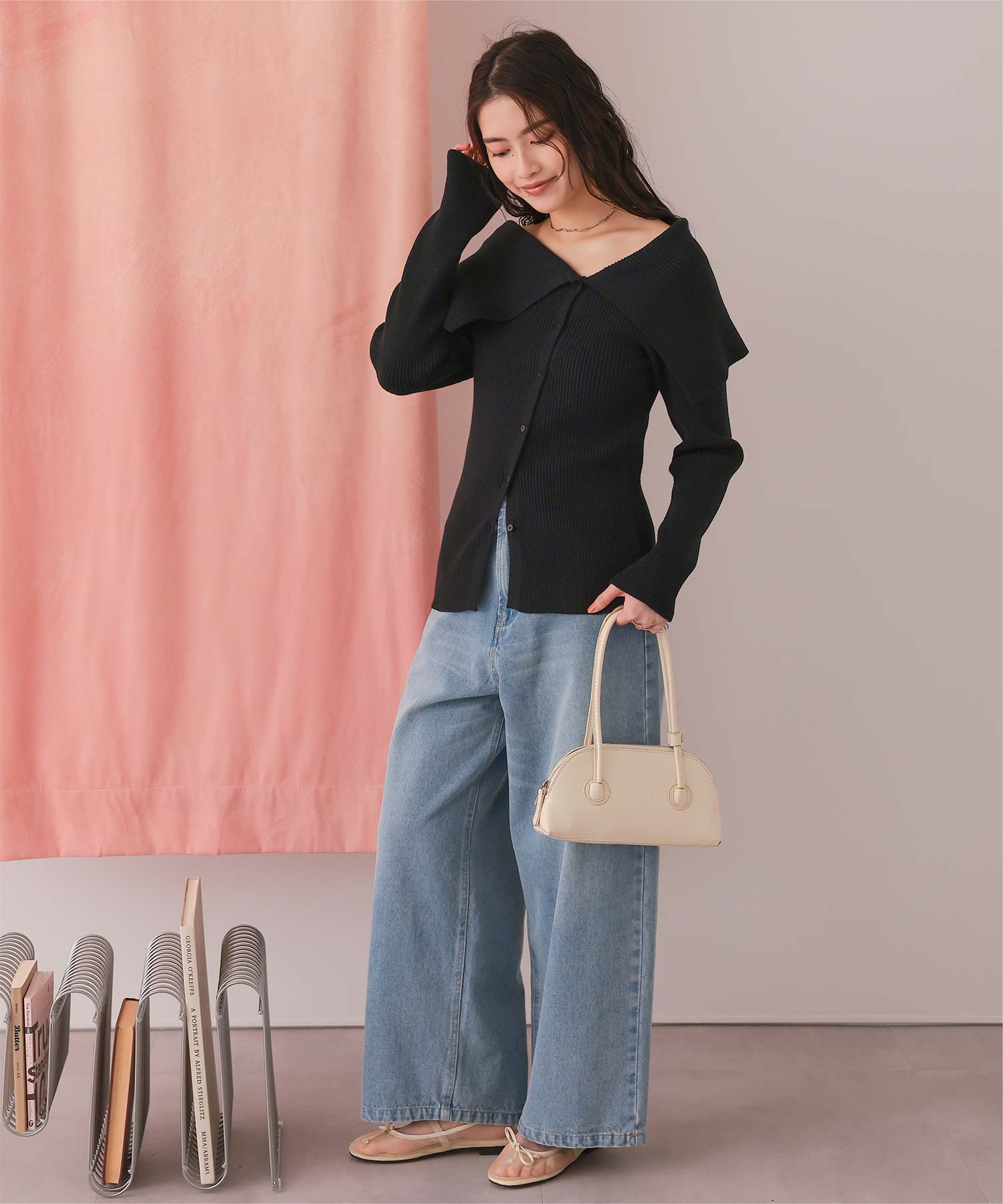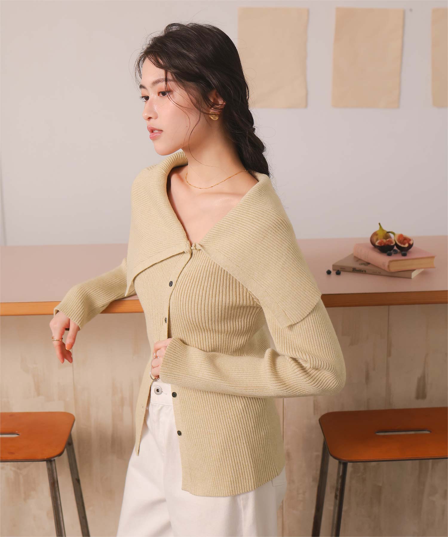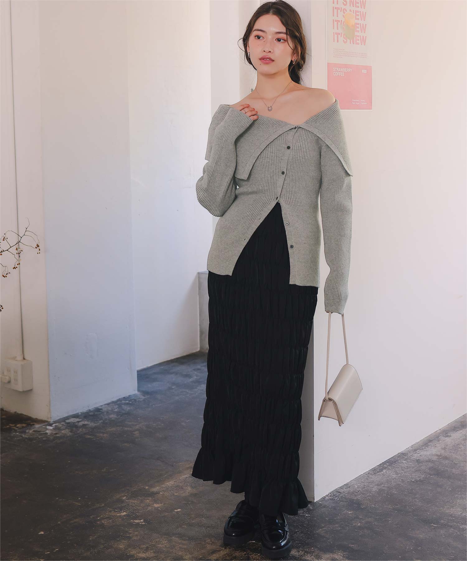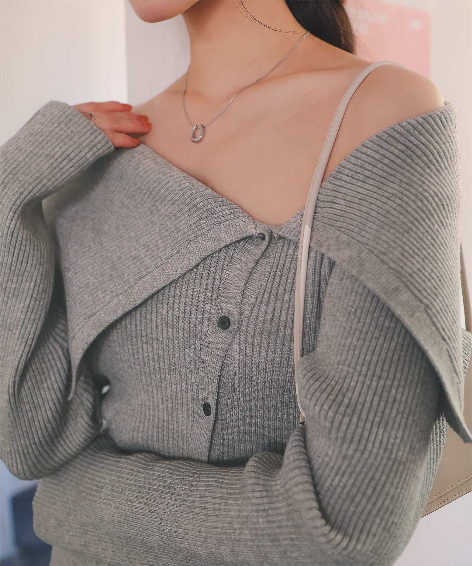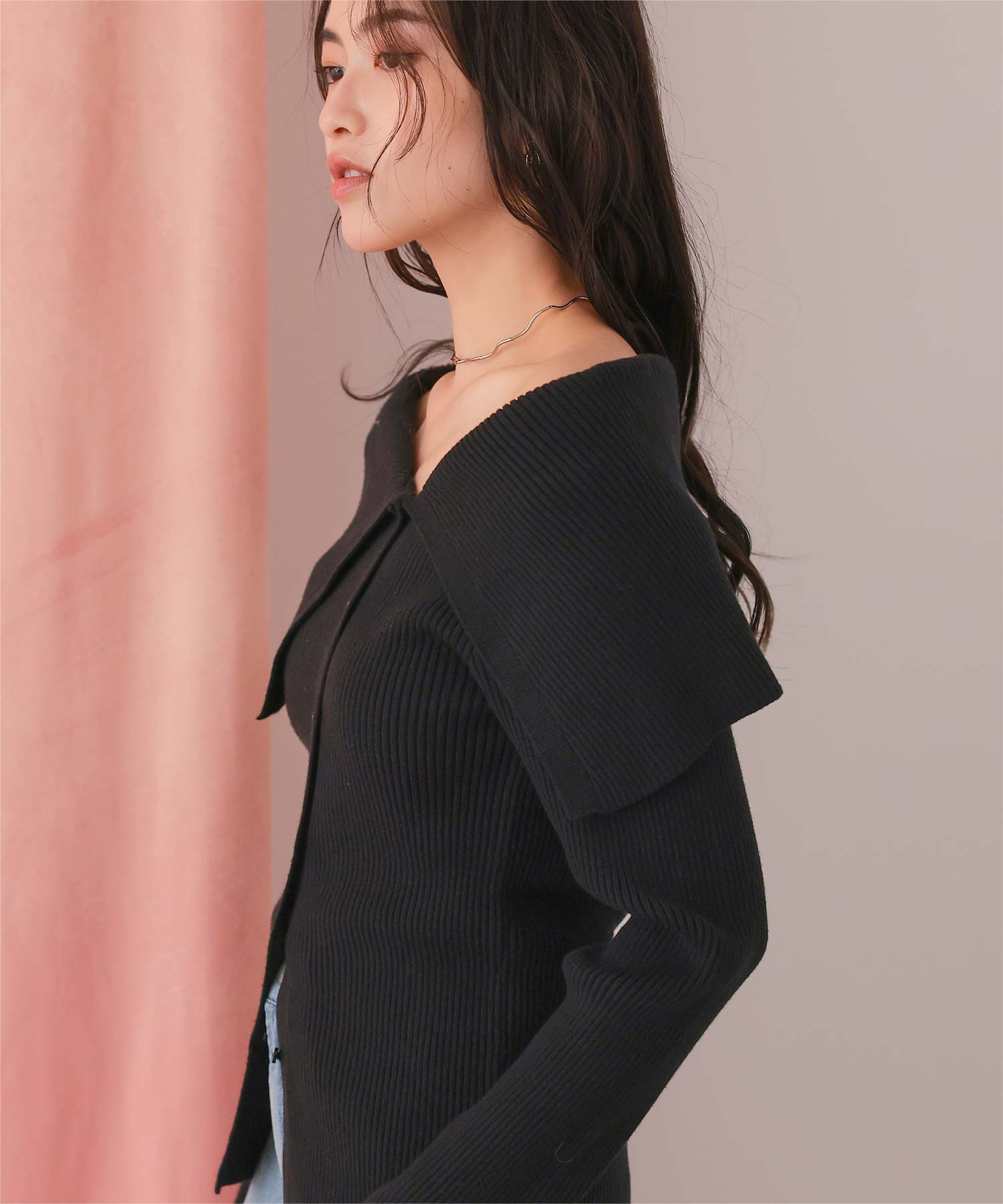 ・ショールのように肩にかかるデザインが印象的なニットトップス