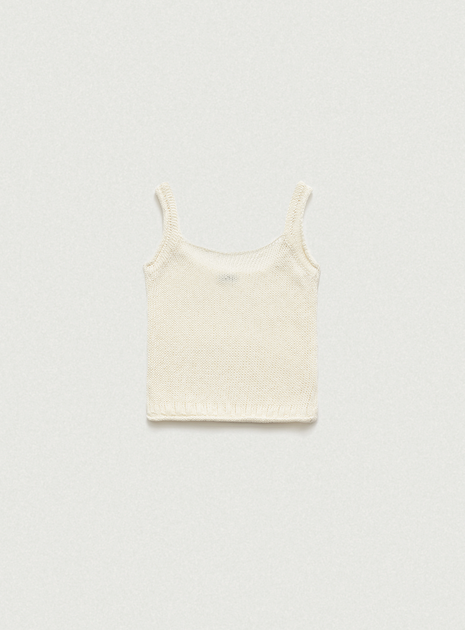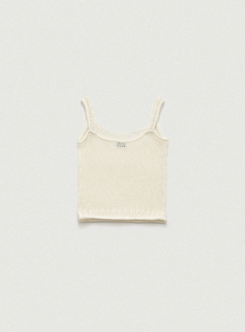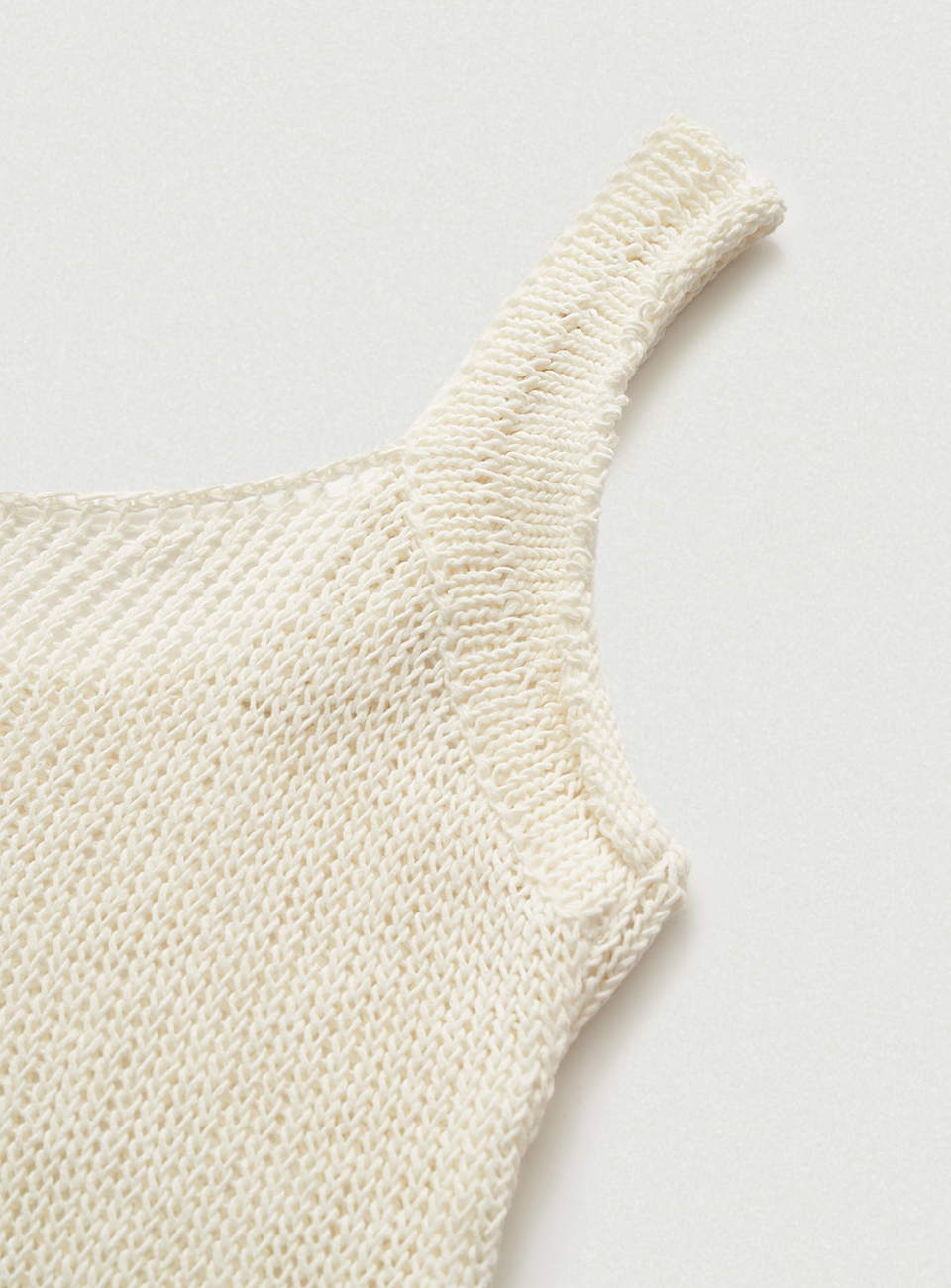 ナチュラルなシルエットを演出するスクエアネックラインと薄いショルダーストラップ