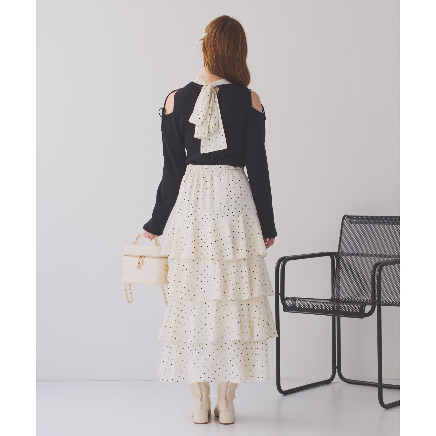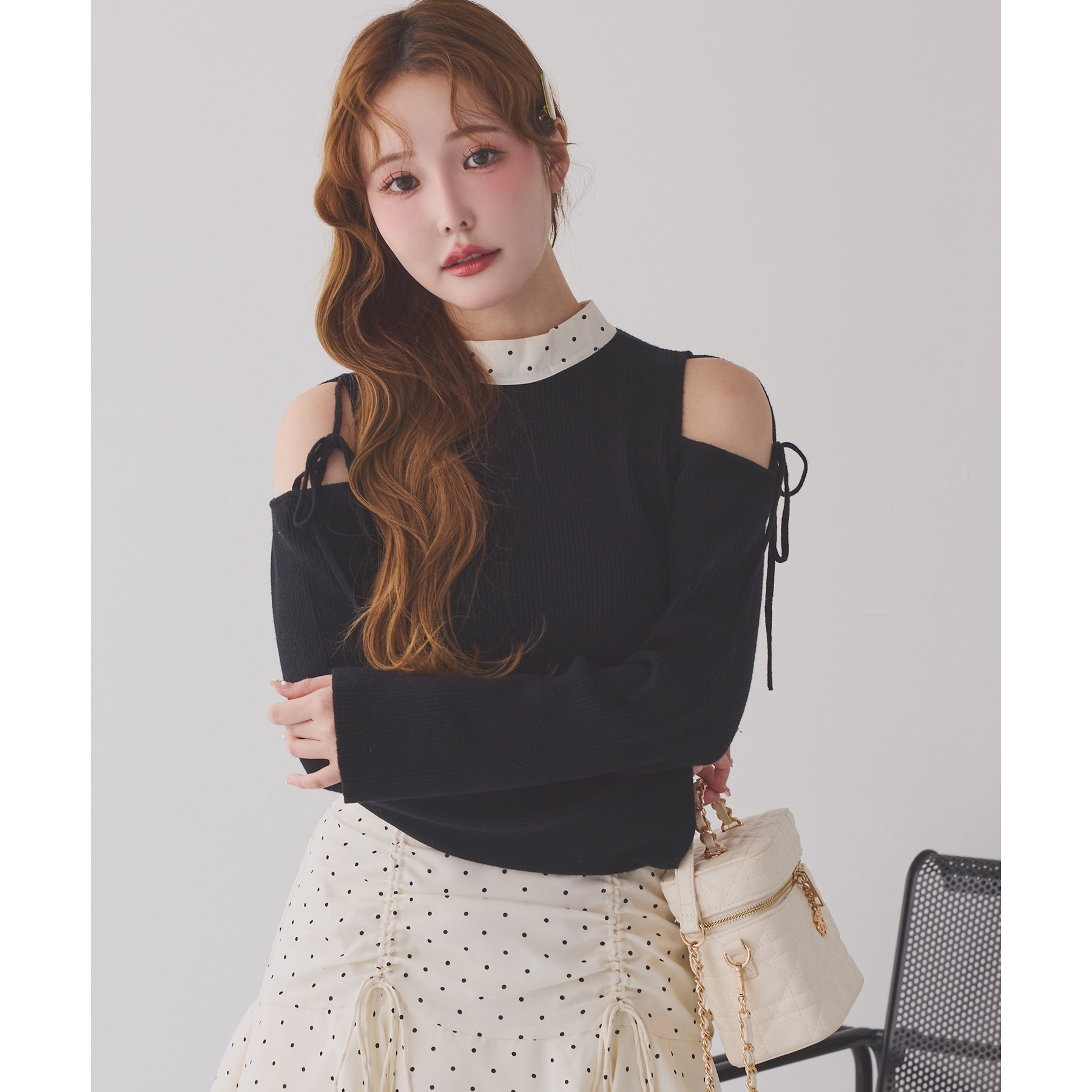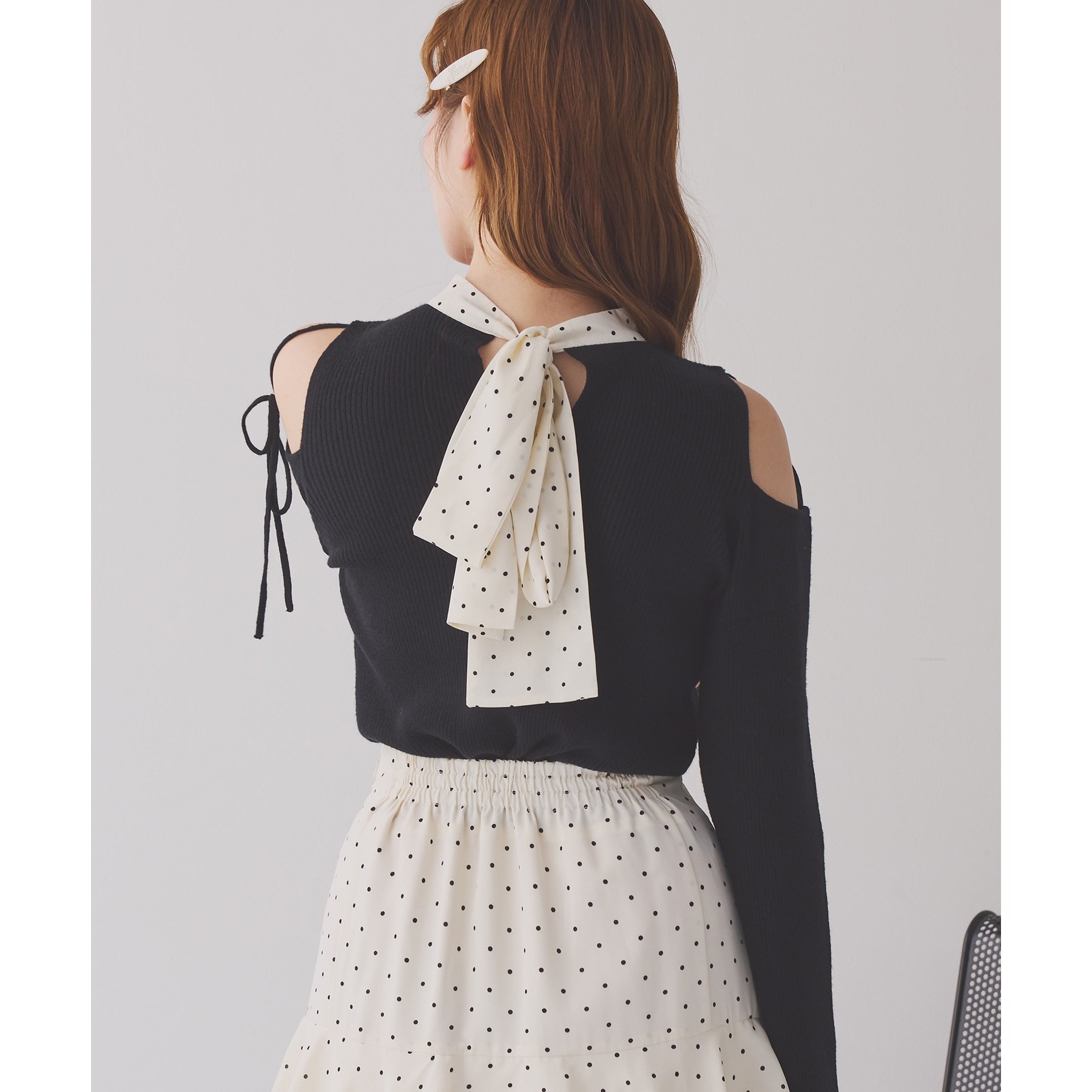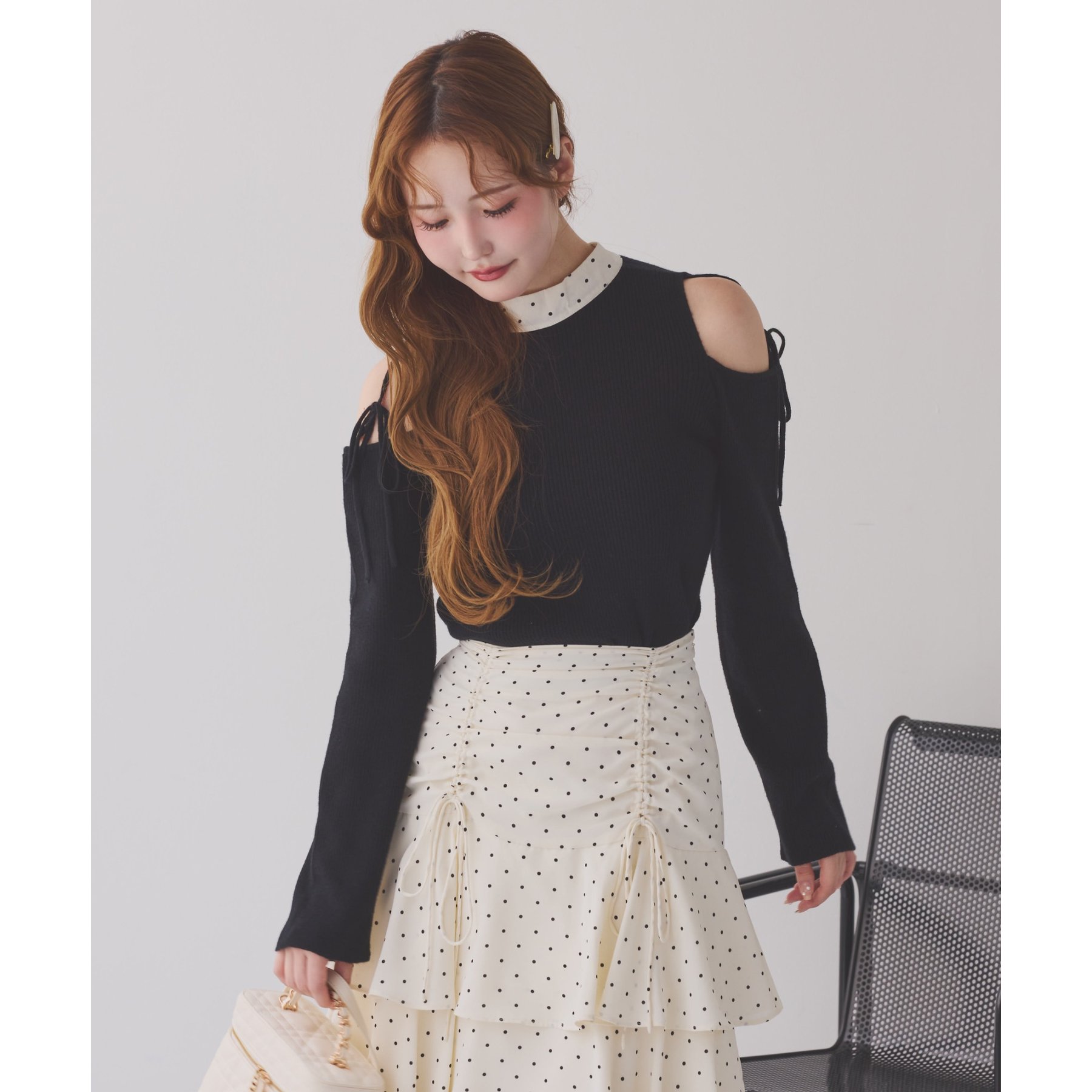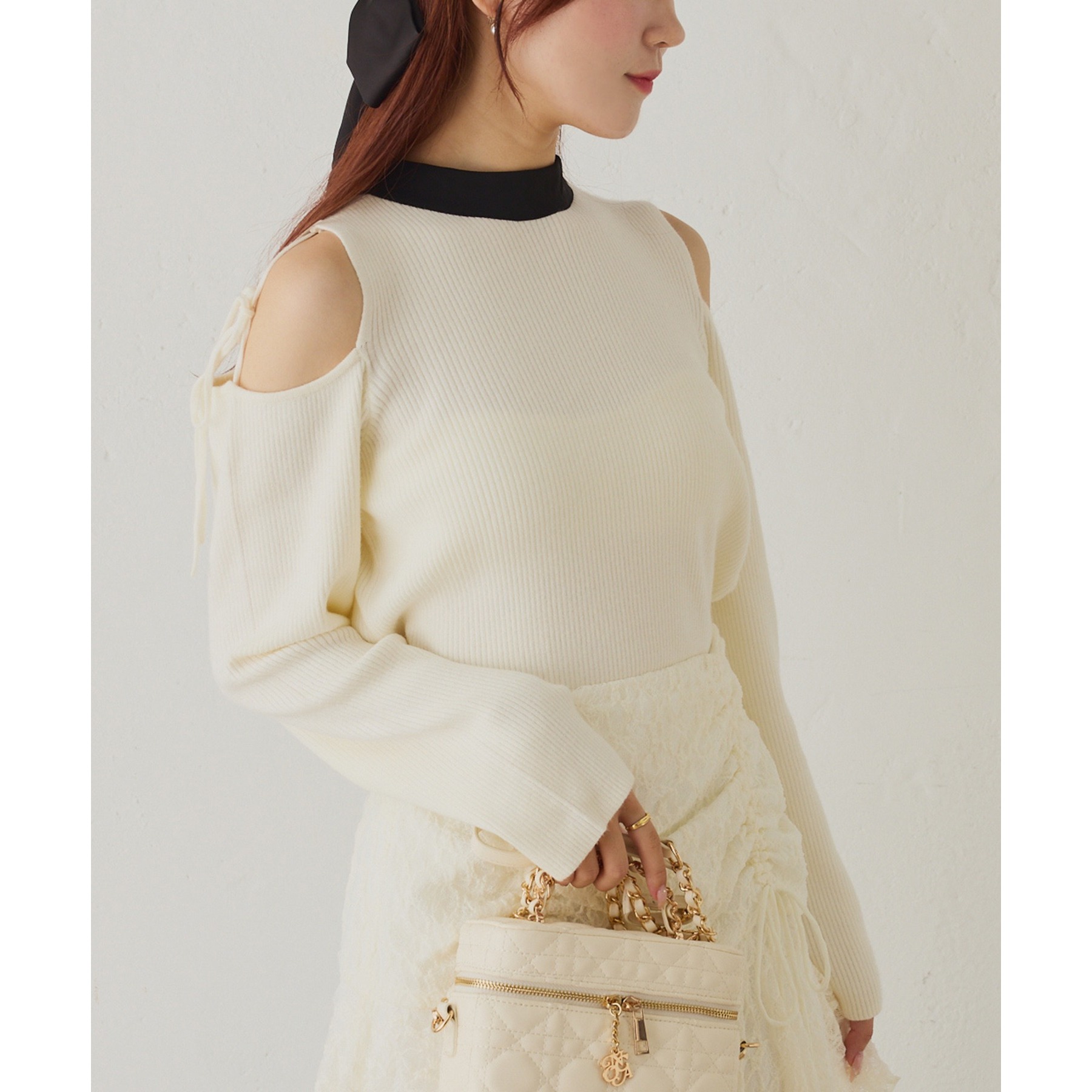 肩あきのデザインが女性らしさを引き立てつつ、