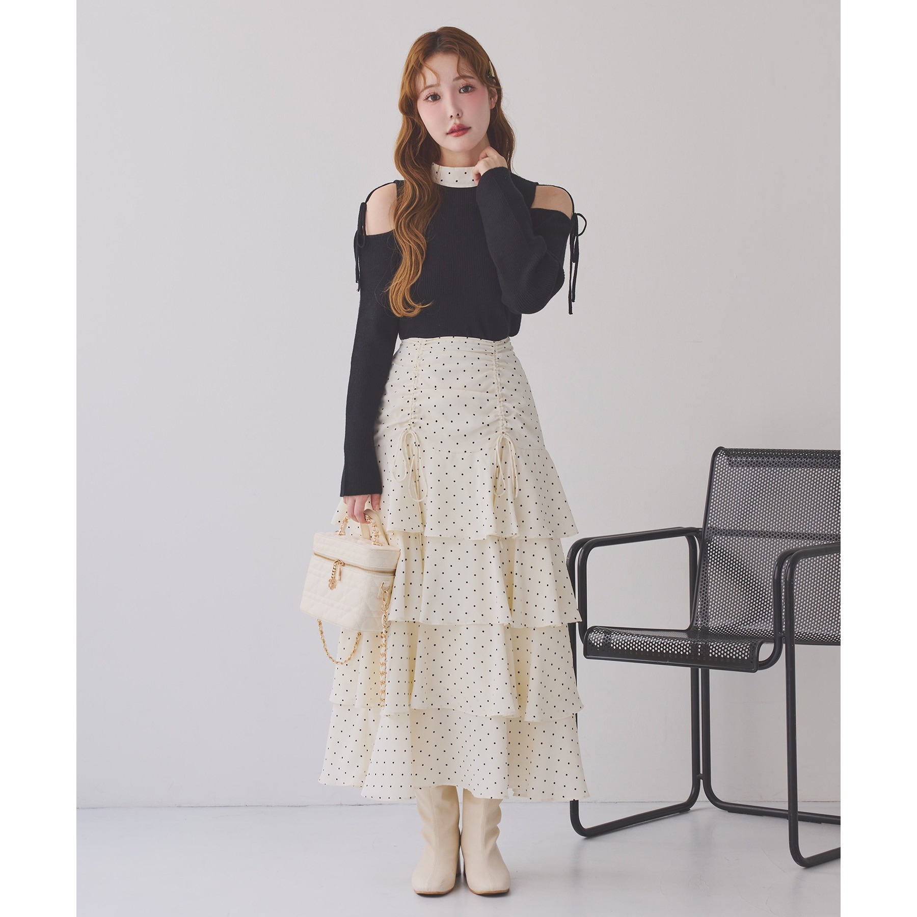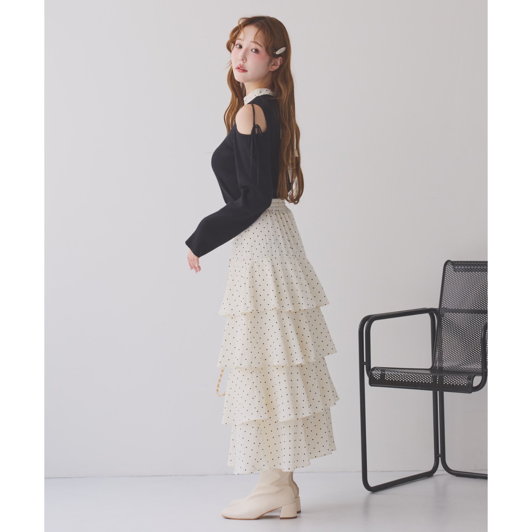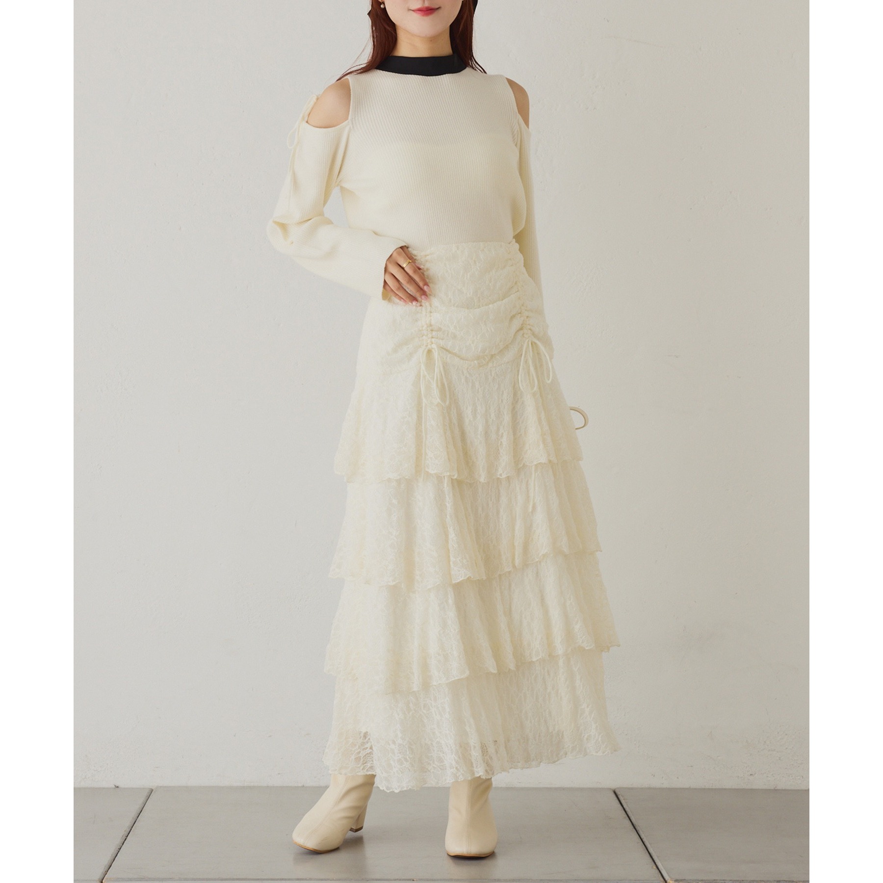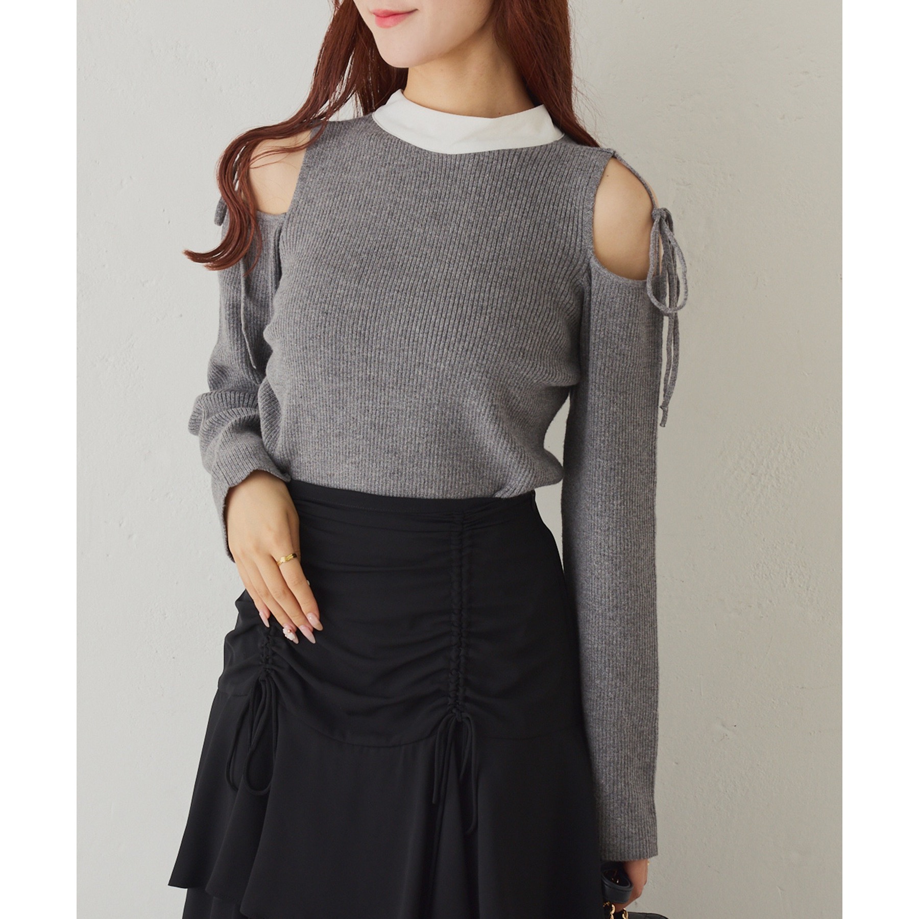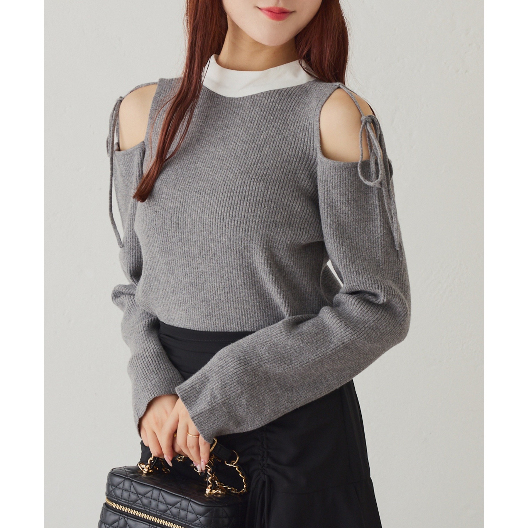 肩あきのデザインが女性らしさを引き立てつつ、