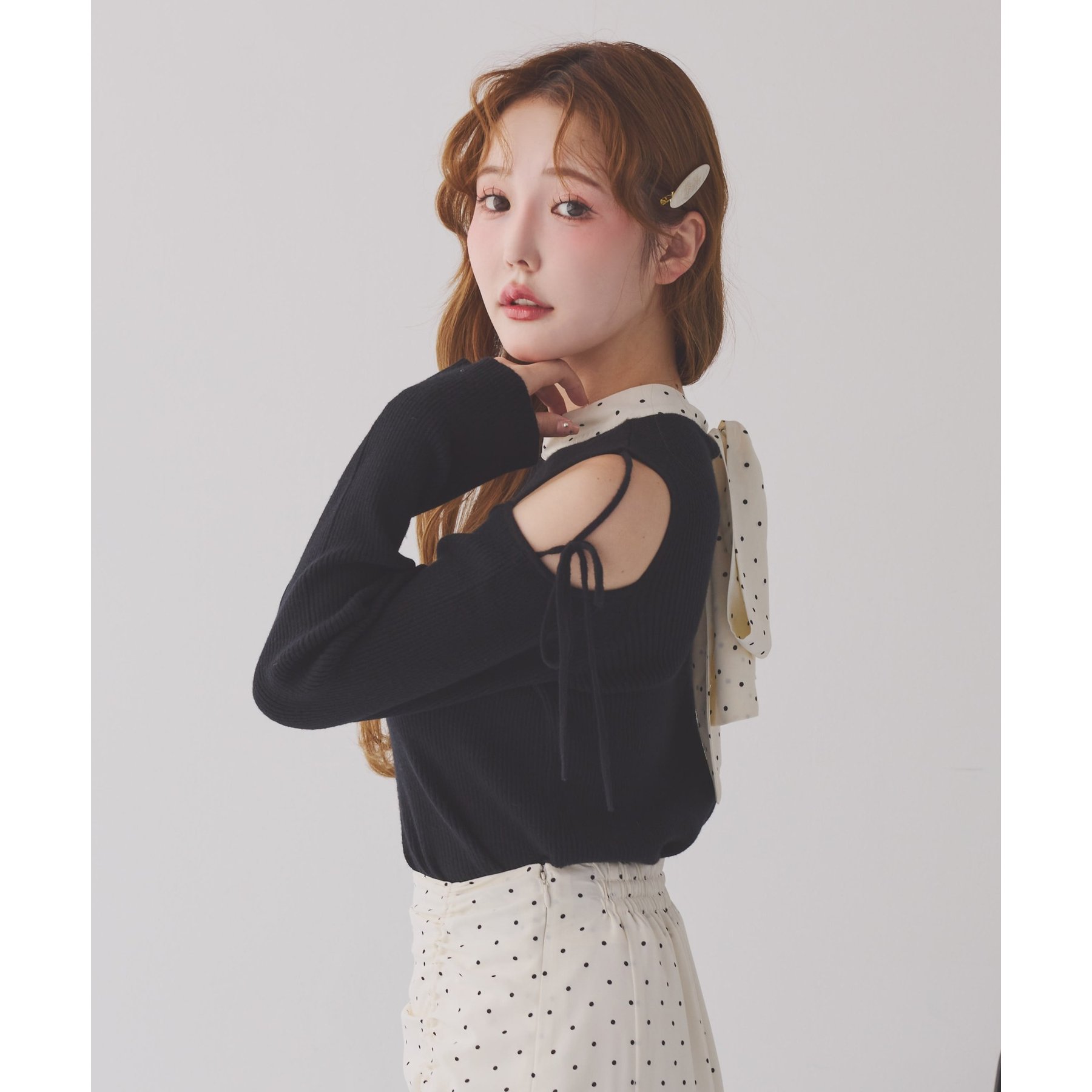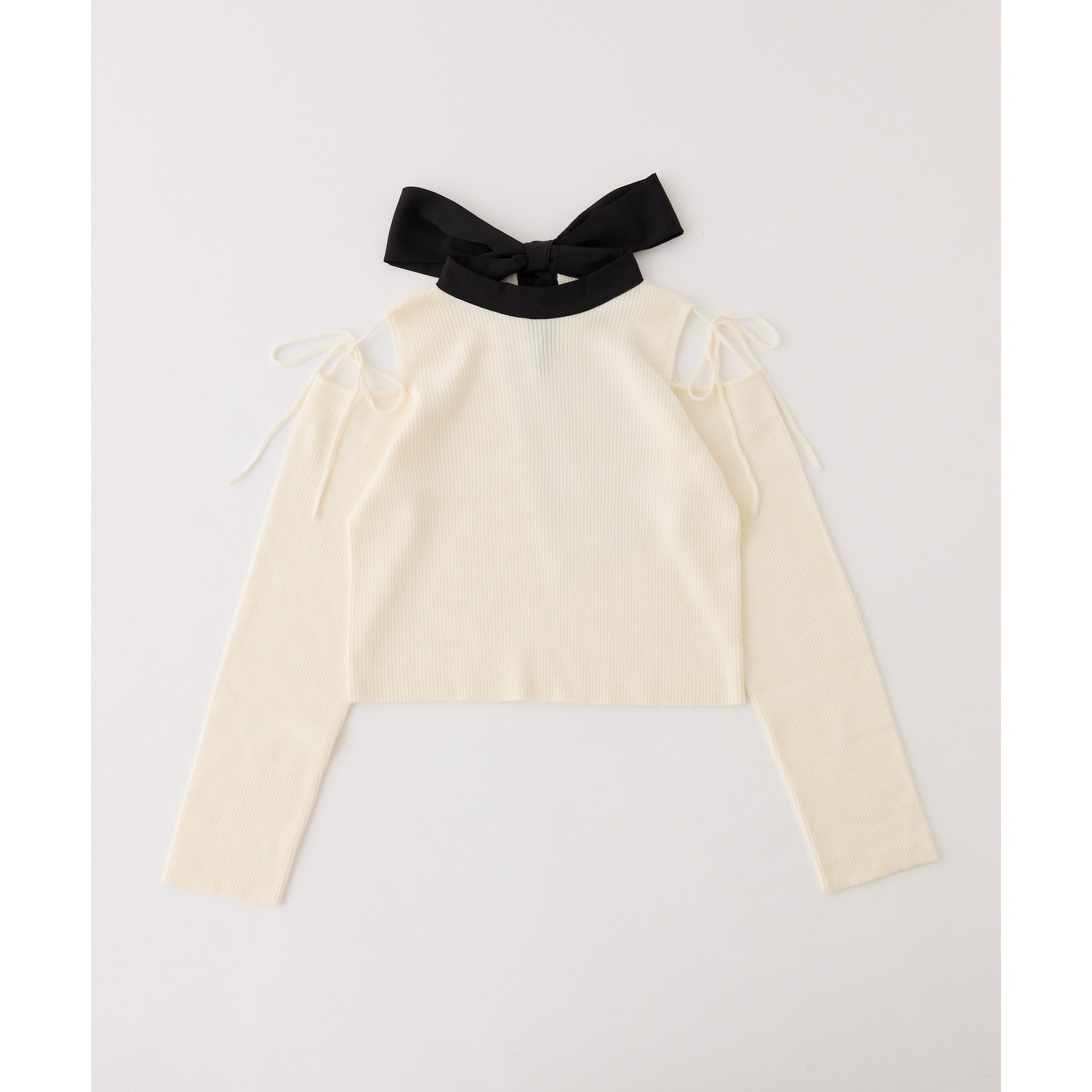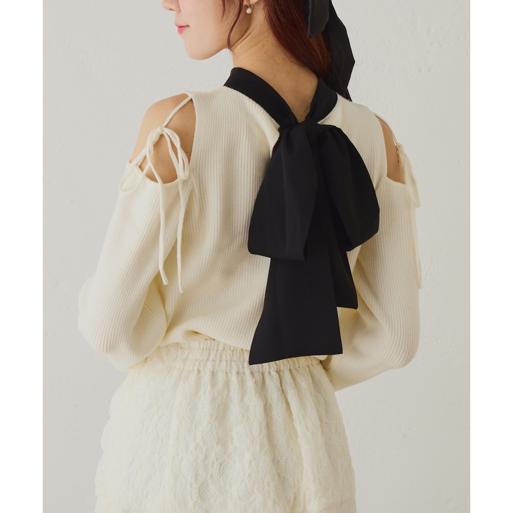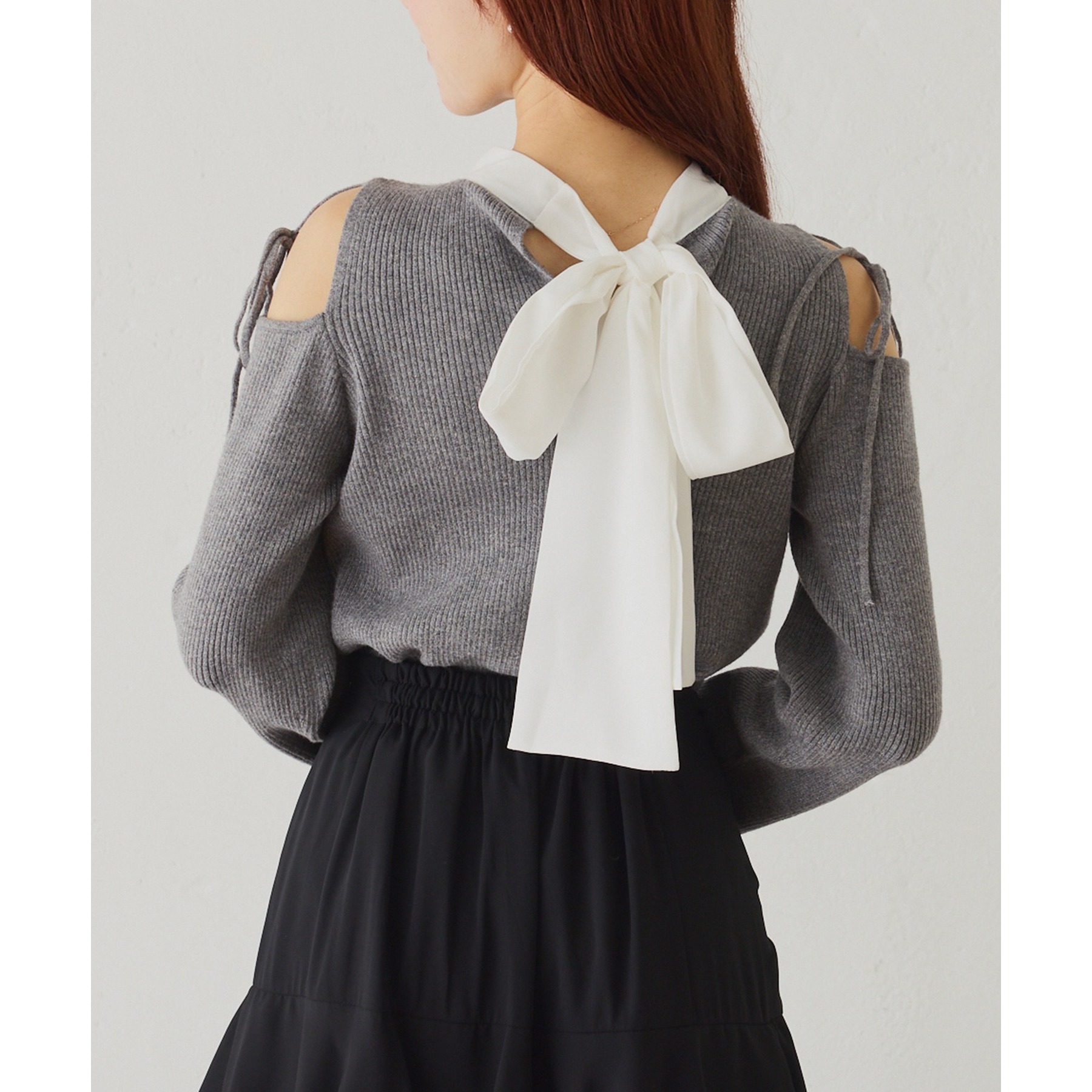 シンプルながらも、バックスタイルのリボンがアクセントになるトップスで、