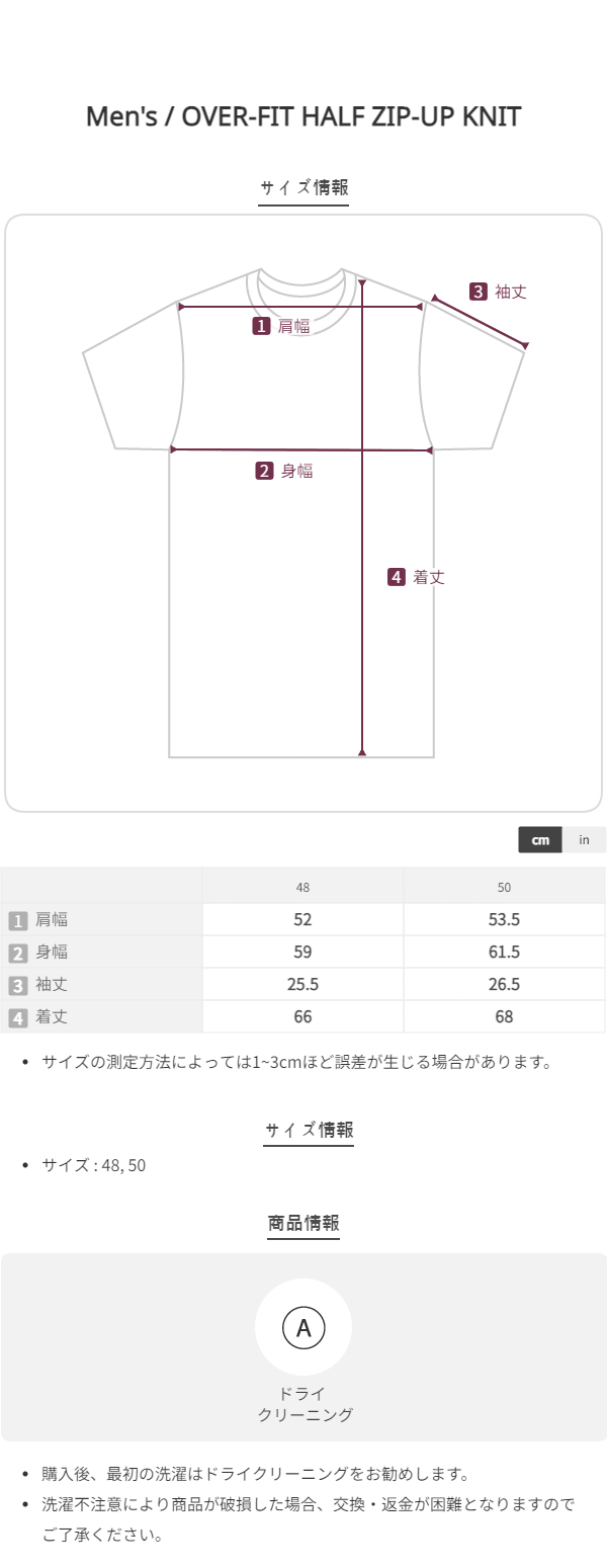 サイズは 着丈 / 肩幅 / 身幅 / 袖丈 順です。