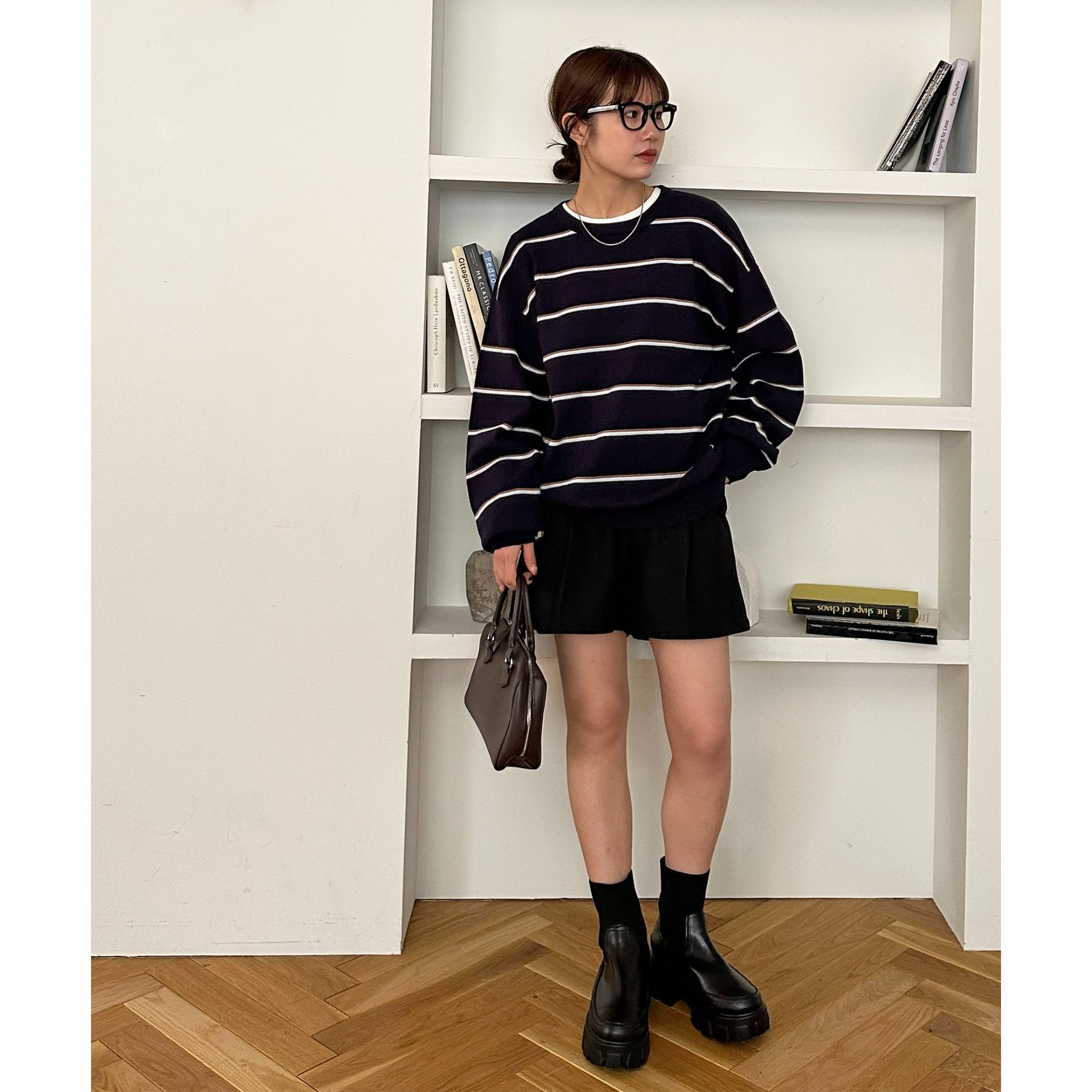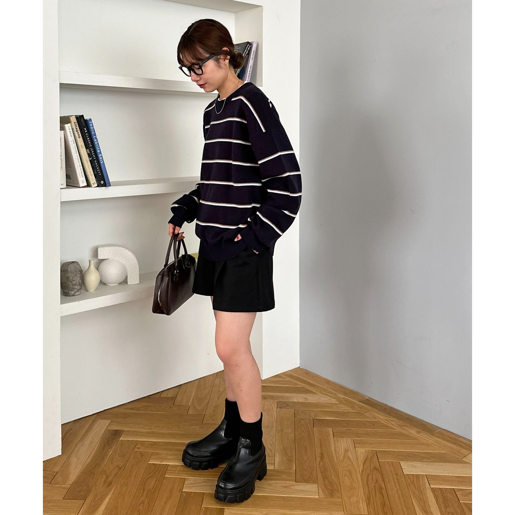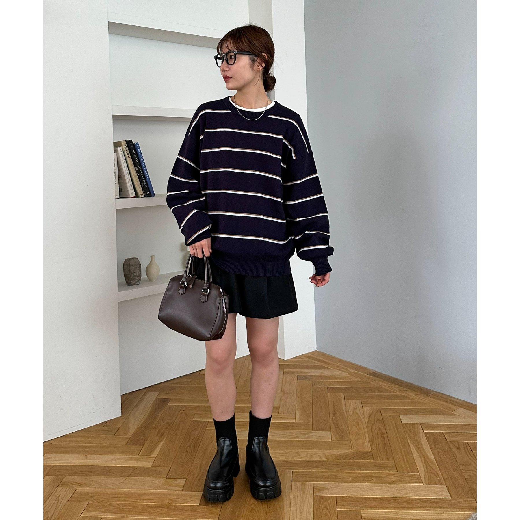 ゆったりとした着丈シルエットなので、ショートパンツやミニスカートにブーツを合わせたコーデもおすすめ!