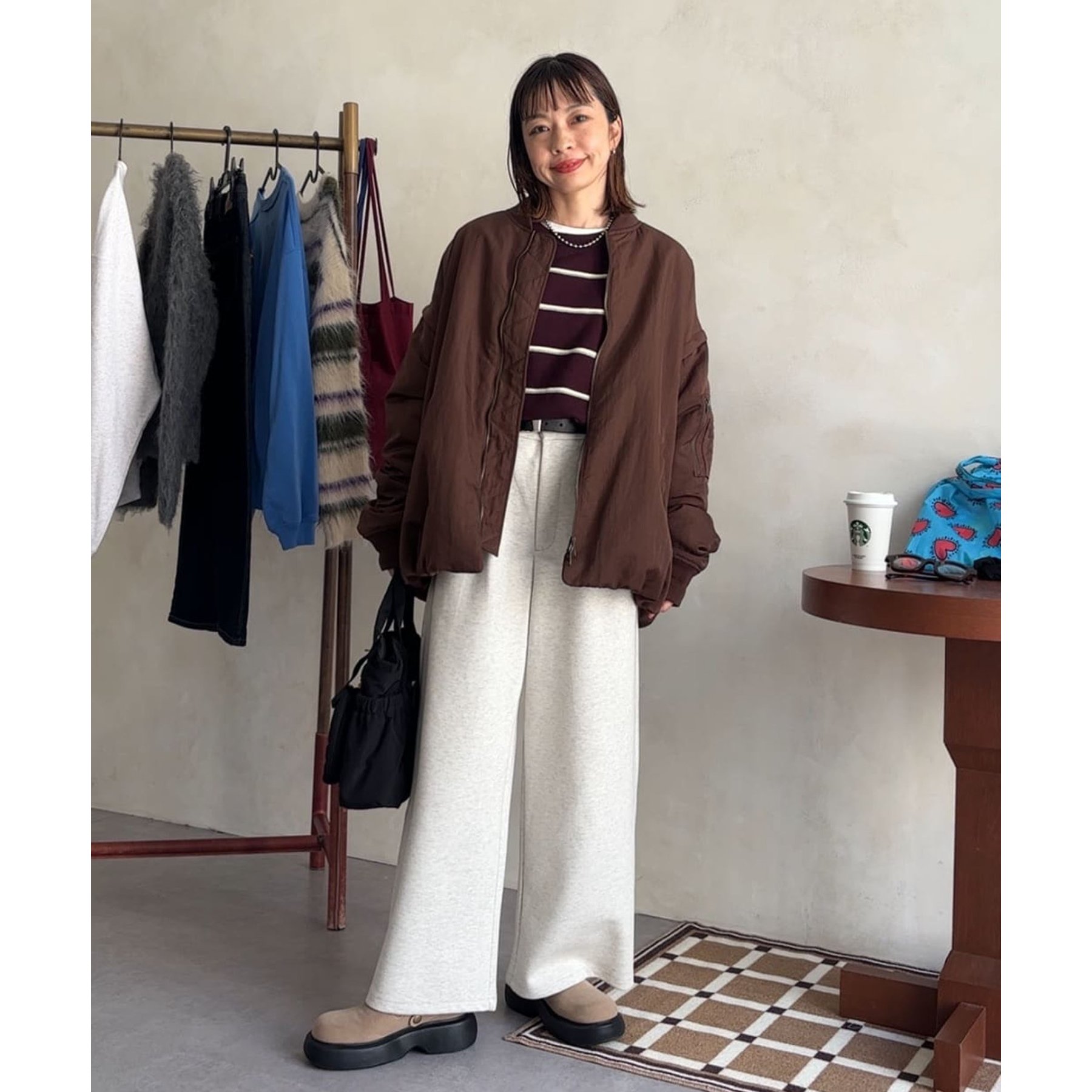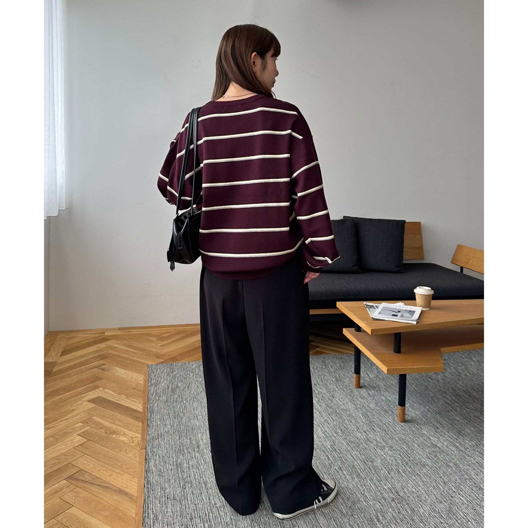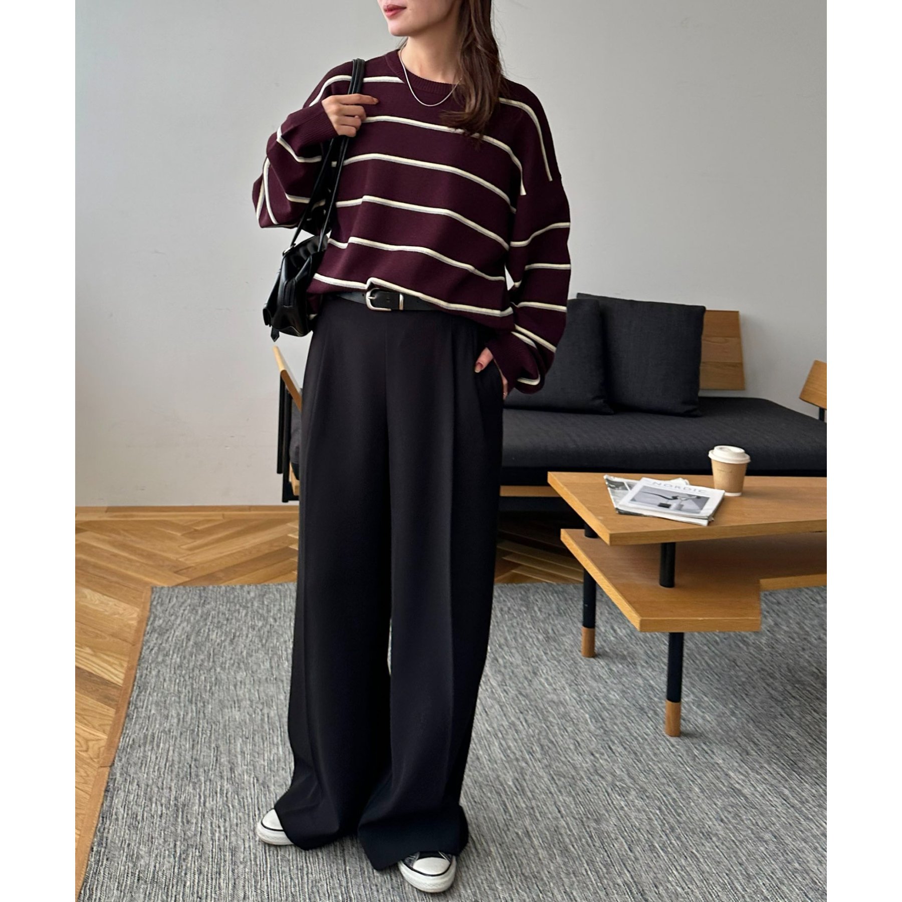 スラックスパンツを合わせたスタイリッシュなコーデはモードな着こなしが楽しめます。