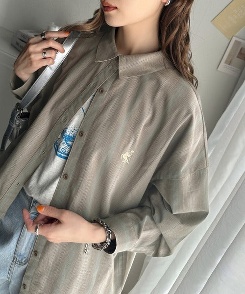 綿100%胸刺繍先染めストライプシャツの登場。
