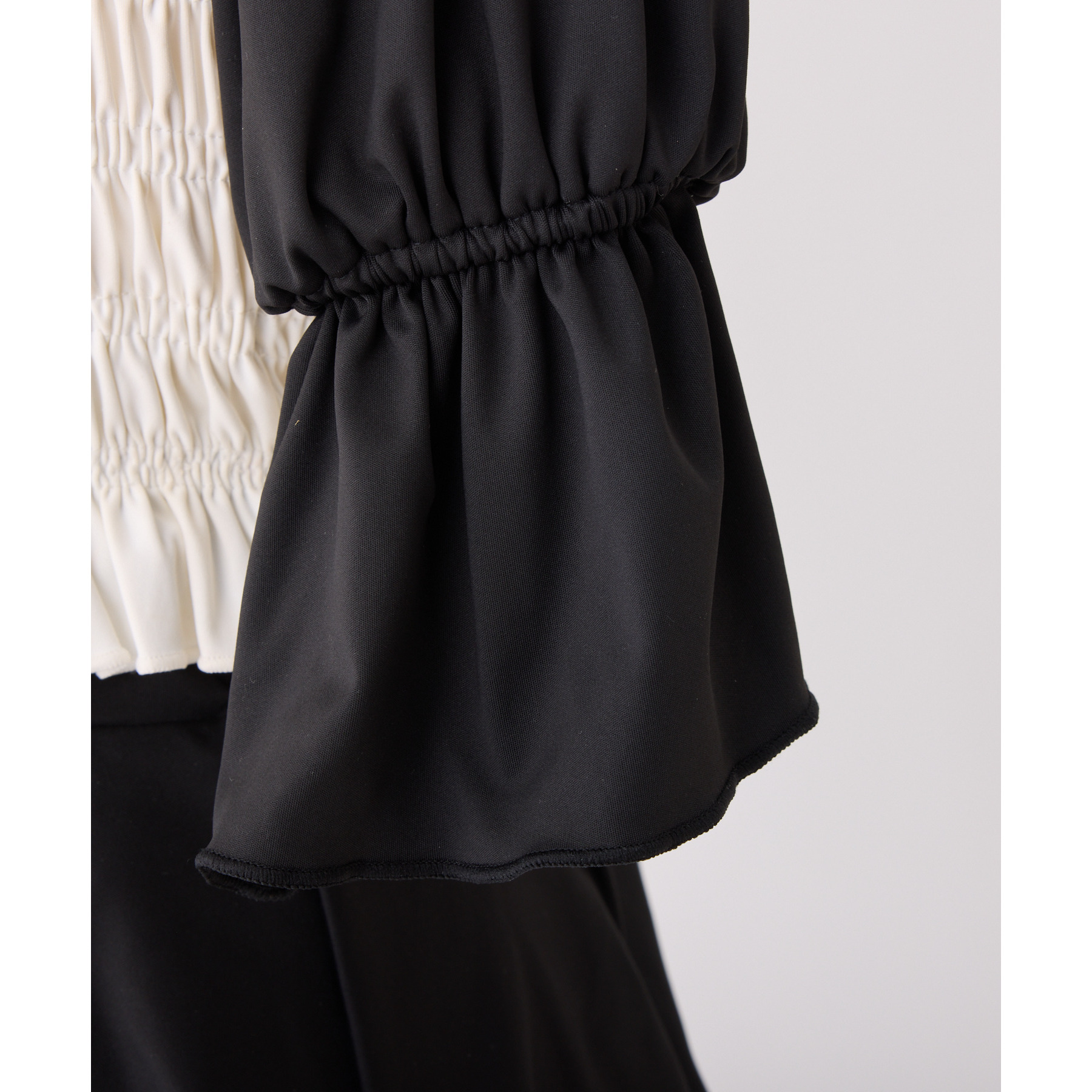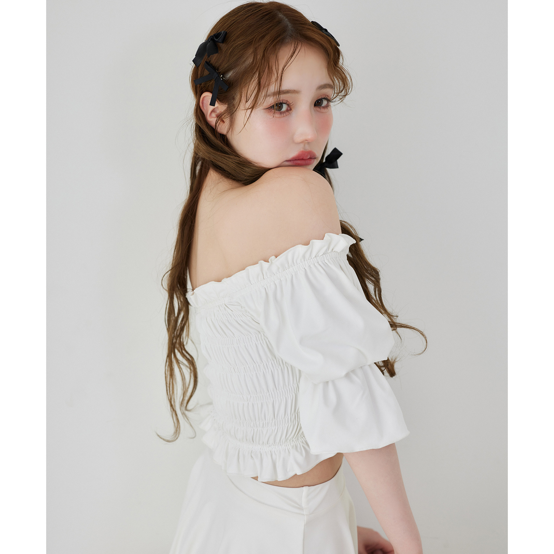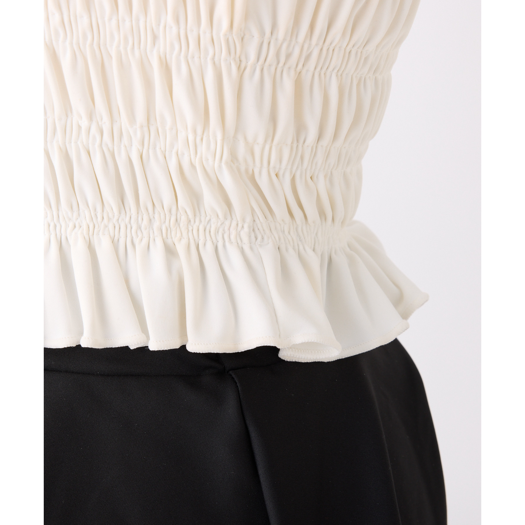 ボリューム感のあるパフスリーブがフェミニンな印象を与えるシャーリングデザインのトップスと