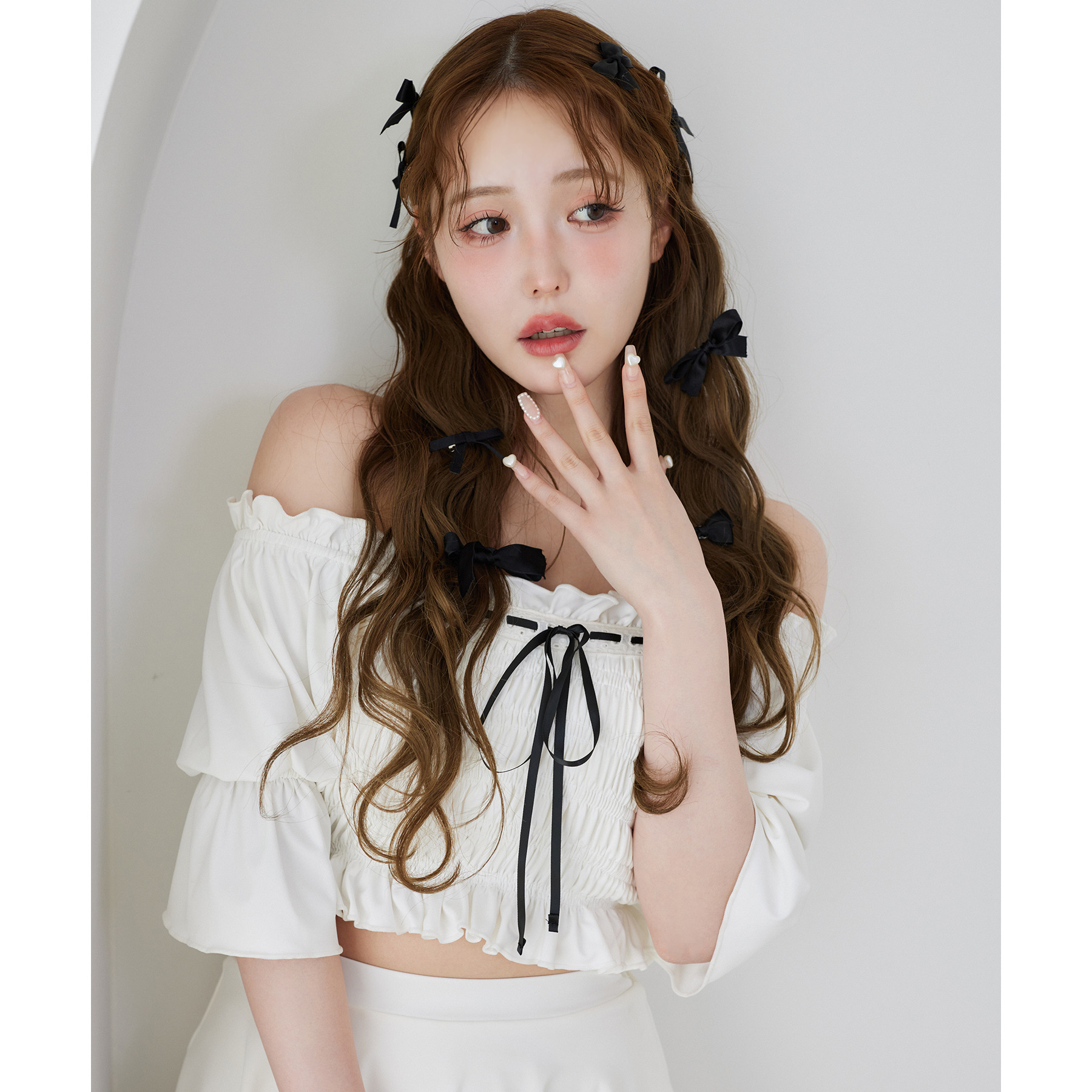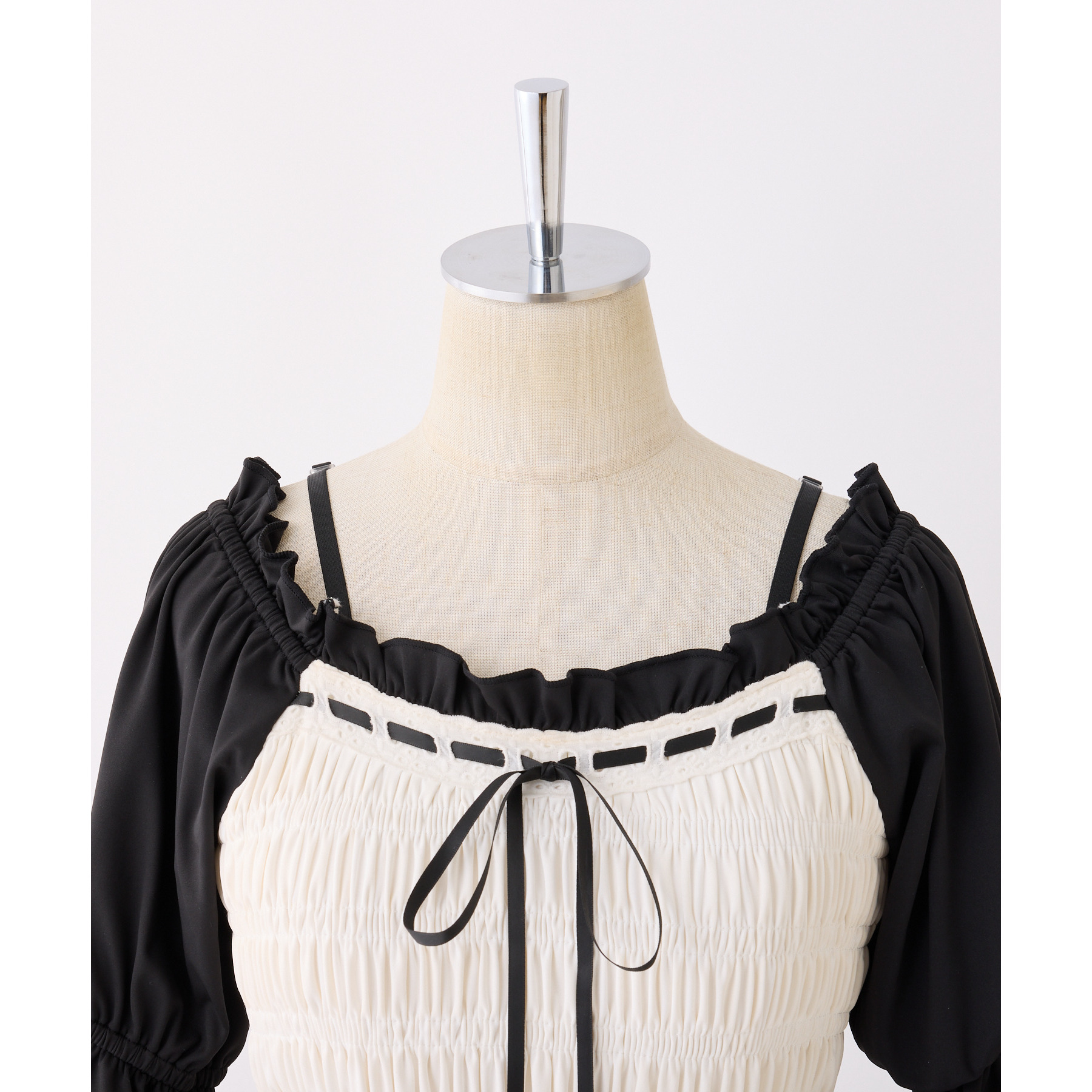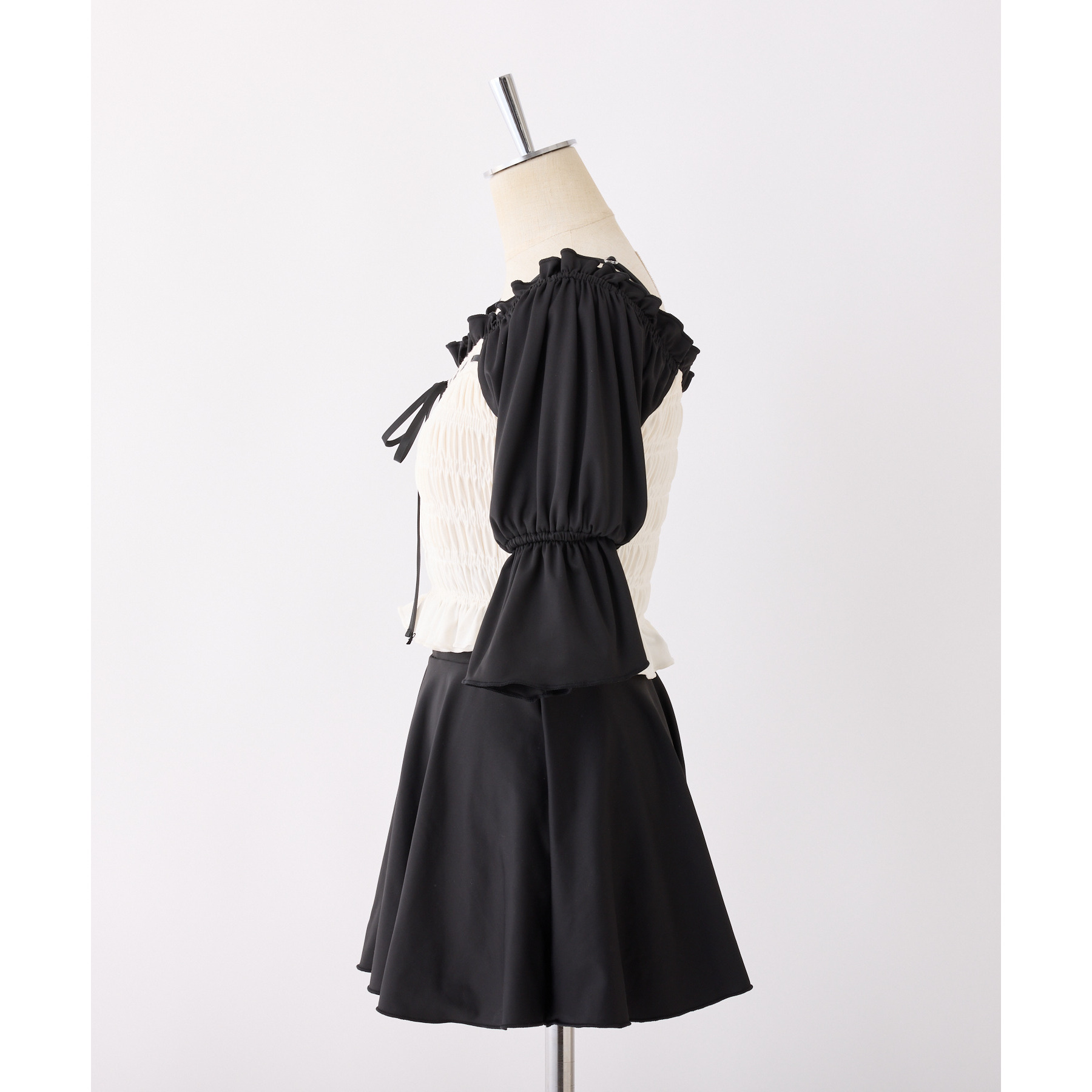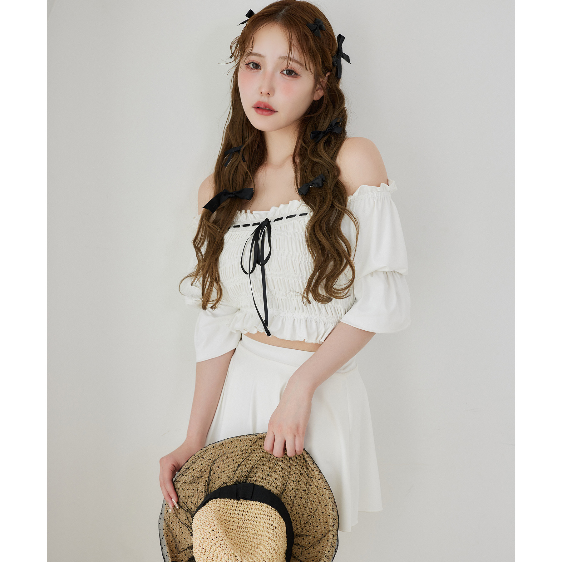 ボリューム感のあるパフスリーブがフェミニンな印象を与えるシャーリングデザインのトップスと