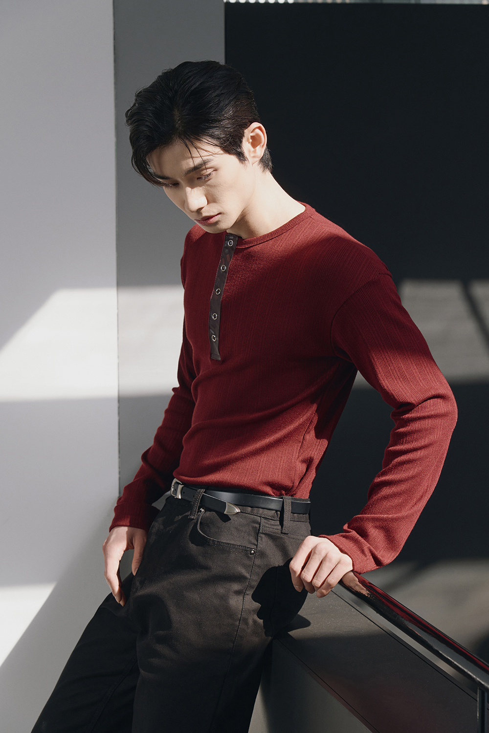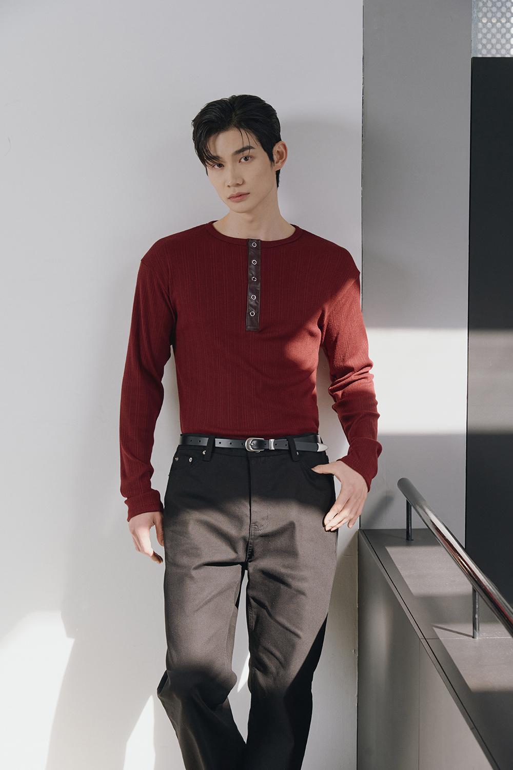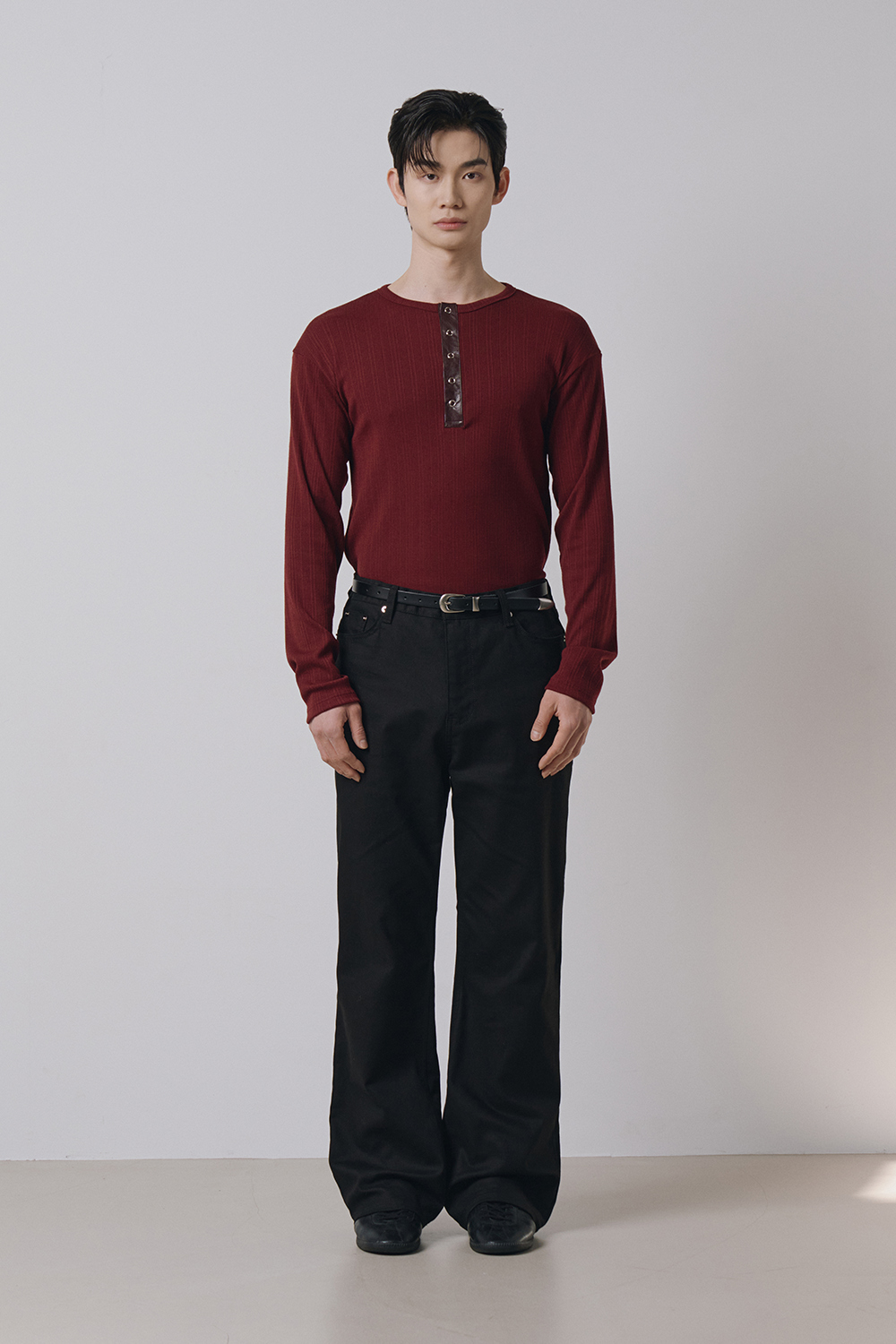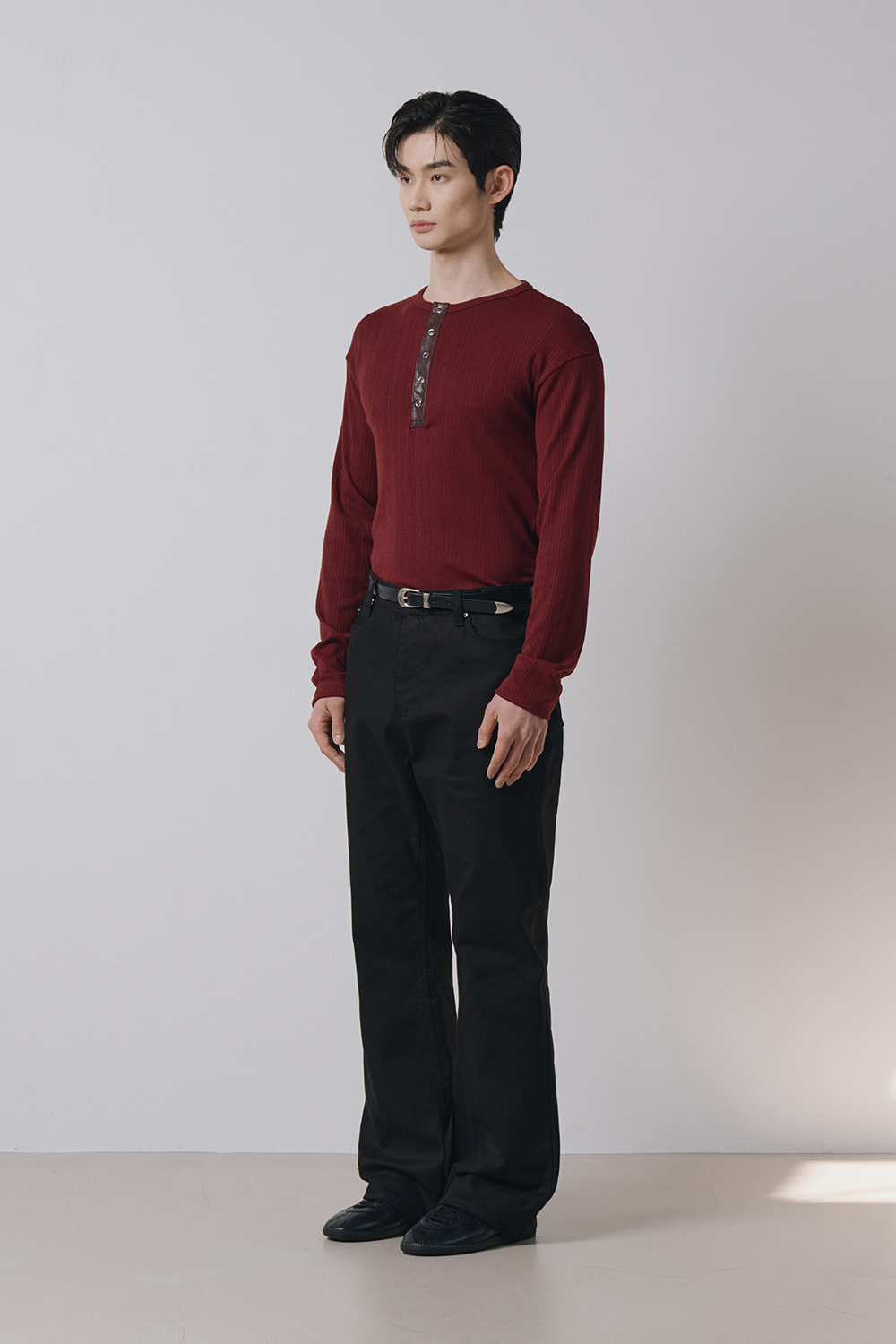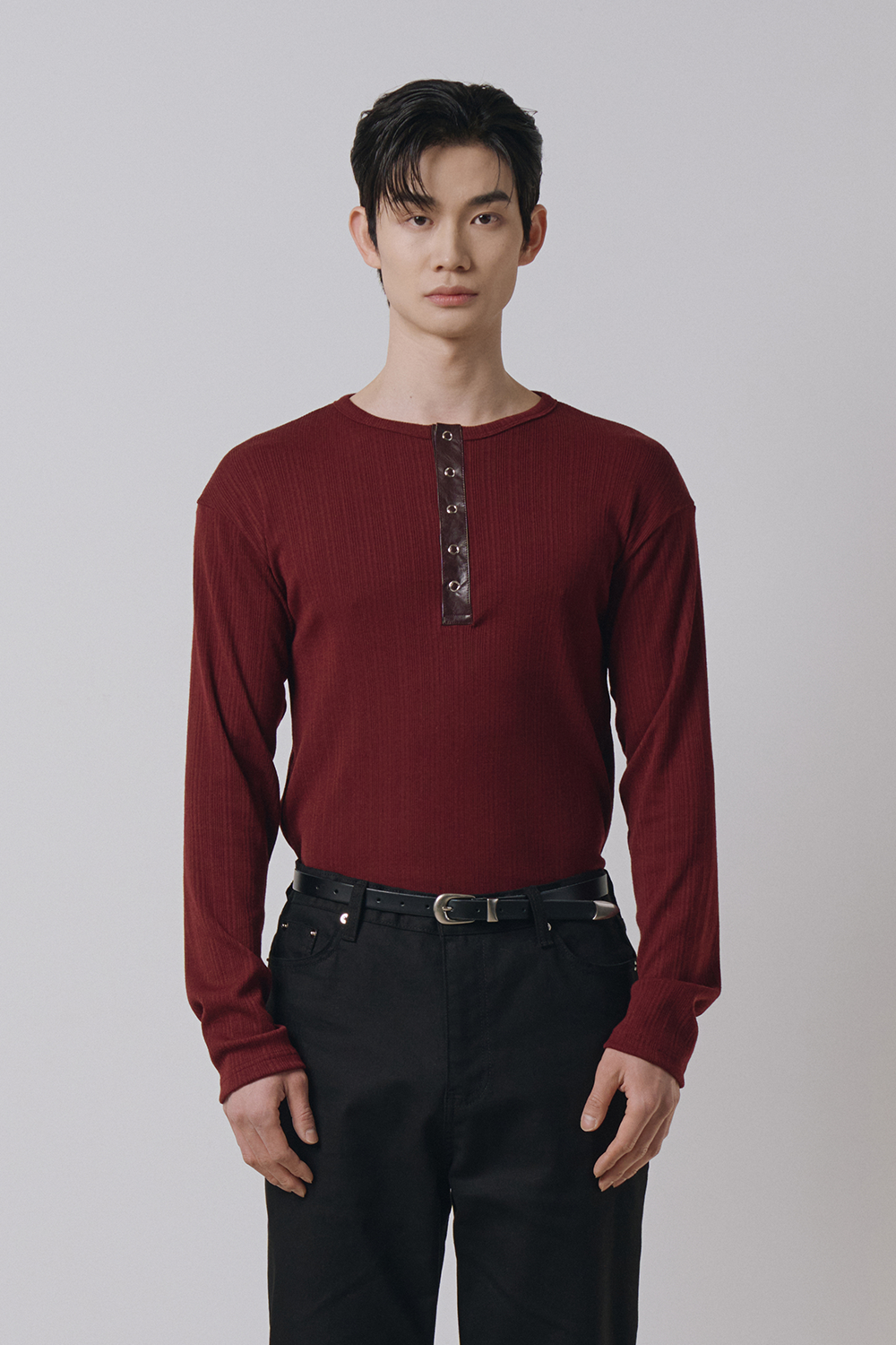 Leather ribbed henley neck sleeves(Burgundy)