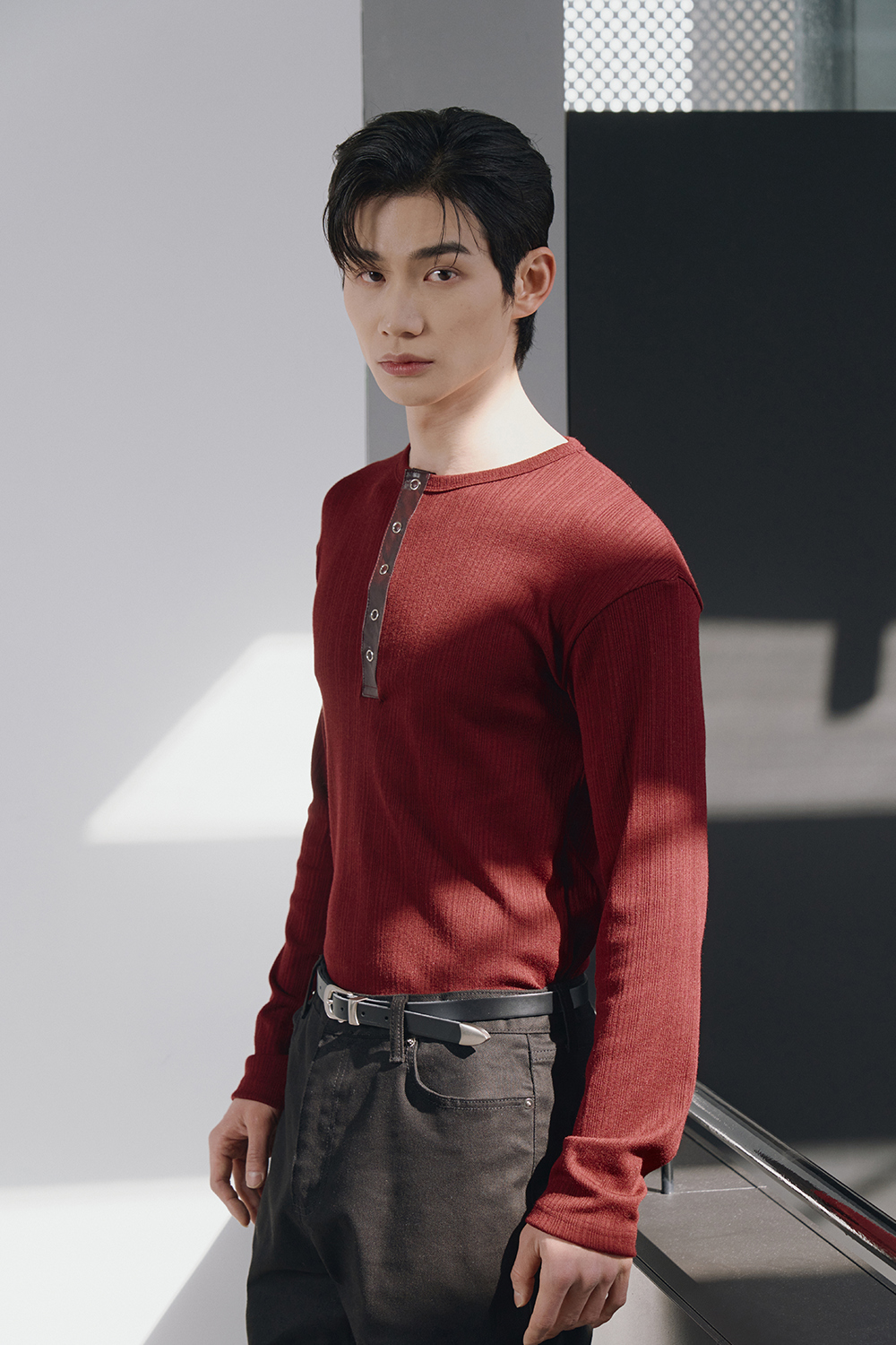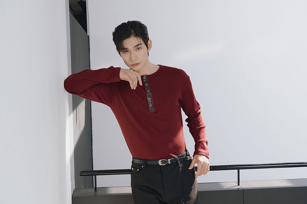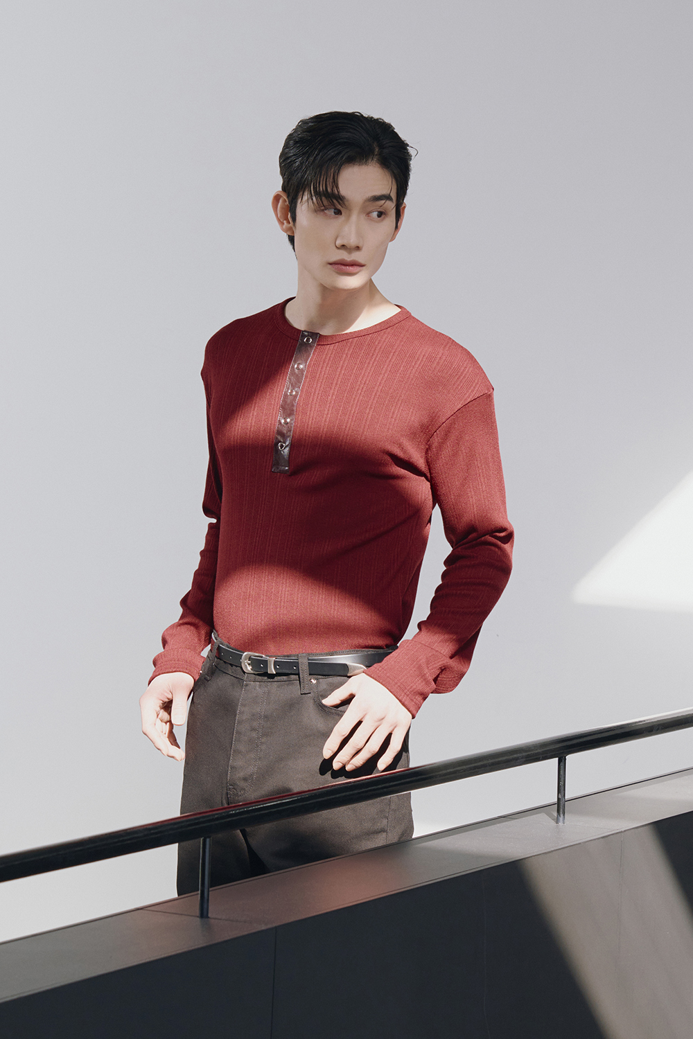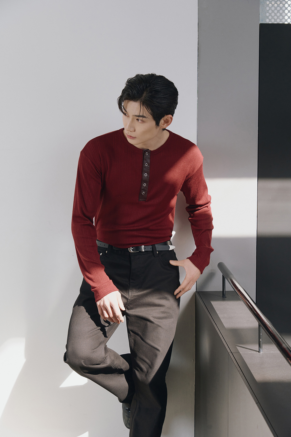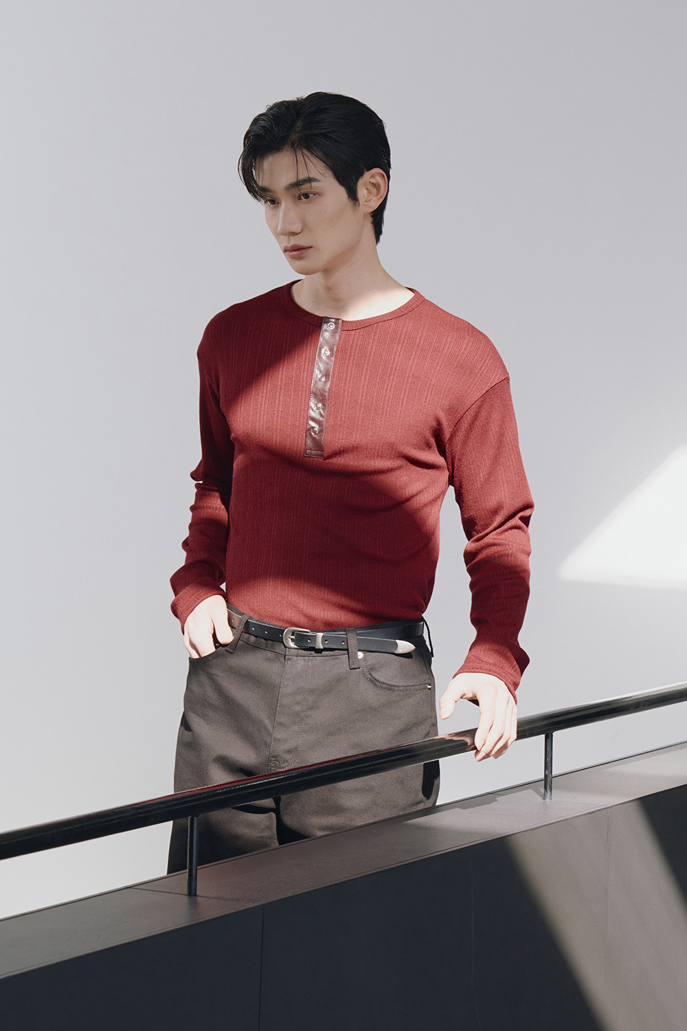 Leather ribbed henley neck sleeves(Burgundy)