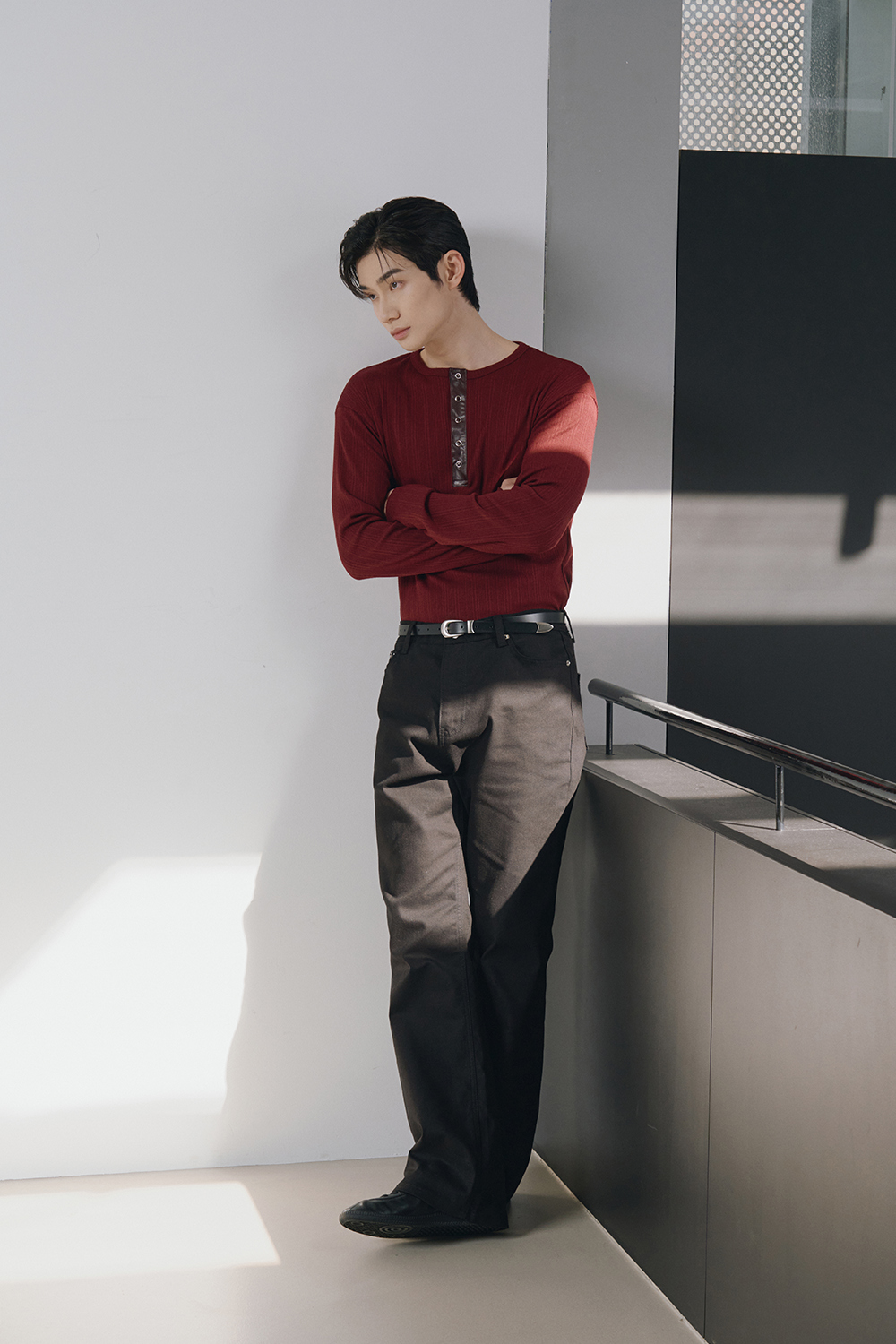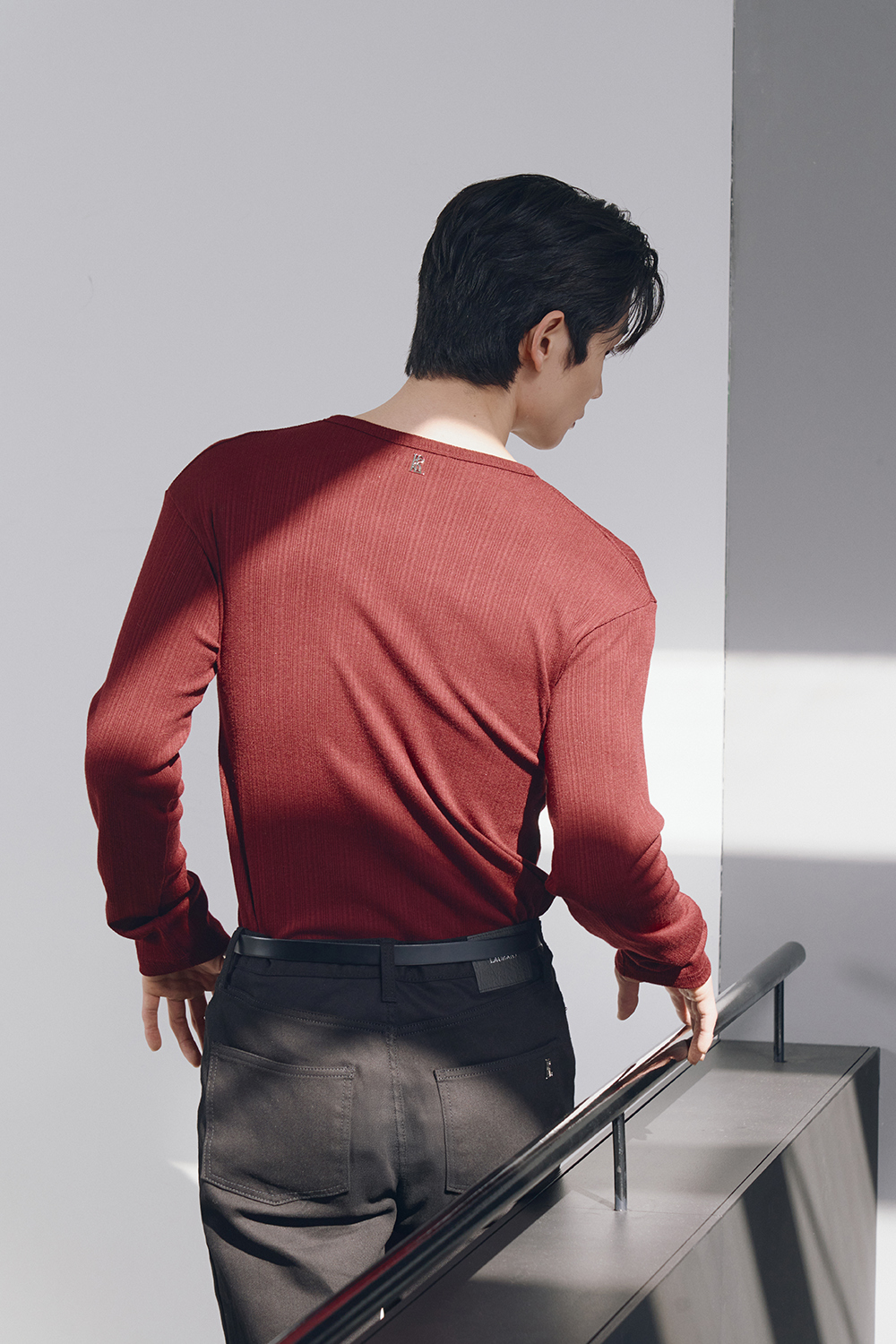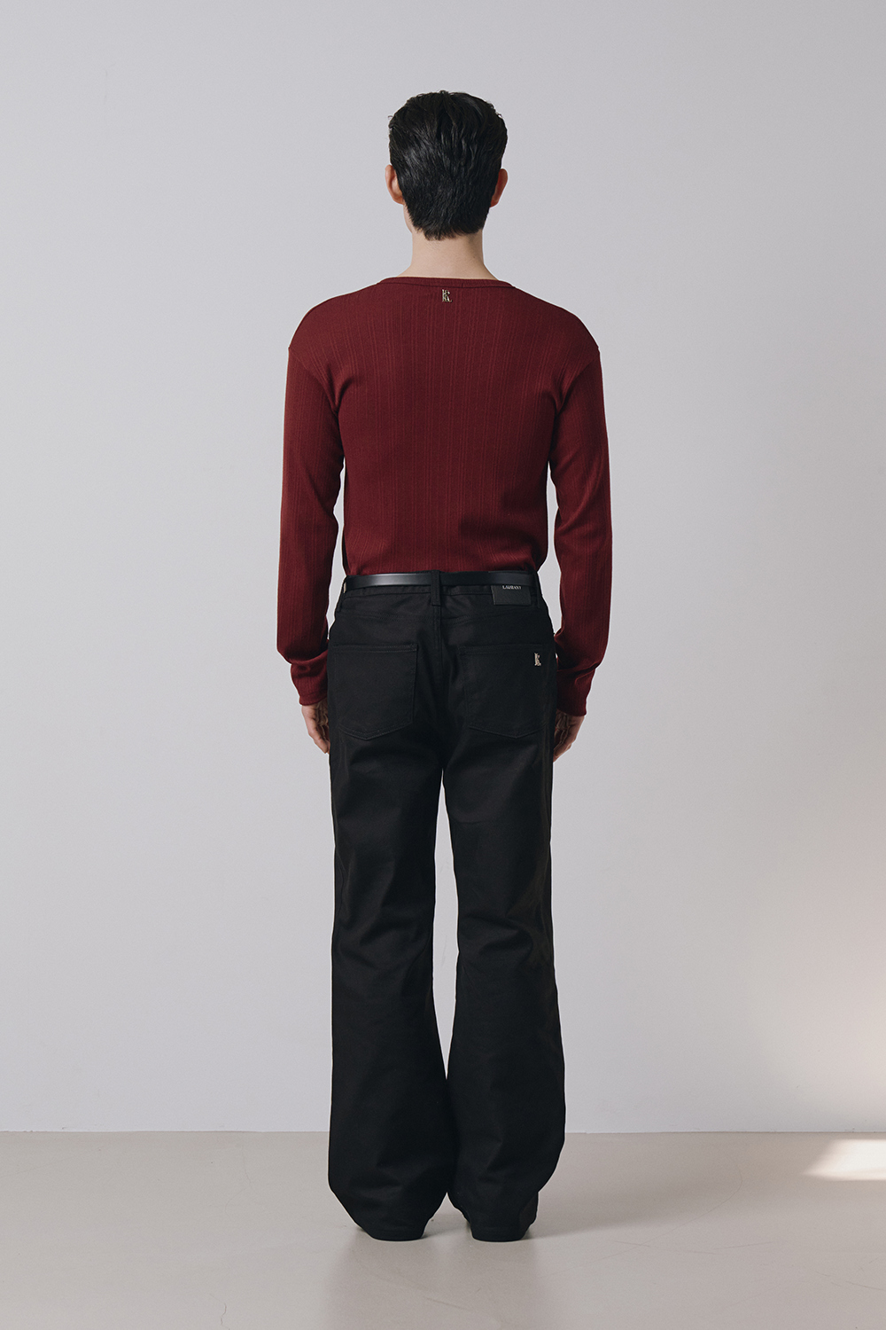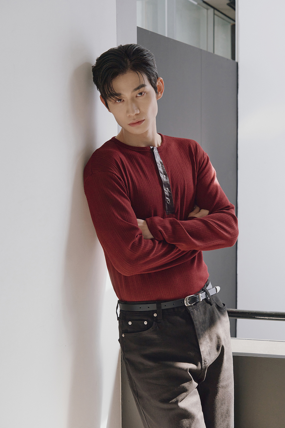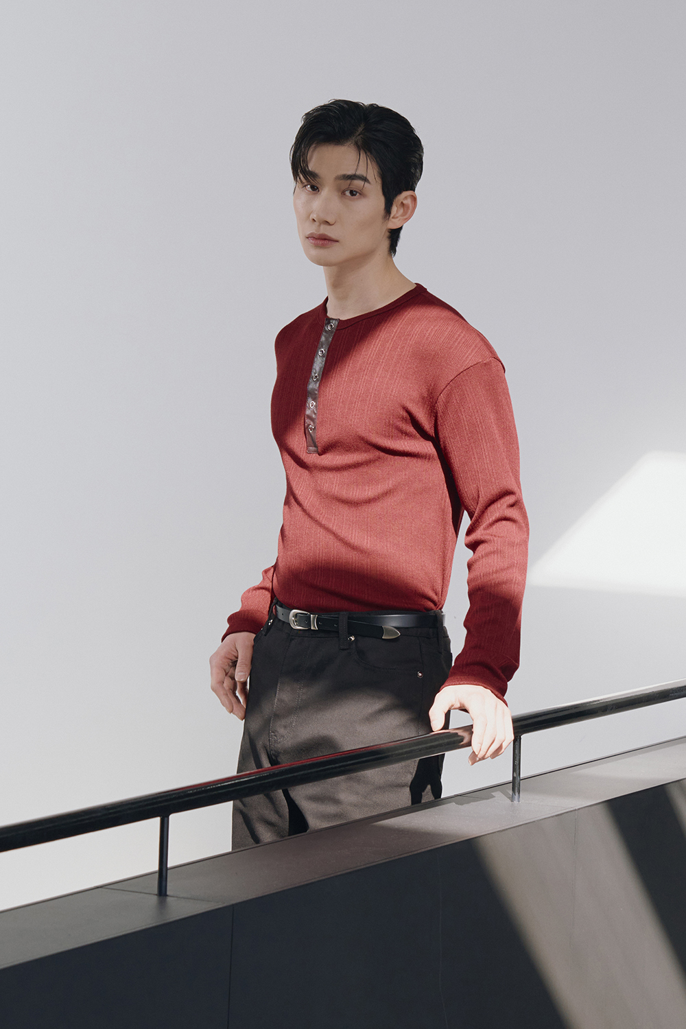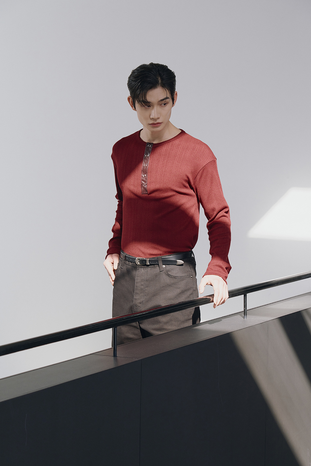 Leather ribbed henley neck sleeves(Burgundy)