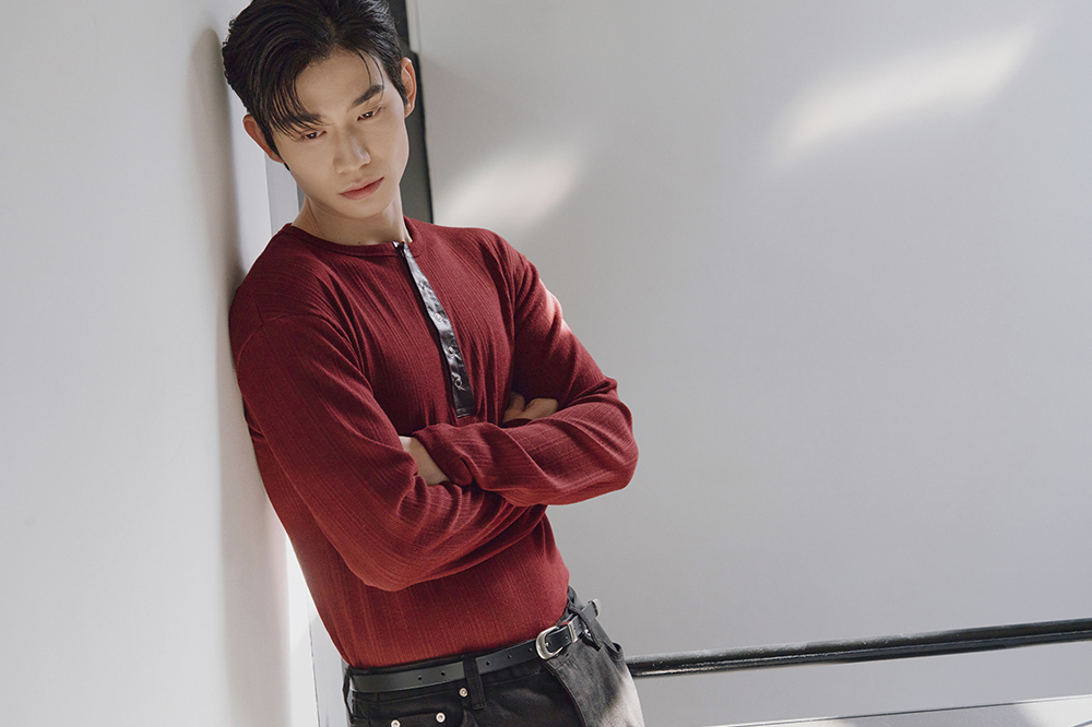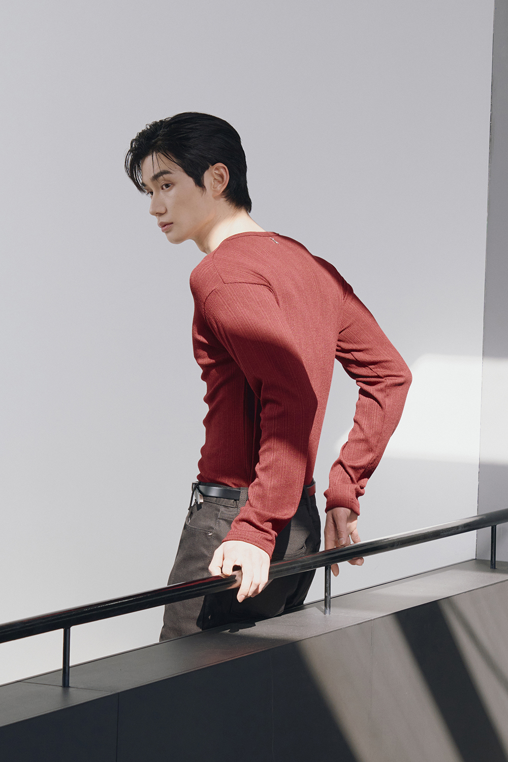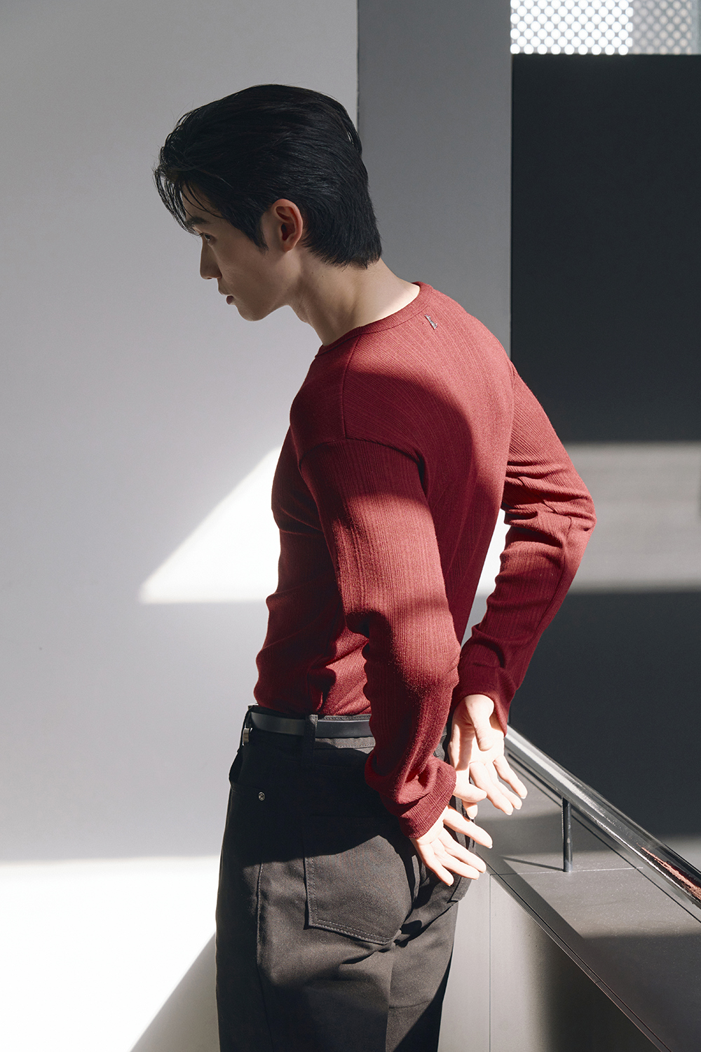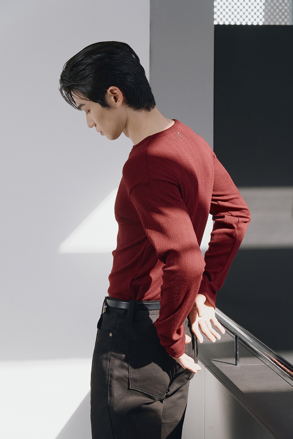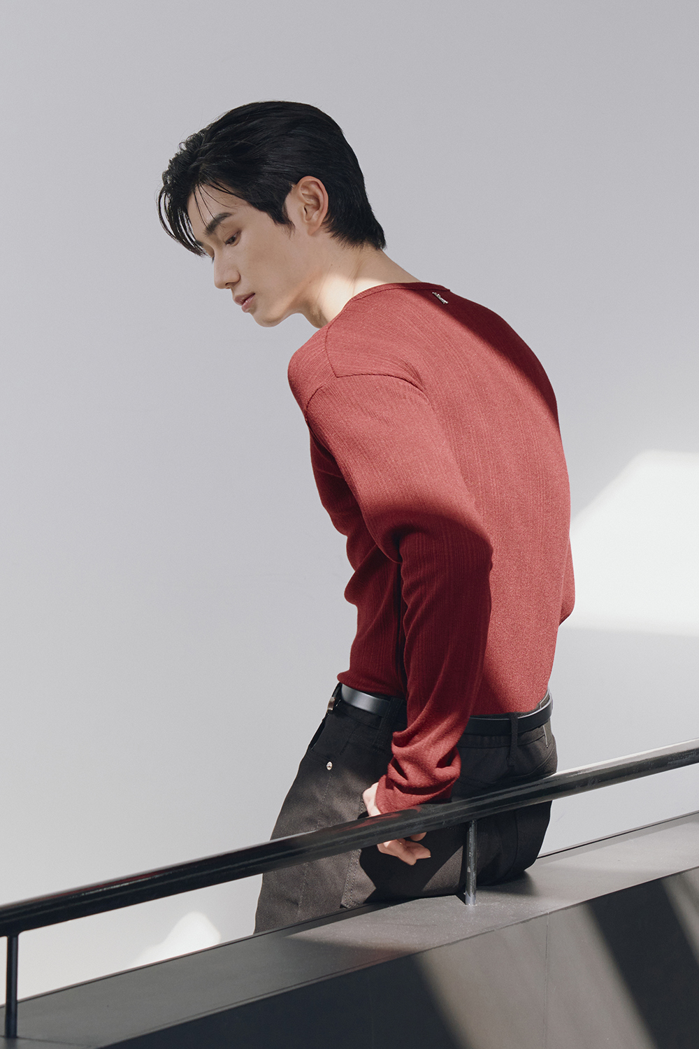 Leather ribbed henley neck sleeves(Burgundy)