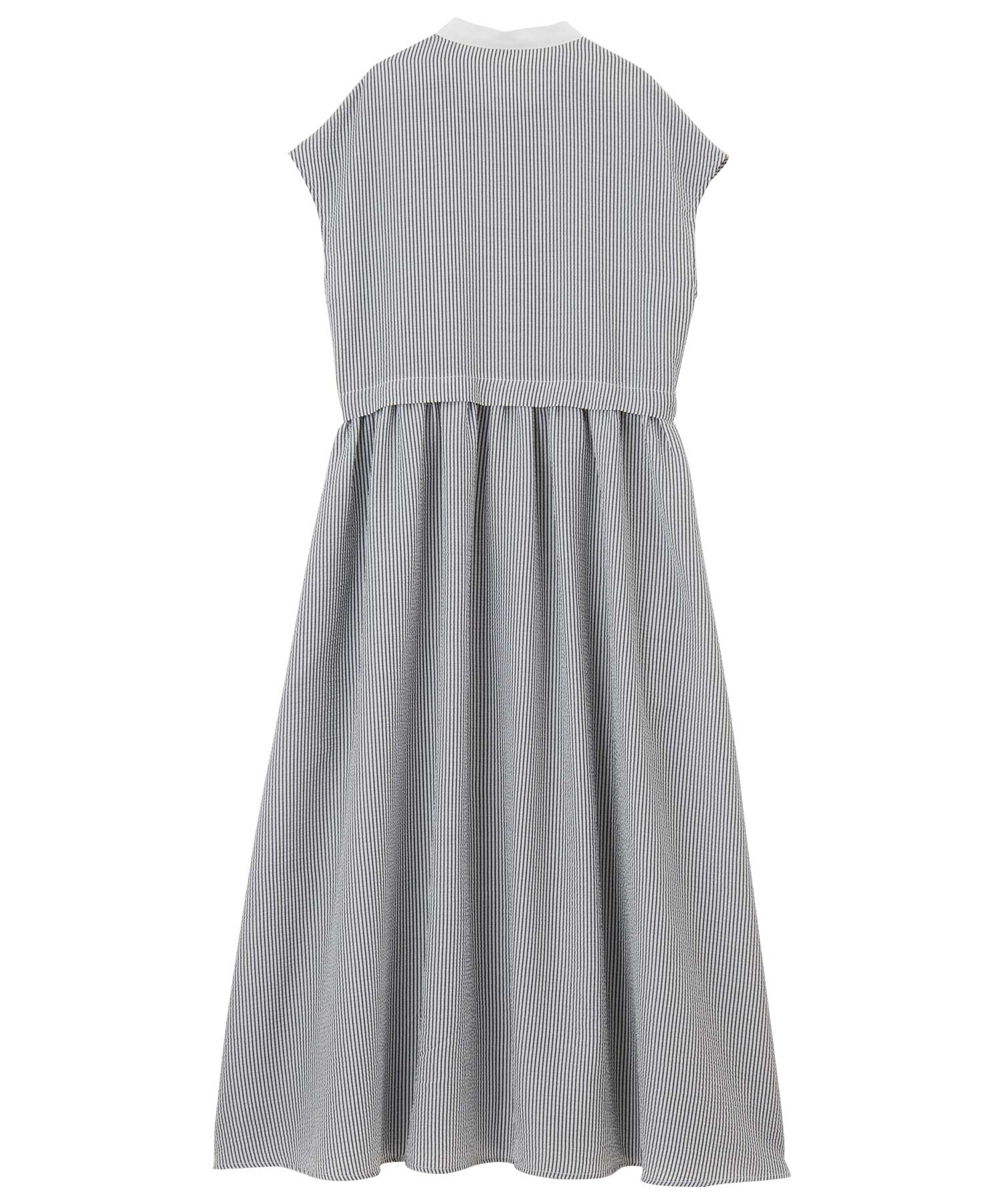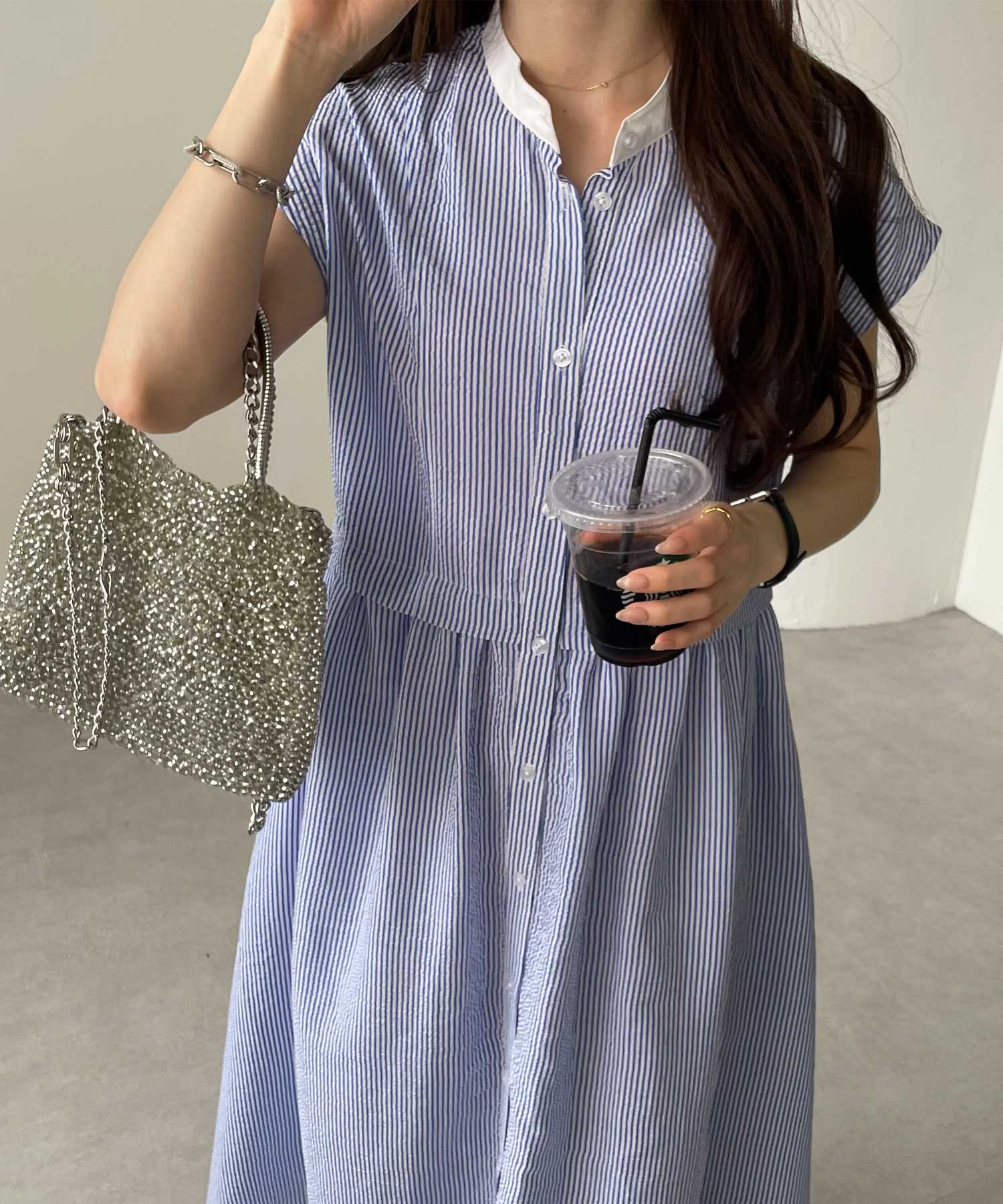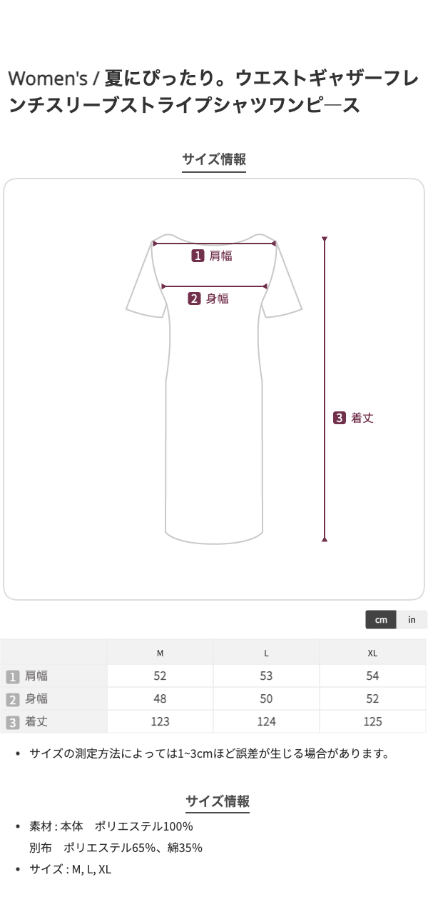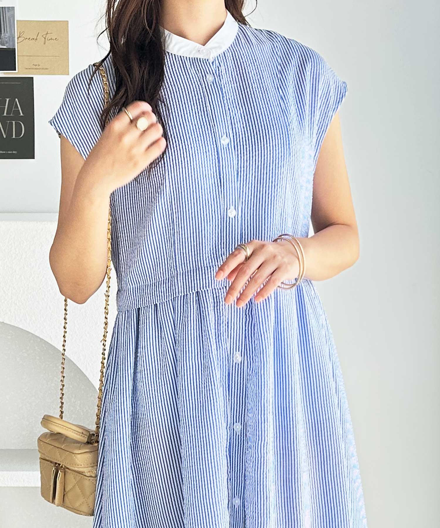 夏にぴったり。ウエストギャザーフレンチスリーブストライプシャツワンピ―ス