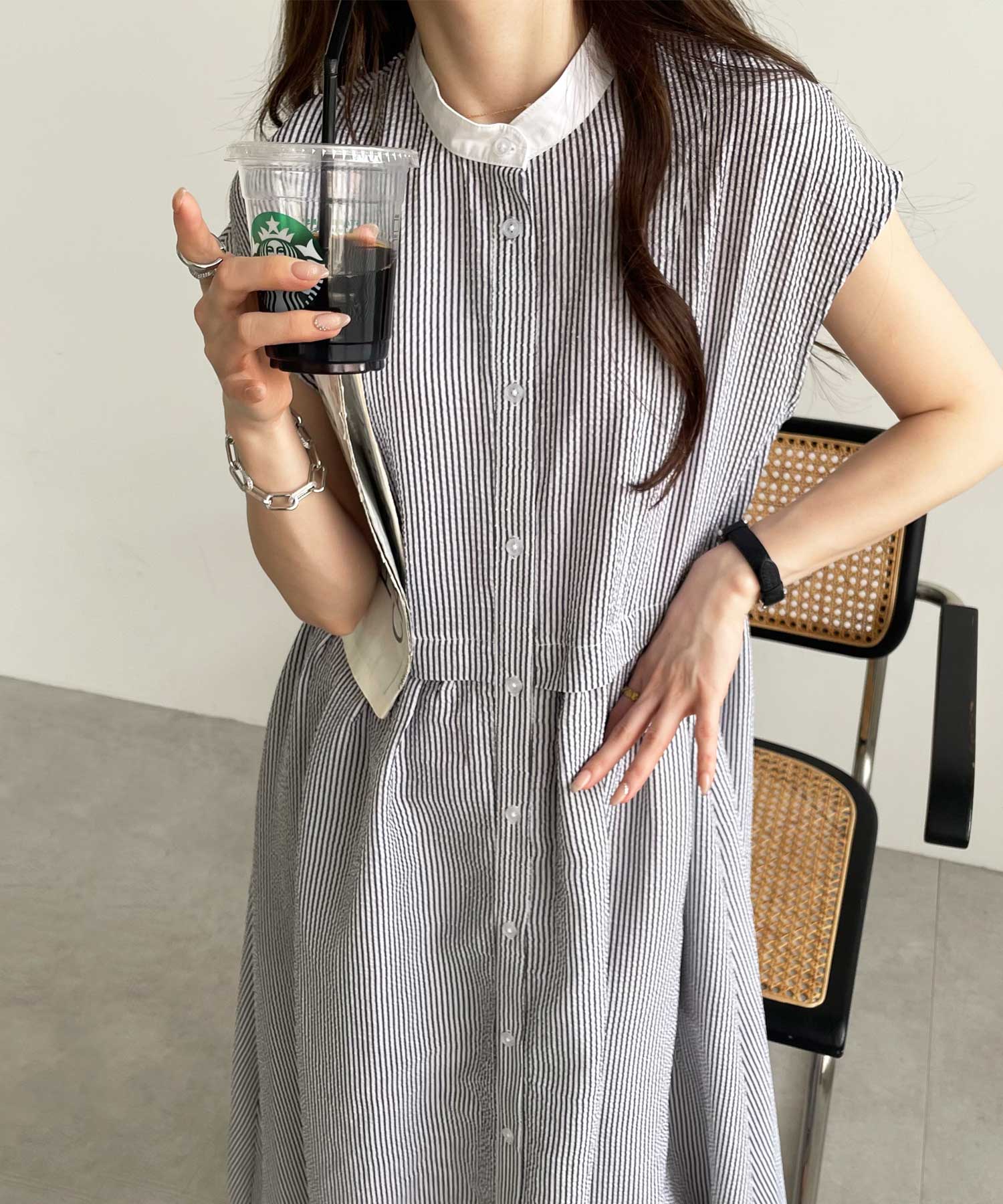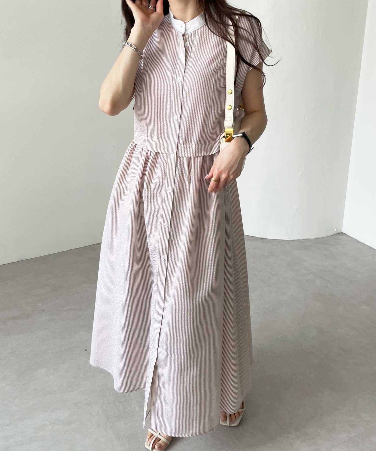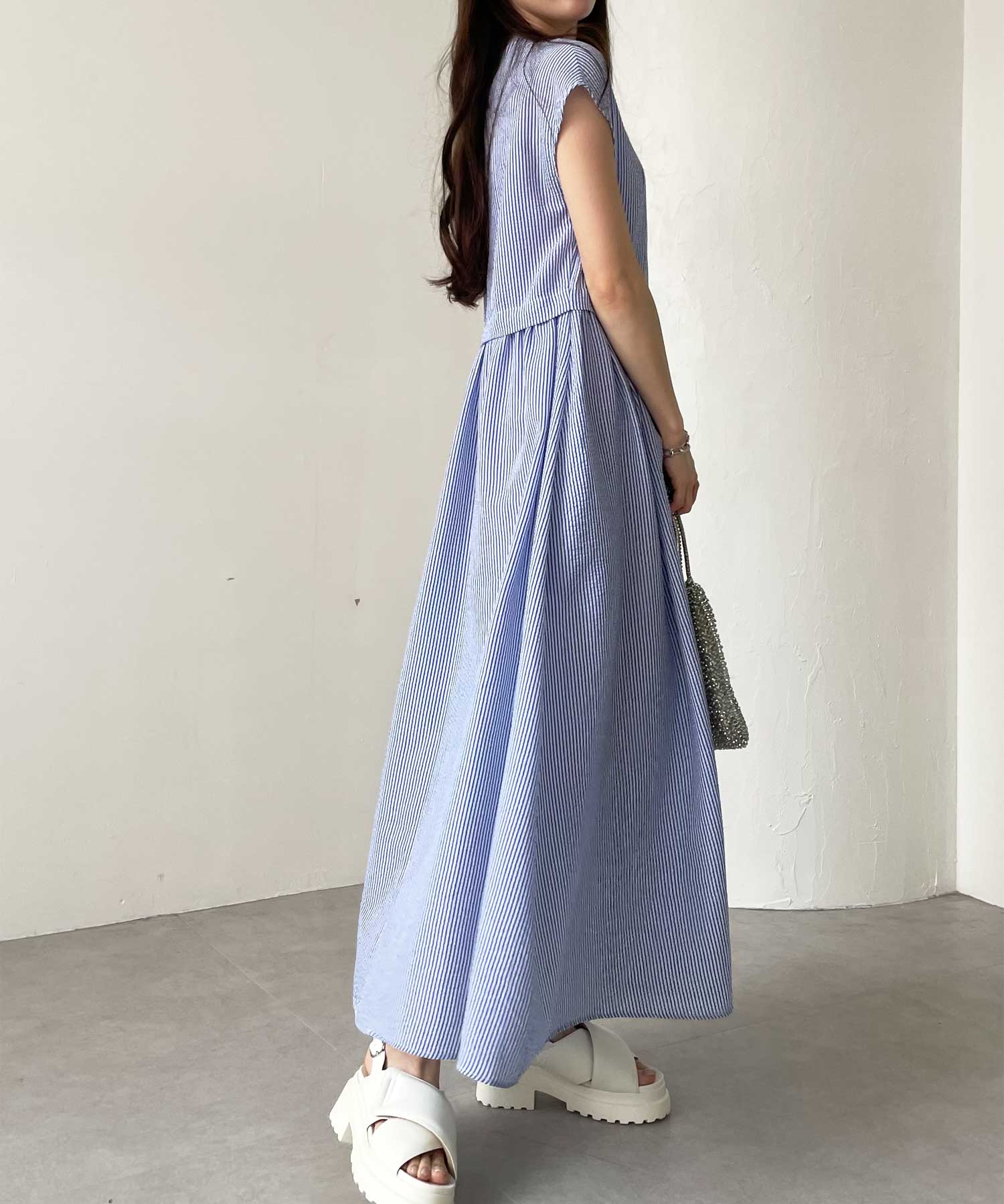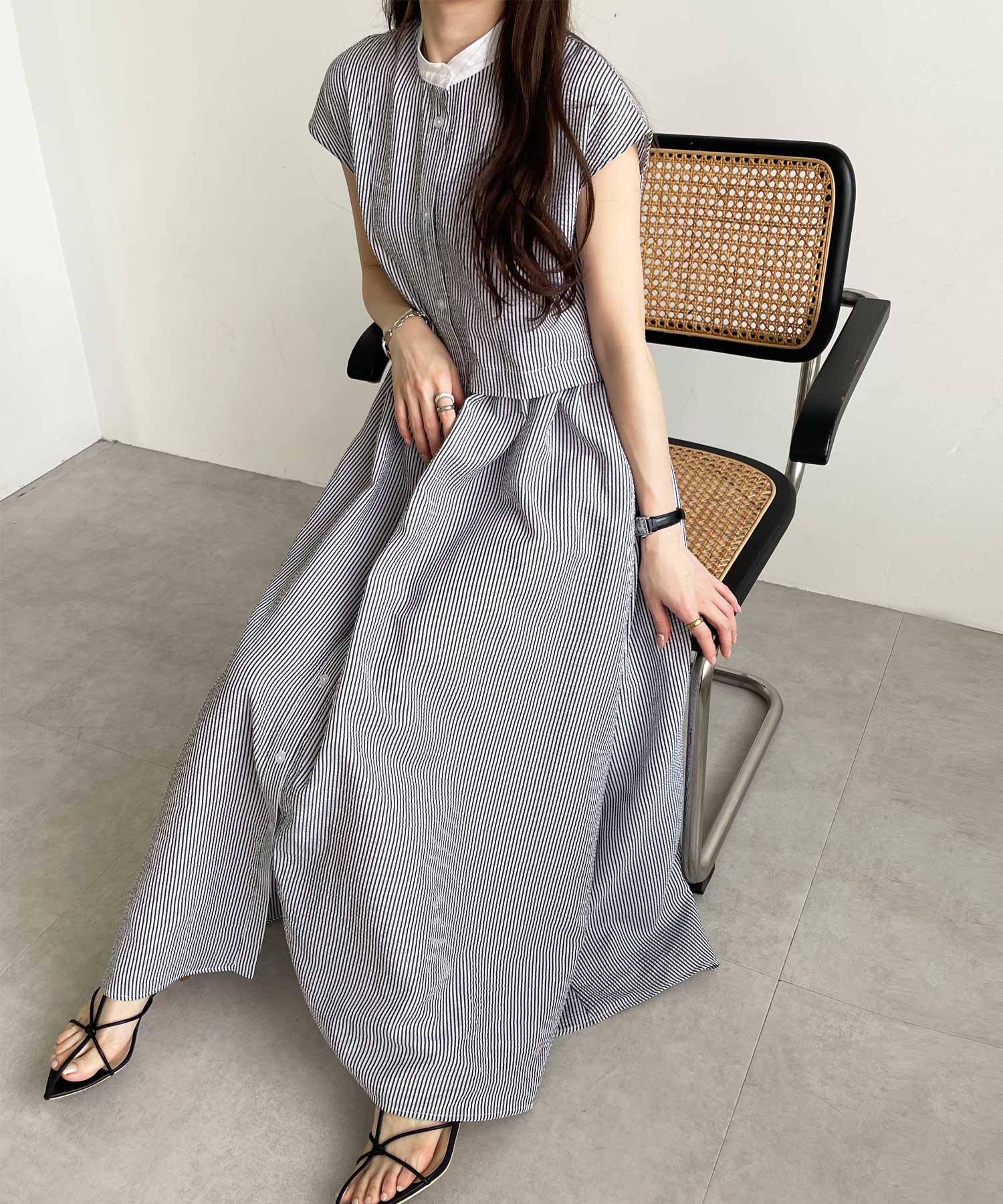 ボリュームたっぷりながらも、サッカー素材で夏らしく軽やかな印象。