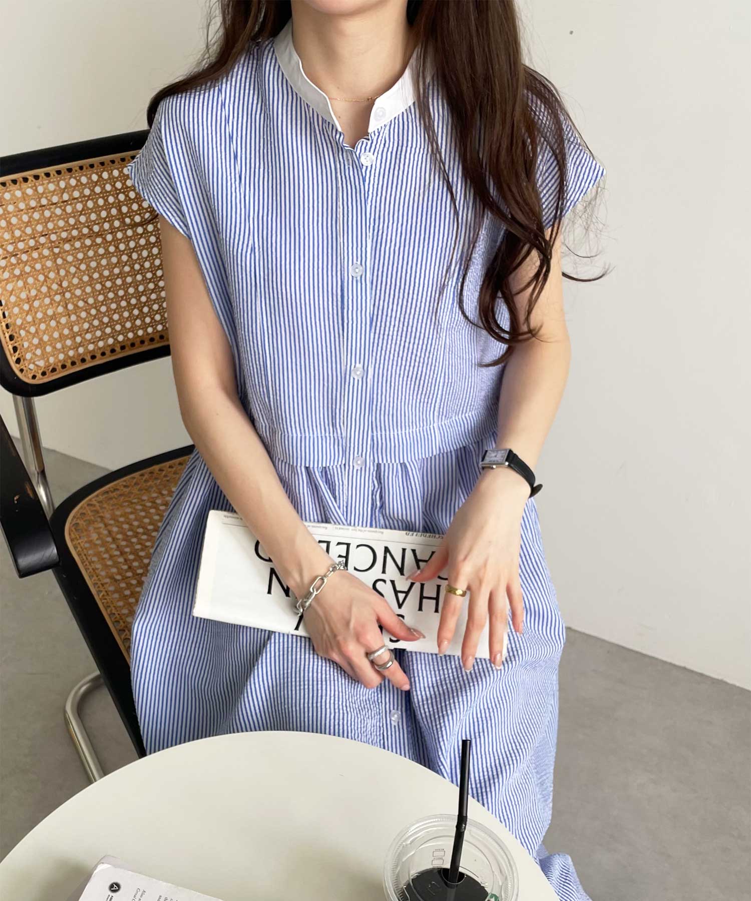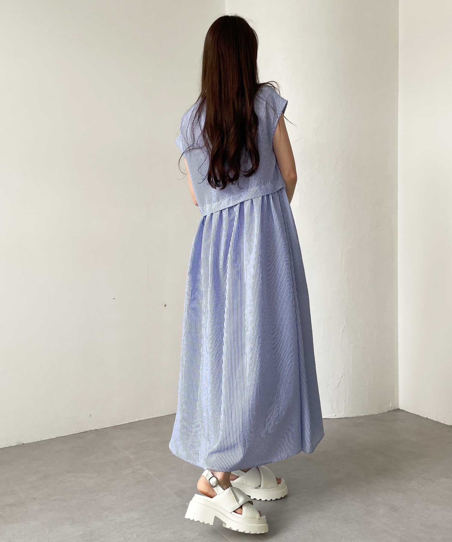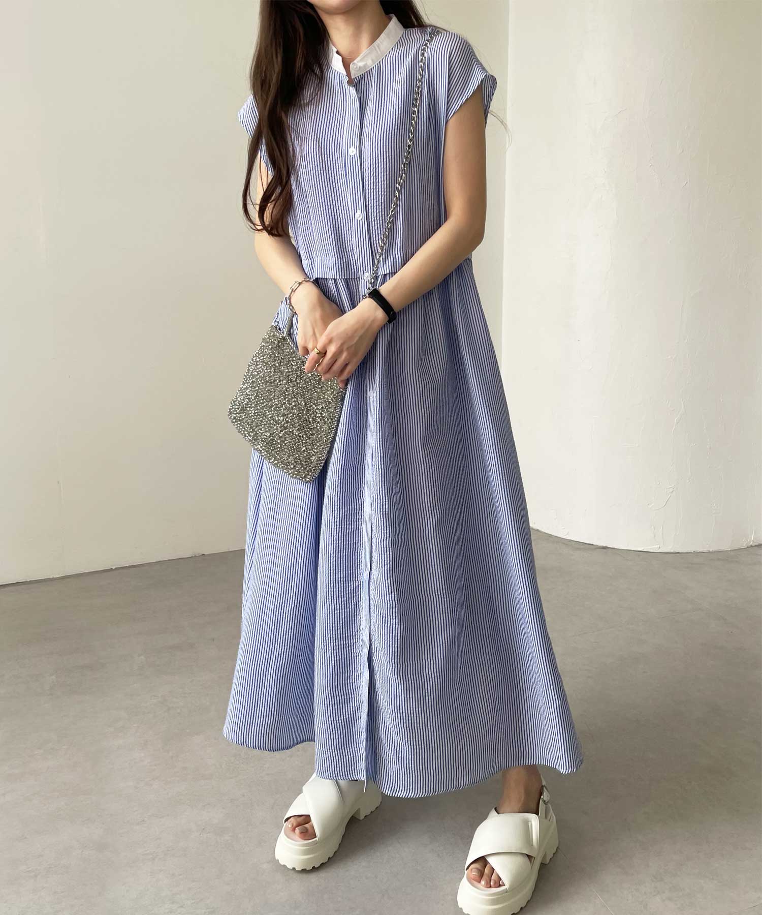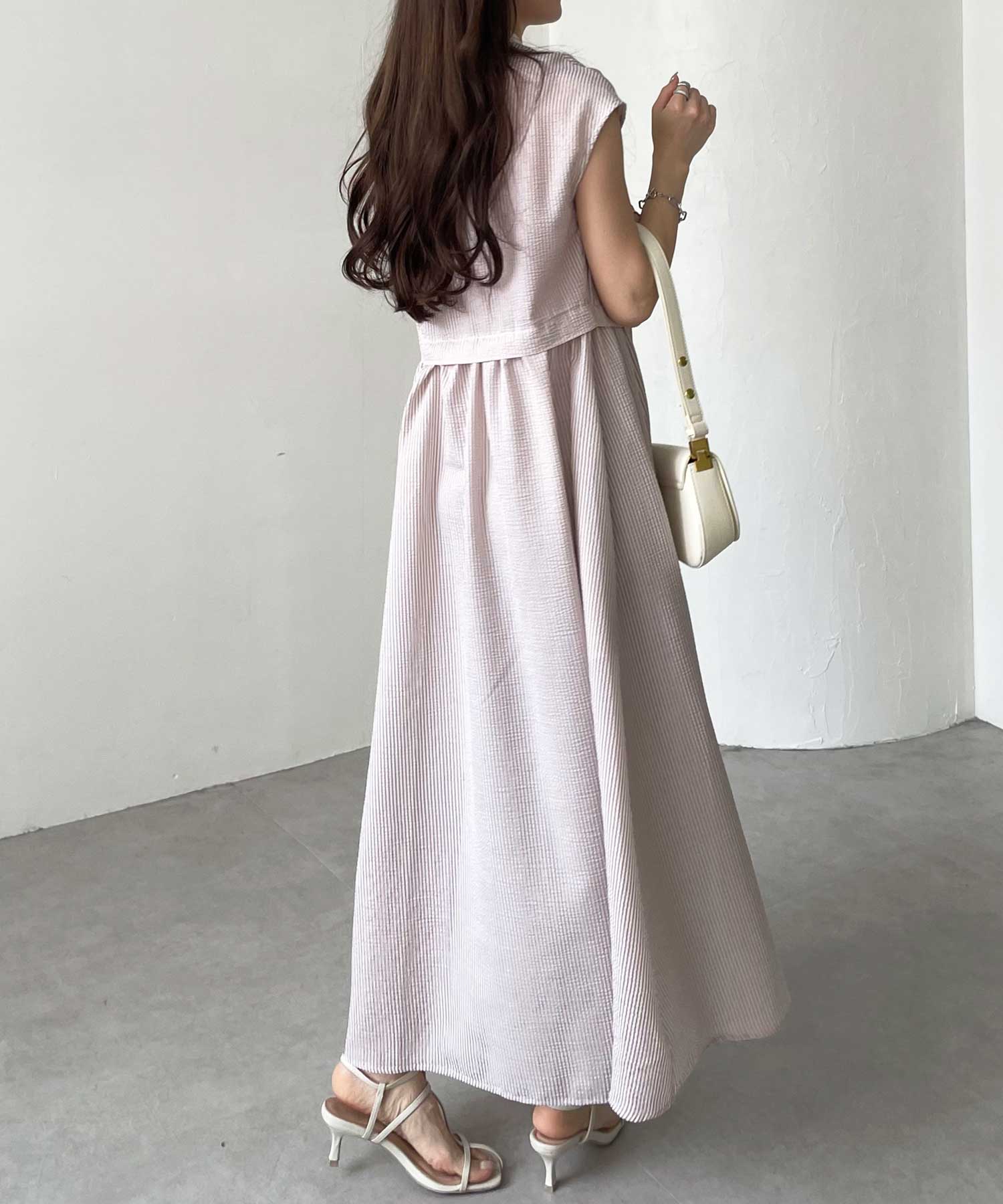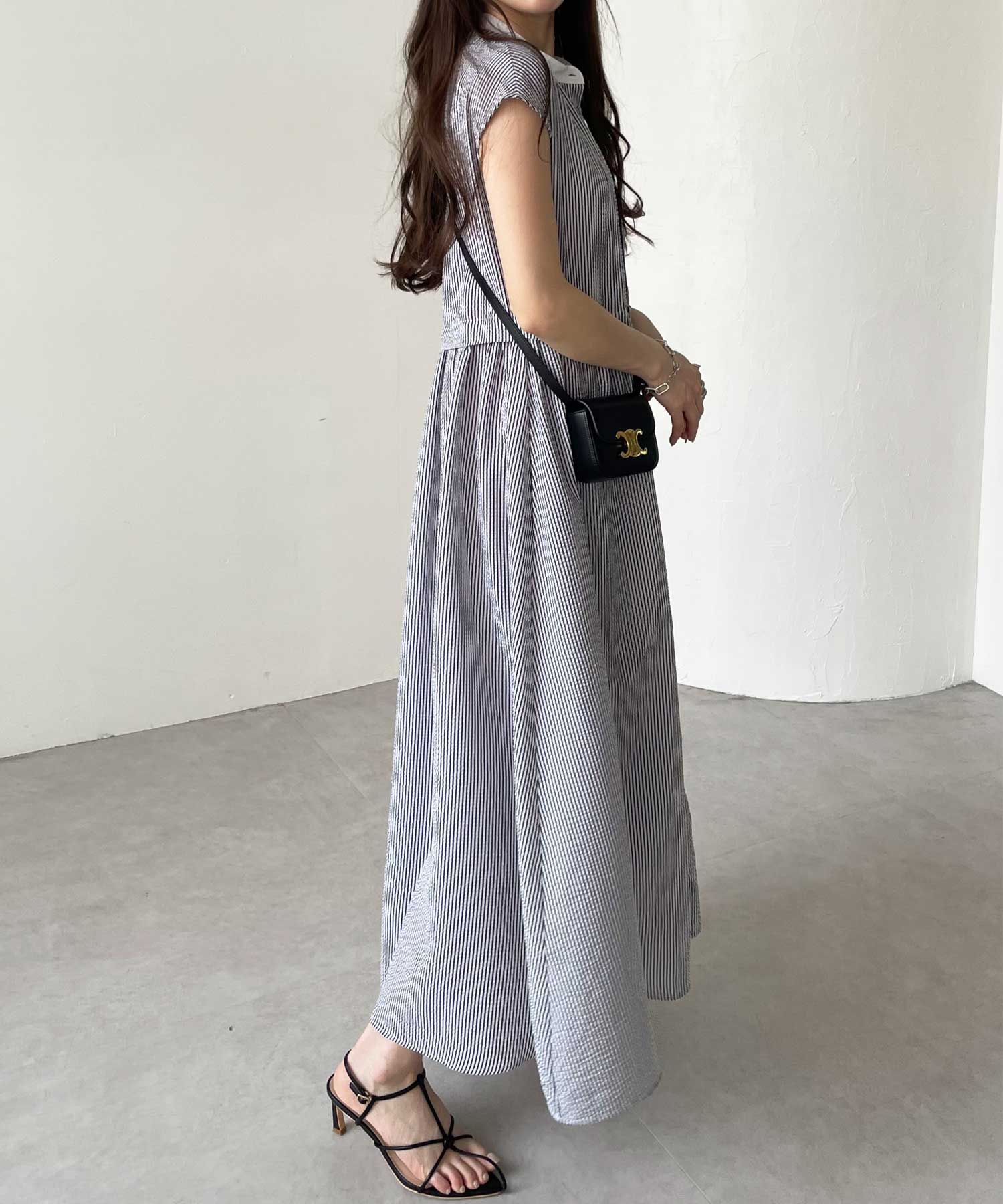 ボリュームたっぷりながらも、サッカー素材で夏らしく軽やかな印象。
