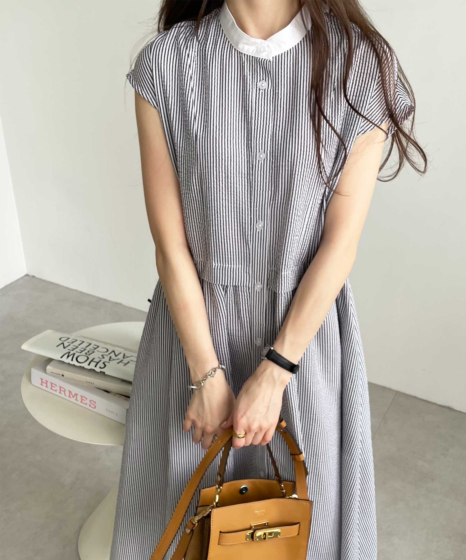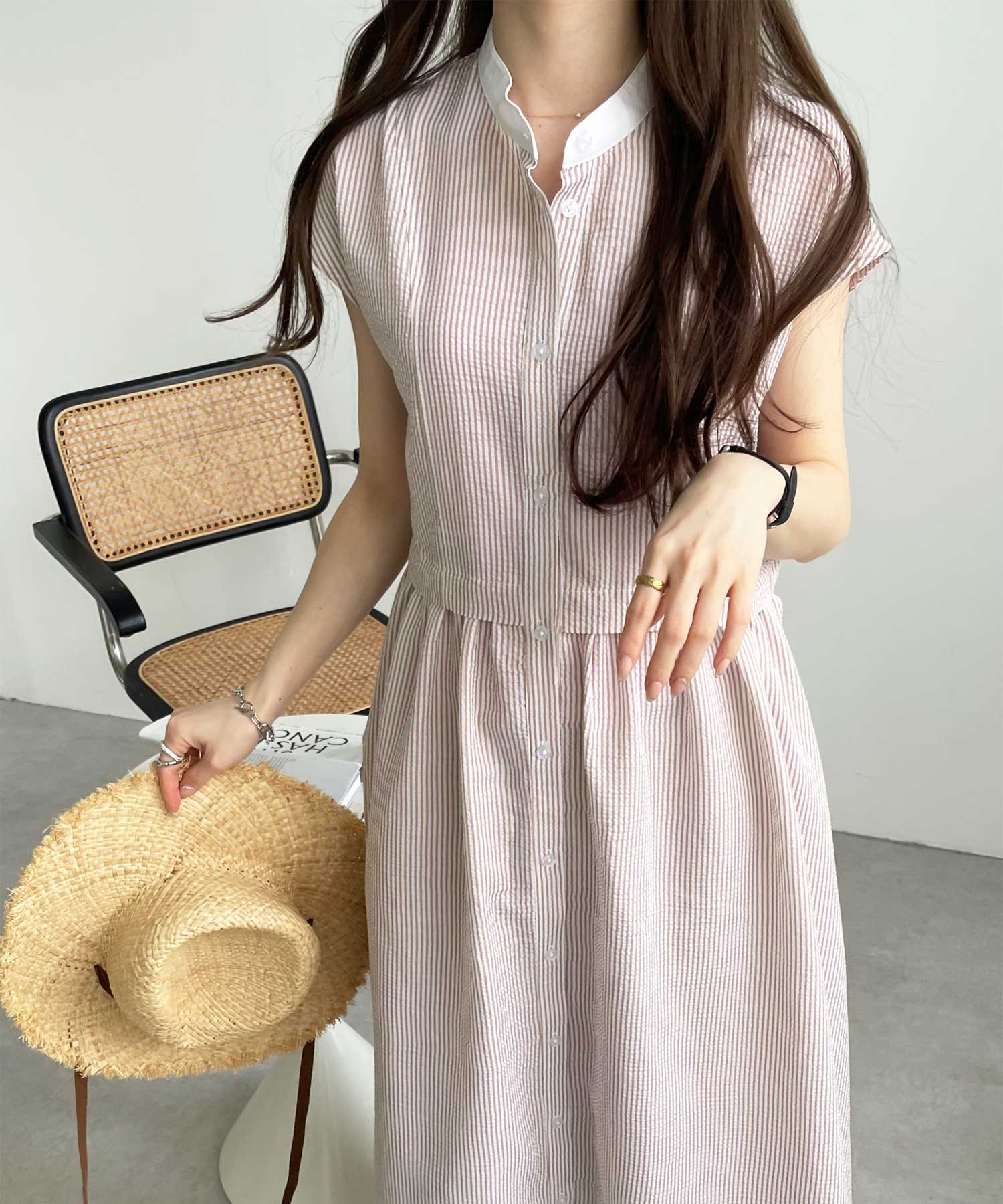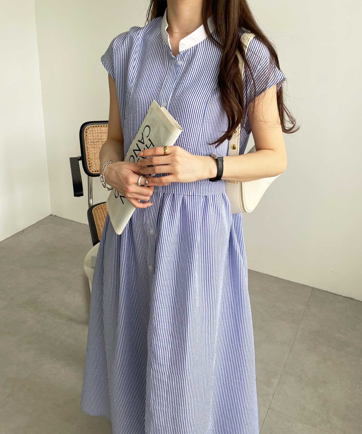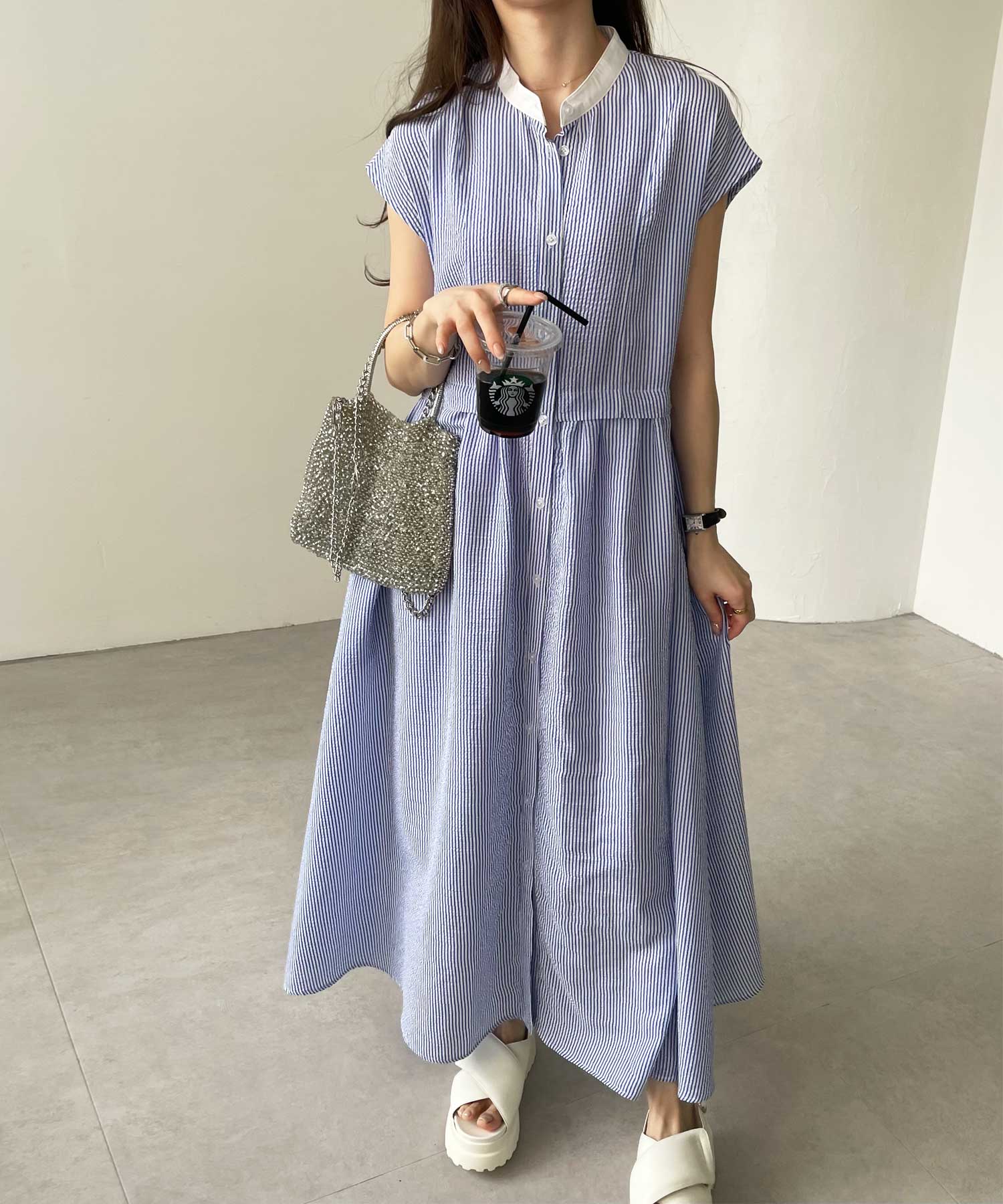 ボリュームたっぷりながらも、サッカー素材で夏らしく軽やかな印象。