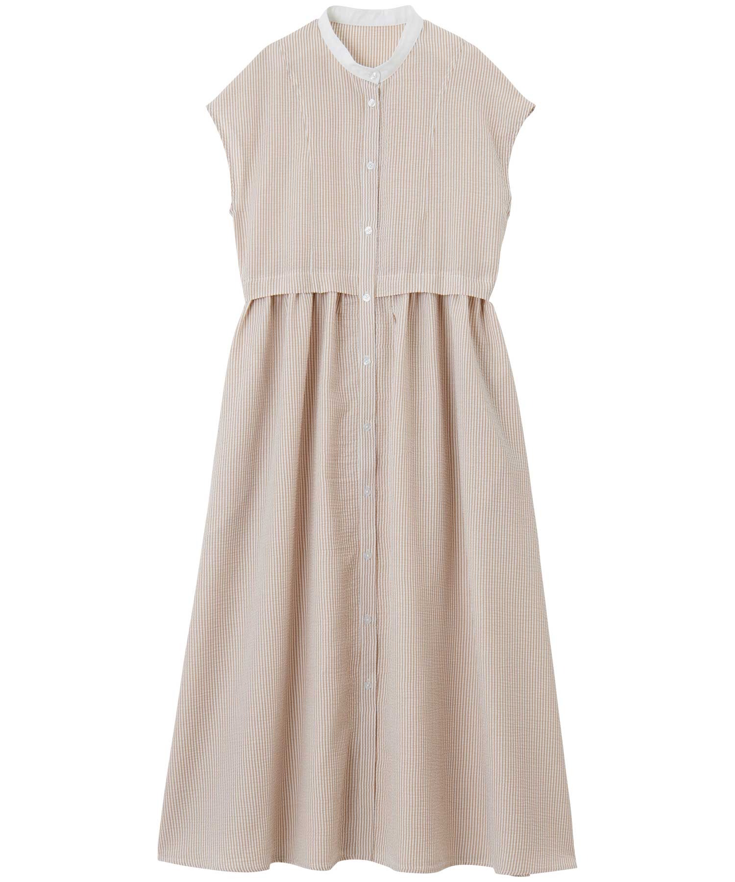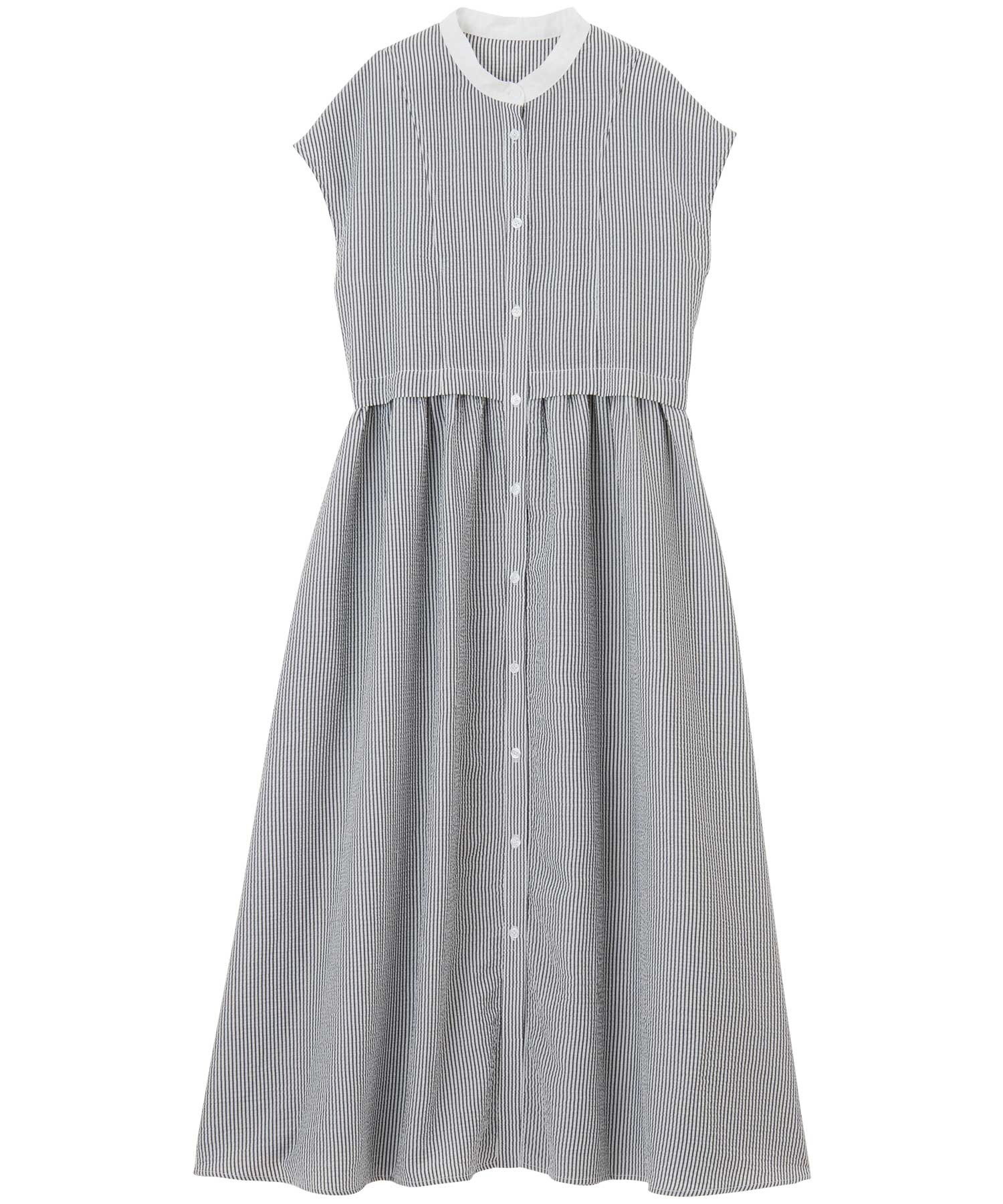 ウエストギャザー切替が印象的なシャツワンピース。