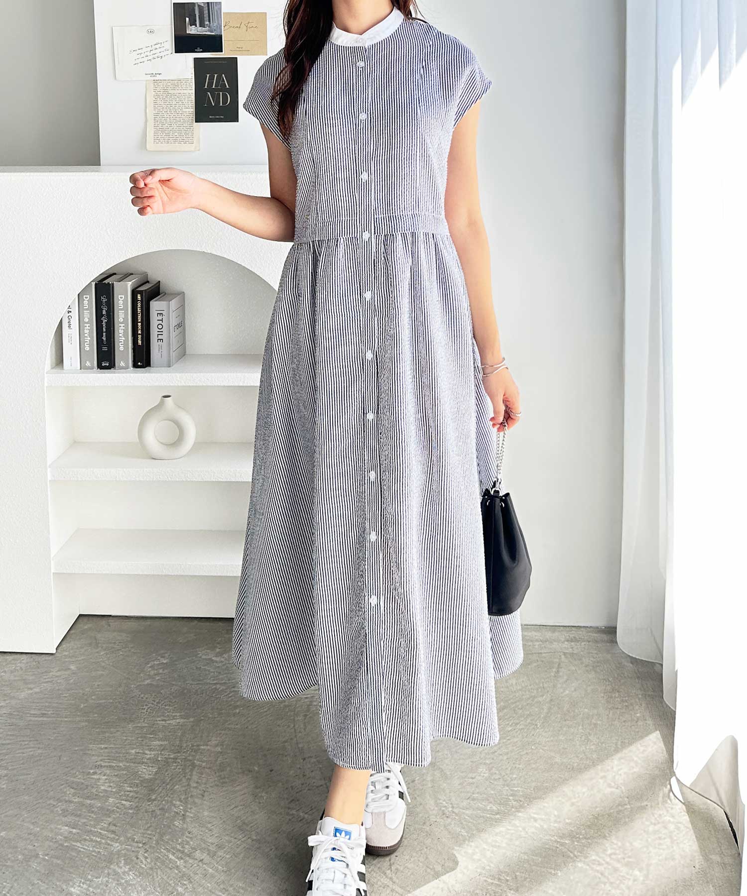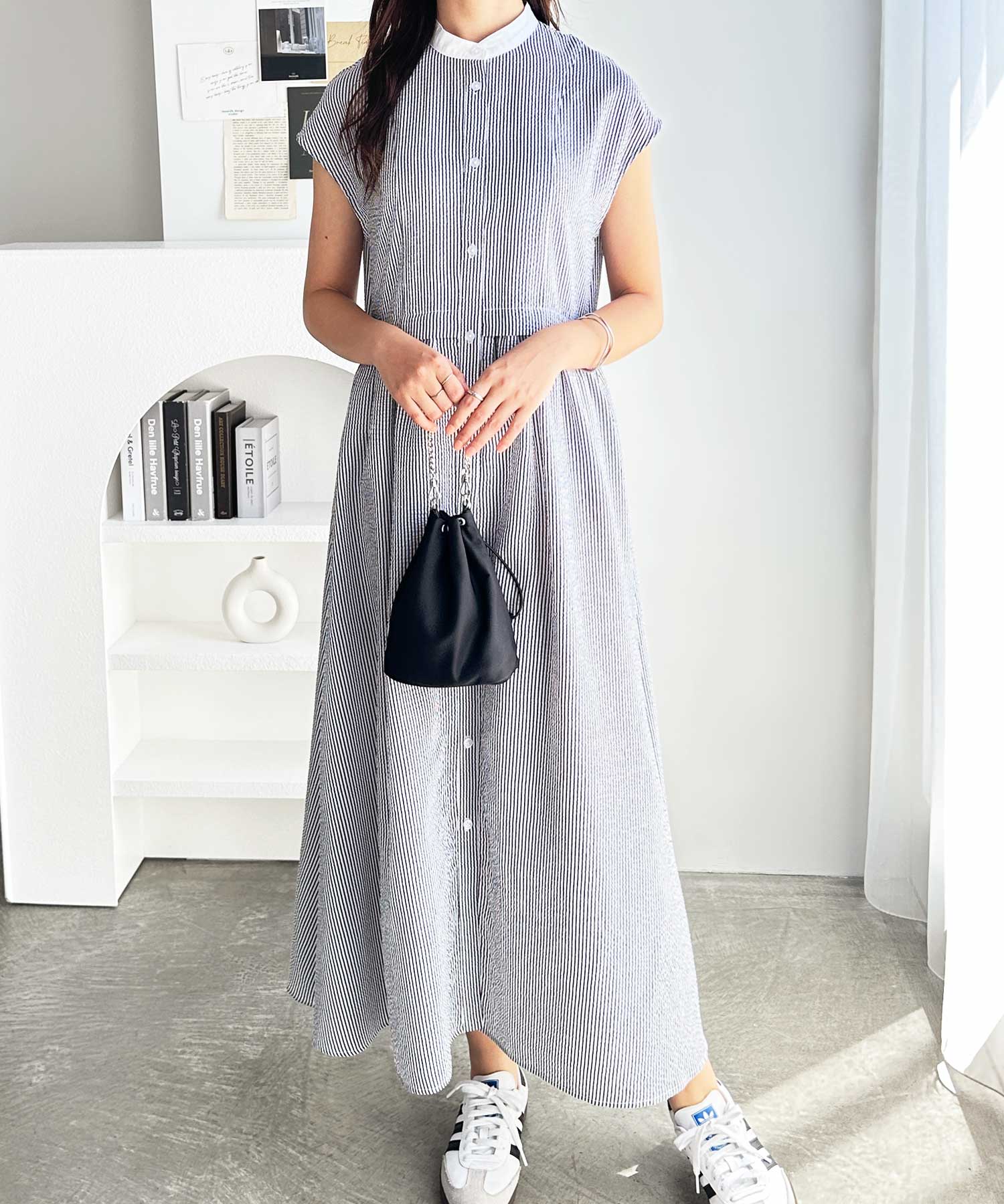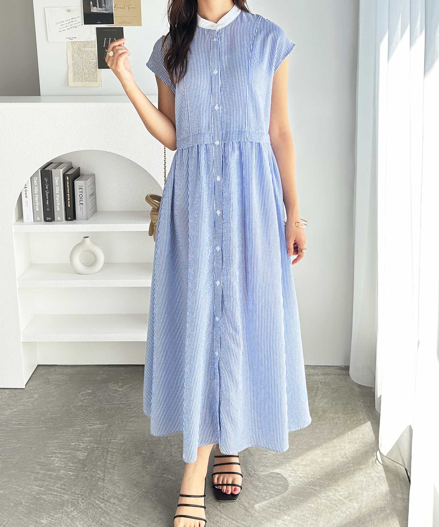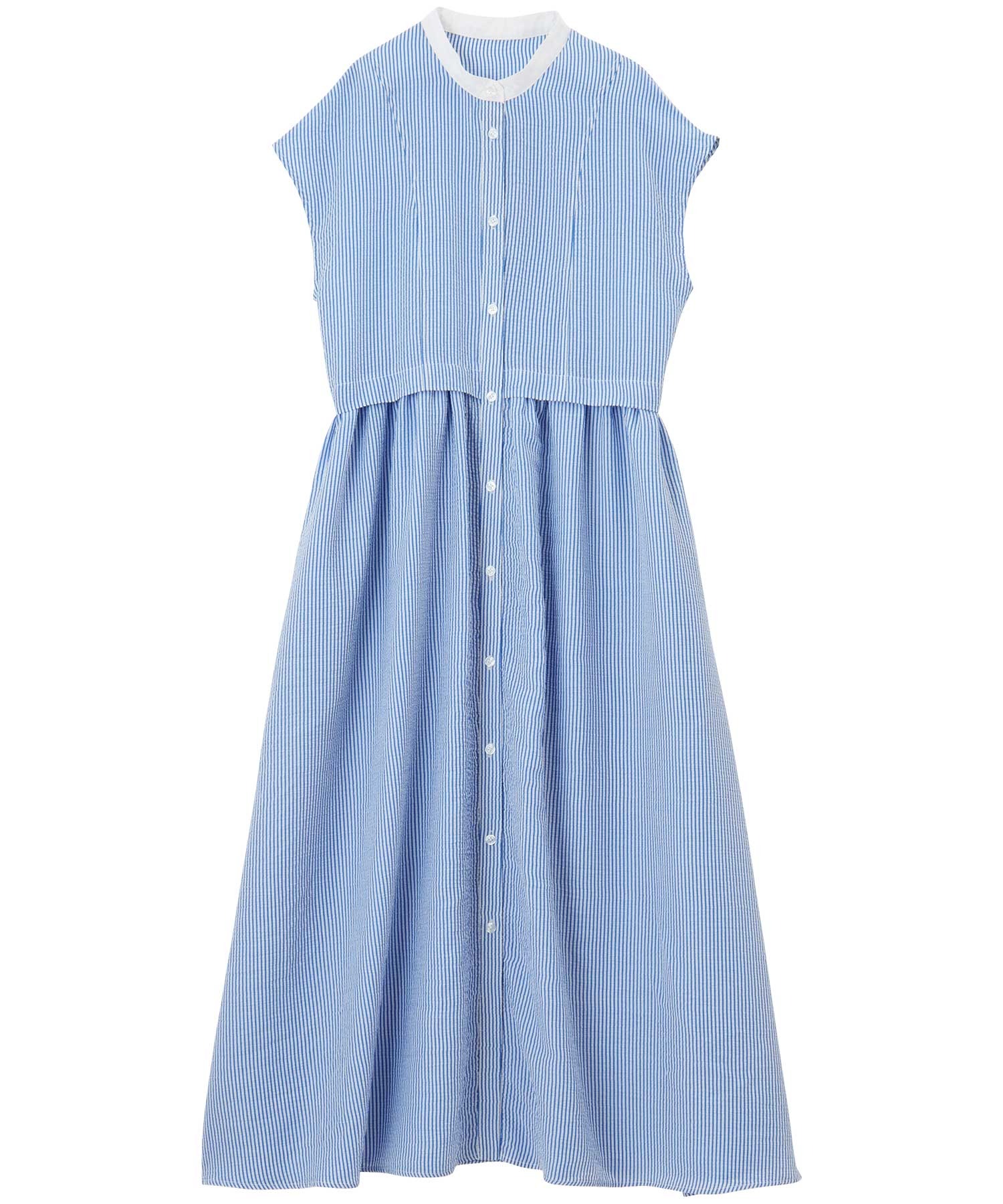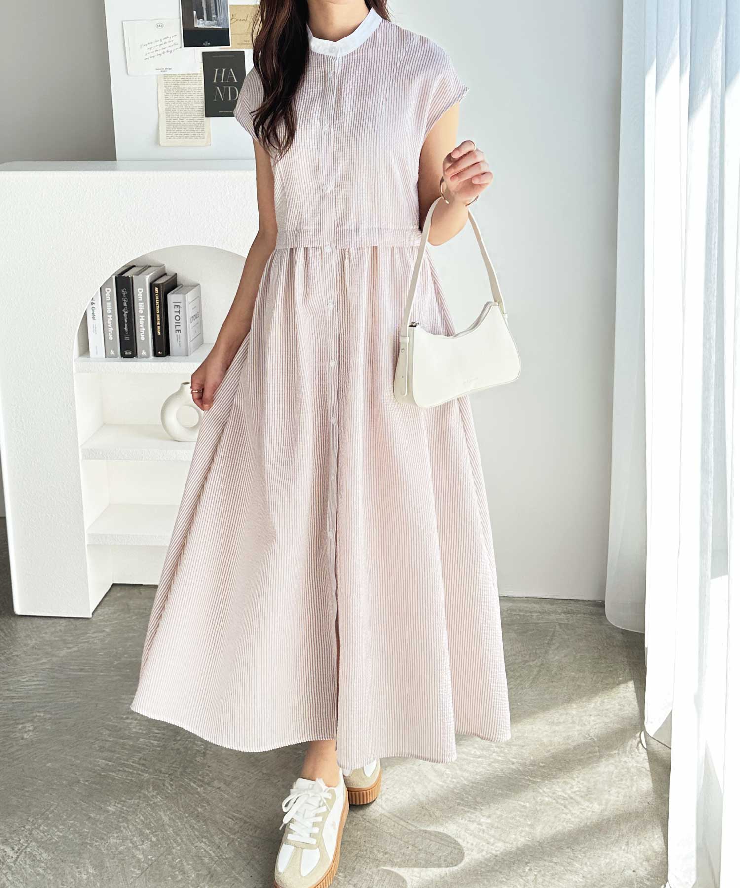 ウエストギャザーデザイン×クレリック配色でどこから見ても可愛いシャツワンピース。