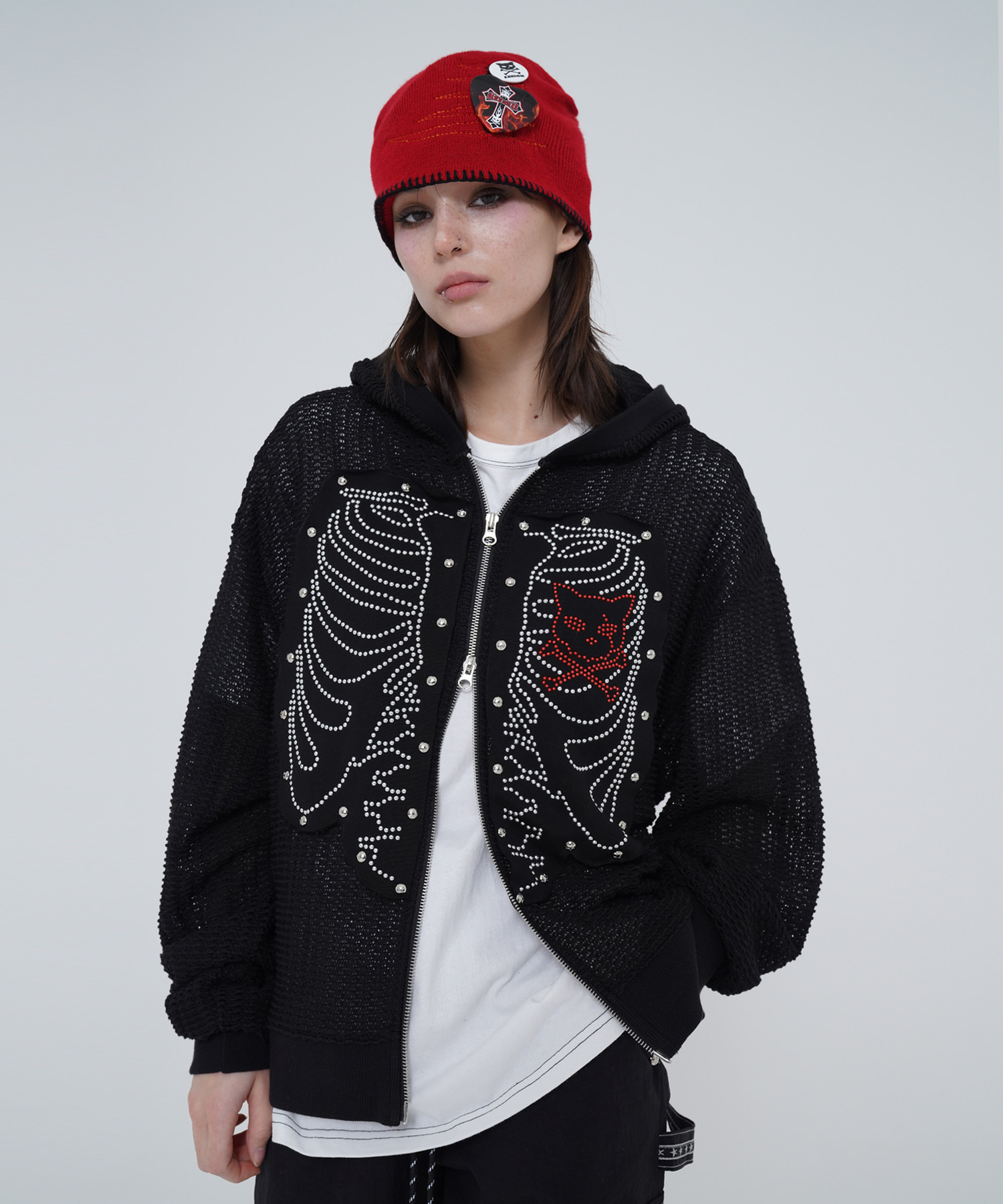 SKULL HOTFIX 2-WAY HOODIE ZIP UP - [BLACK]