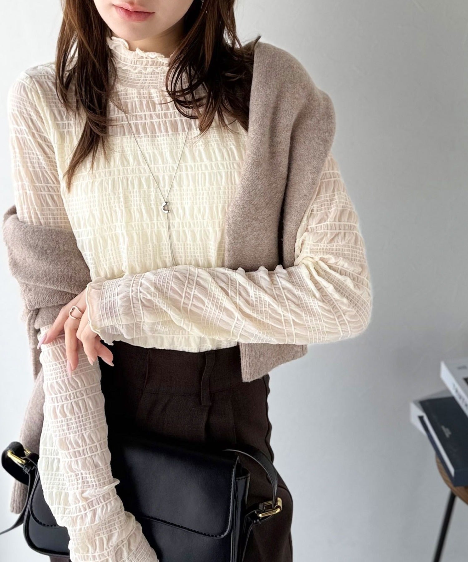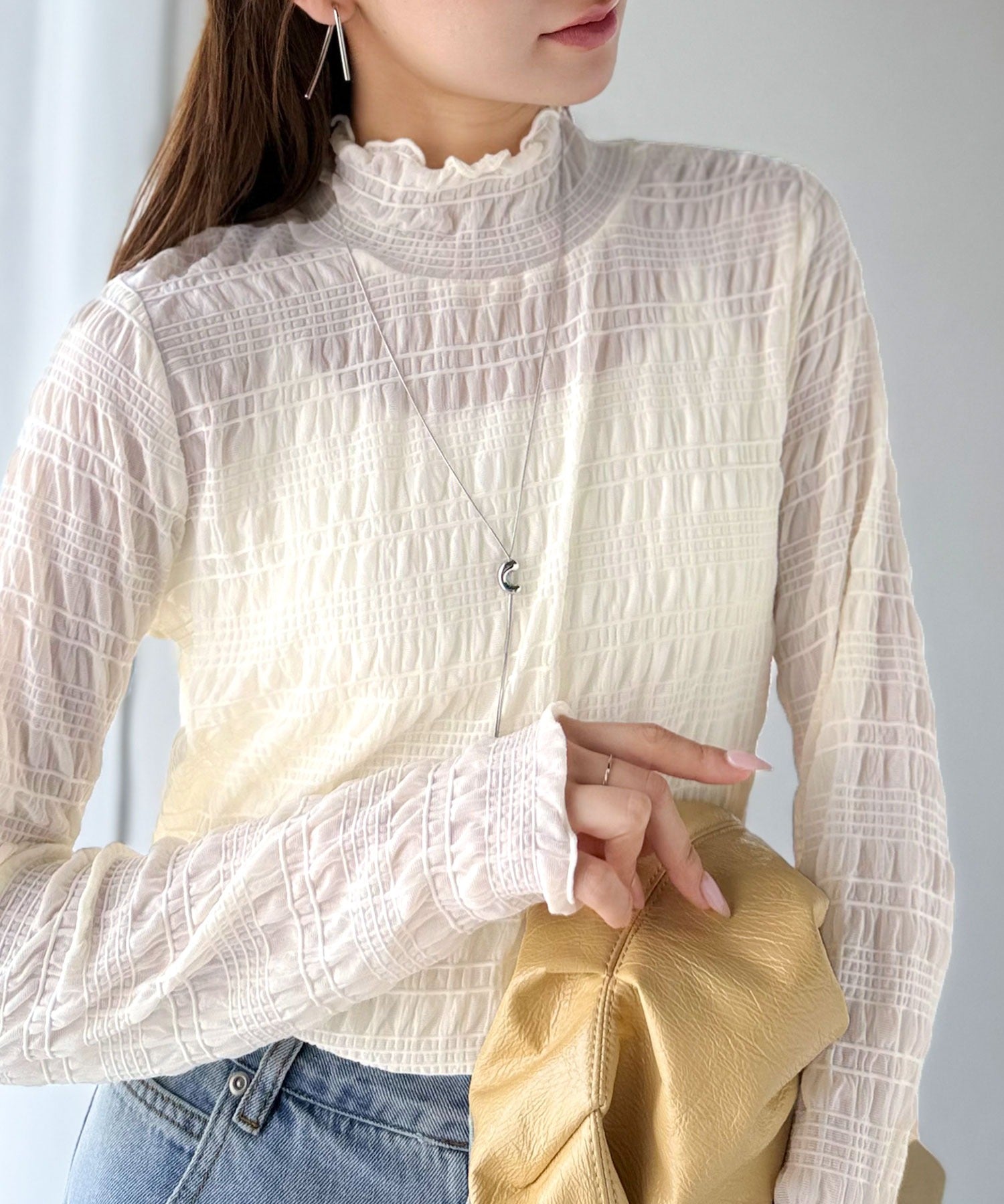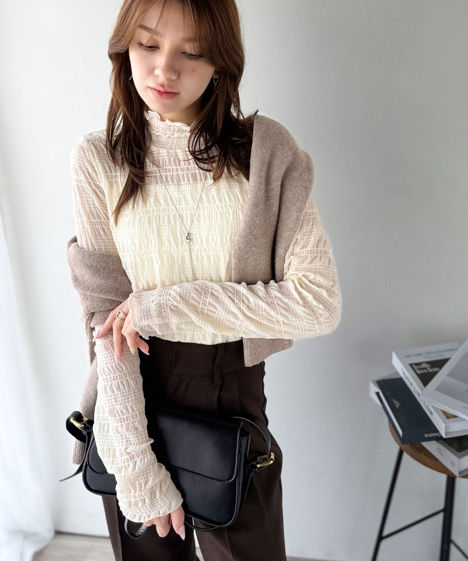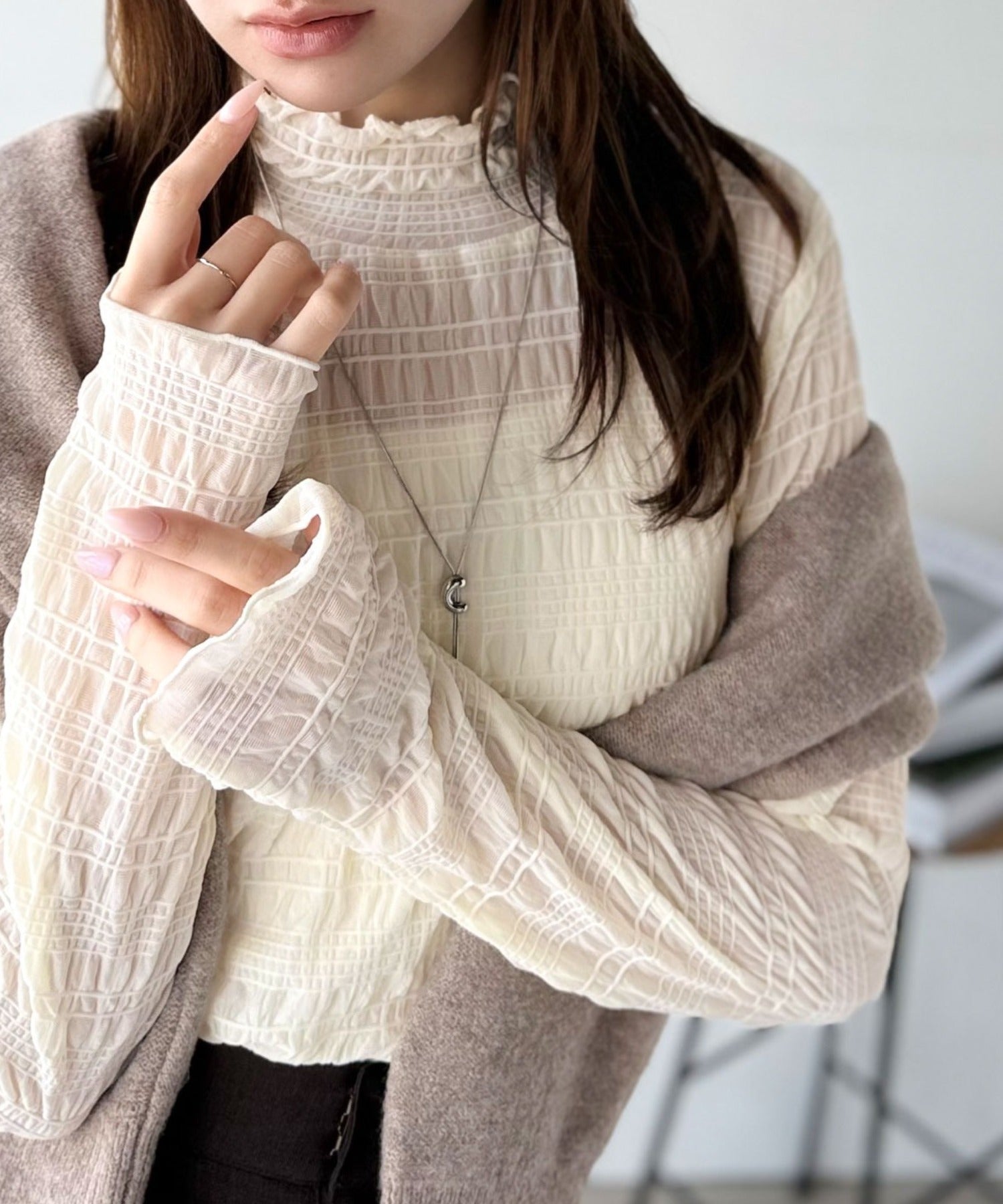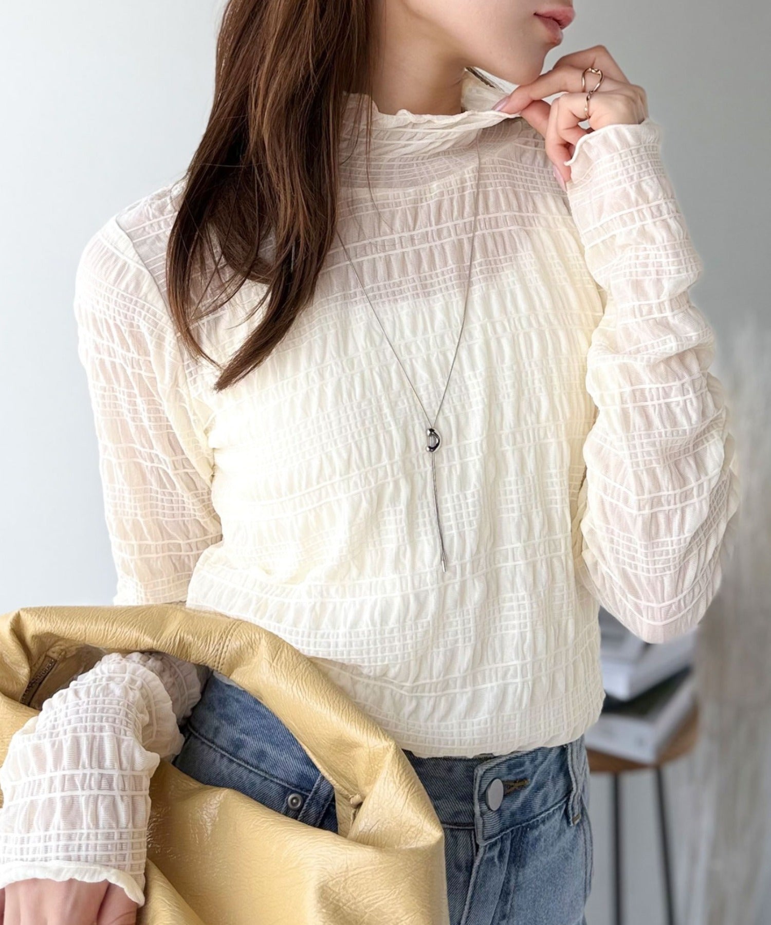 ほんのり透け感、シアー感で魅せる♪シャーリングシアーハイネックトップス(長袖) ce1010474
