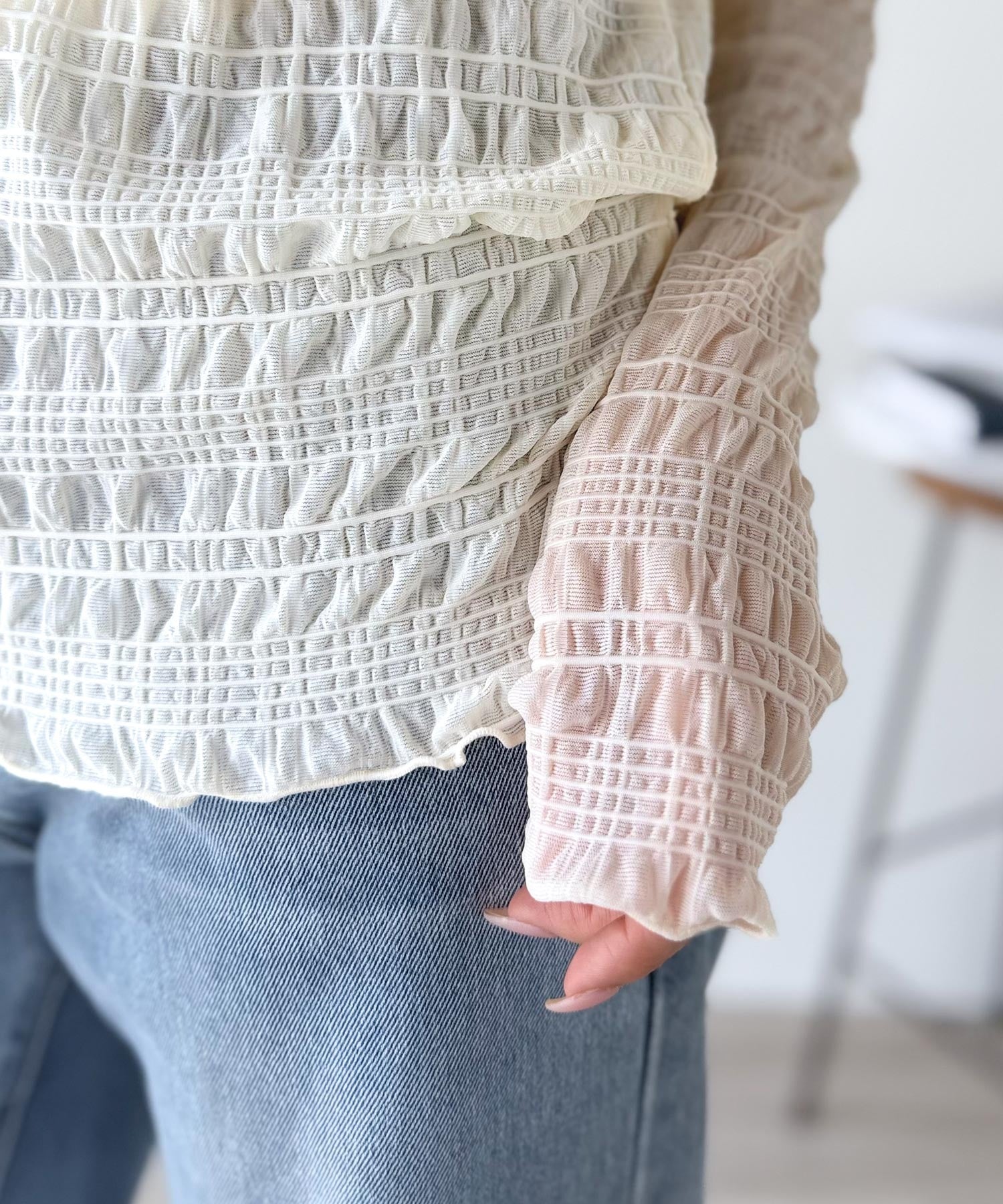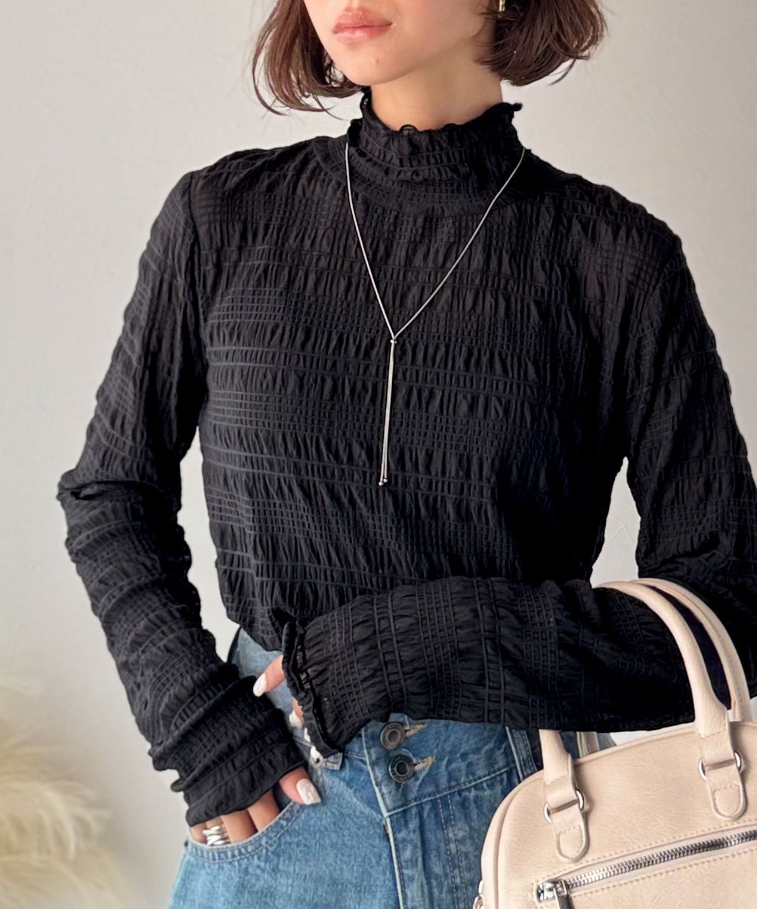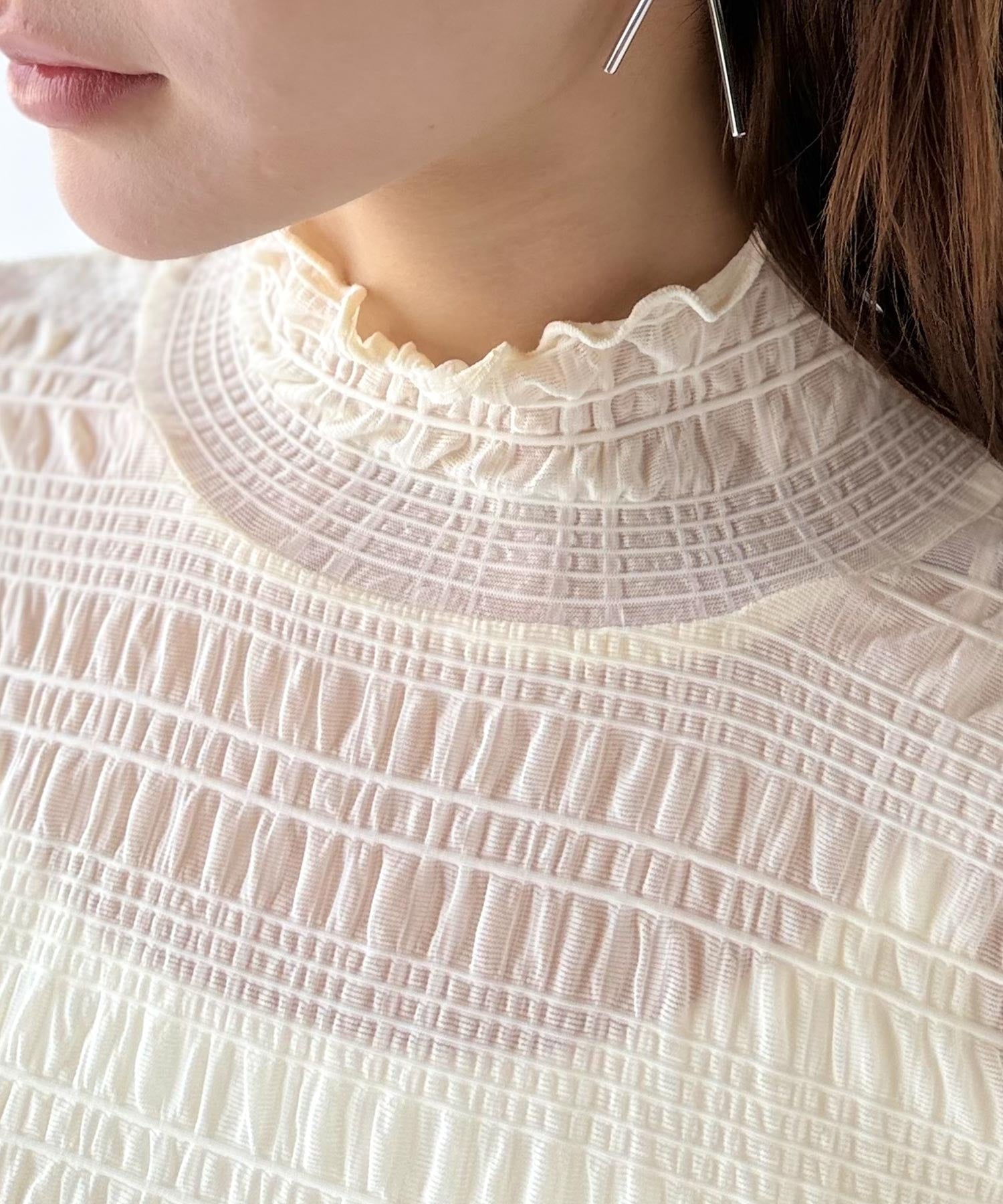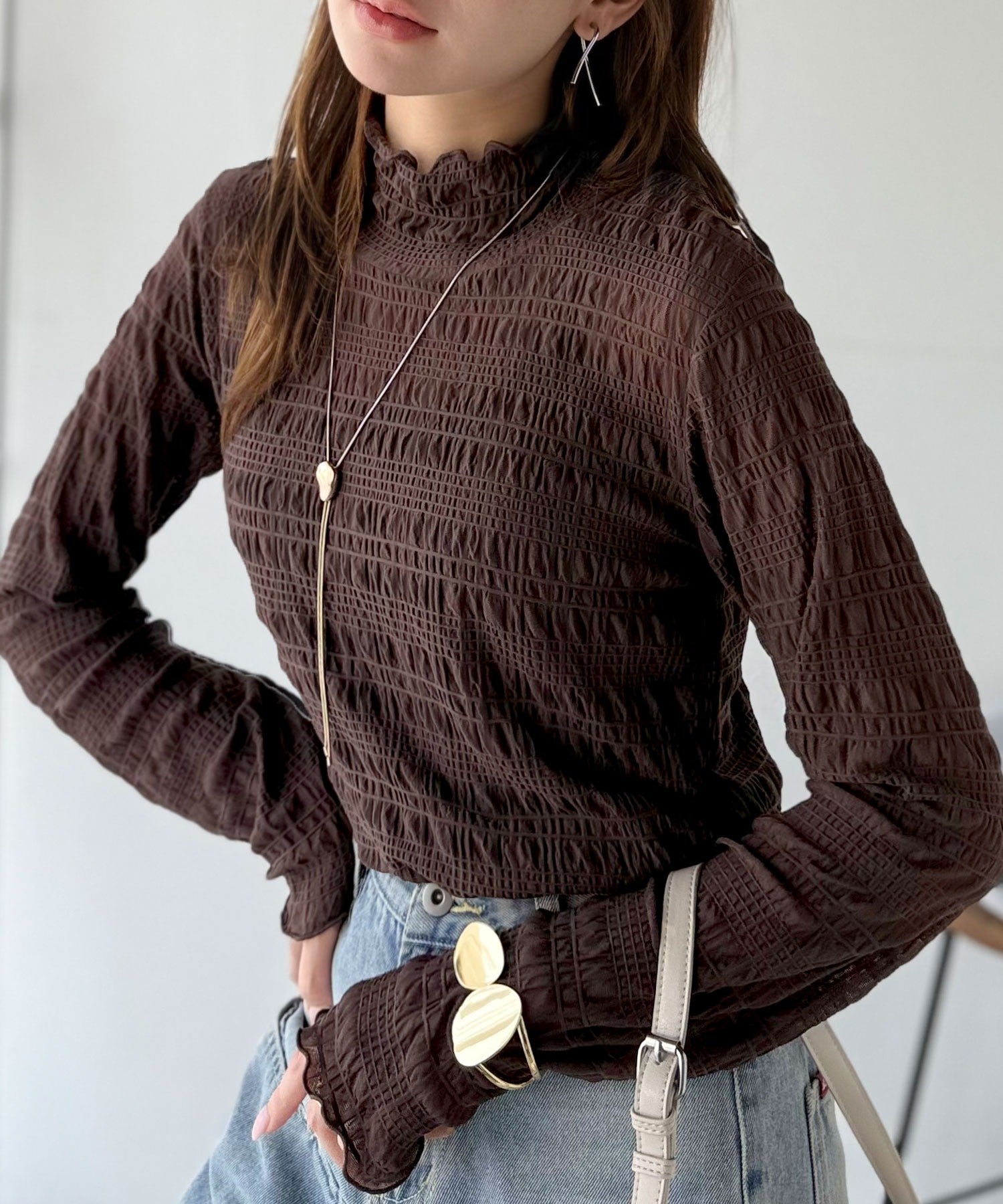 ほんのり透け感、シアー感で魅せる♪シャーリングシアーハイネックトップス(長袖) ce1010474